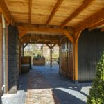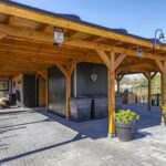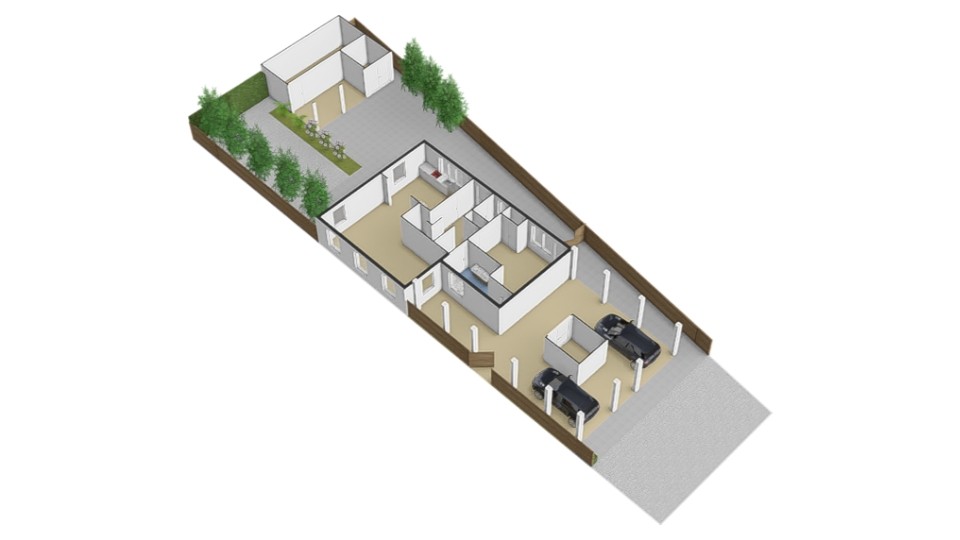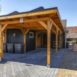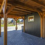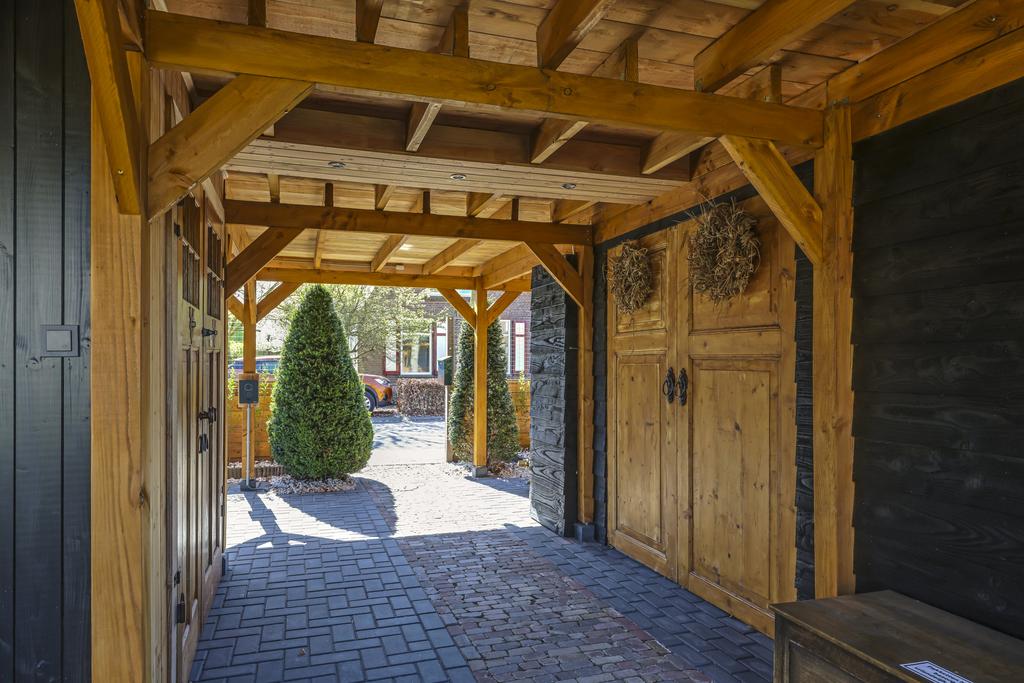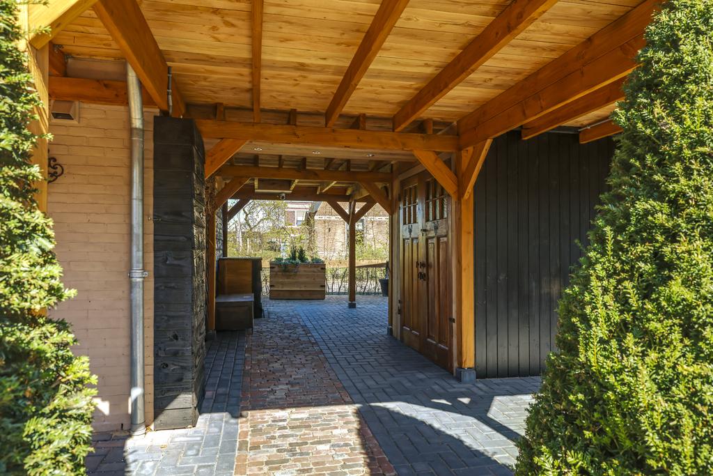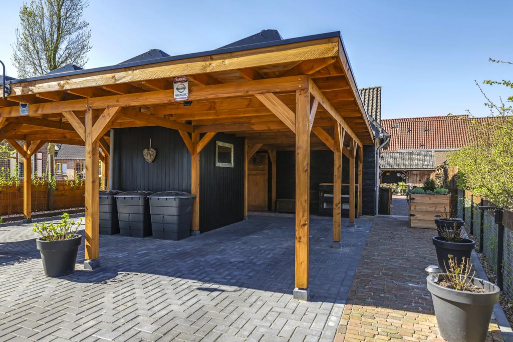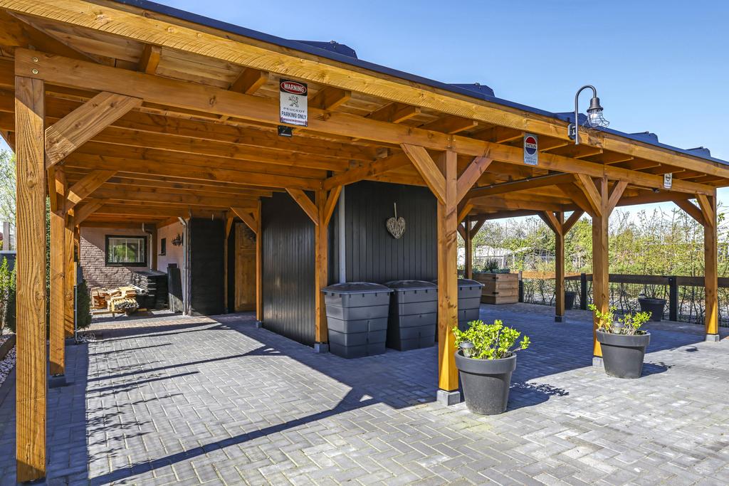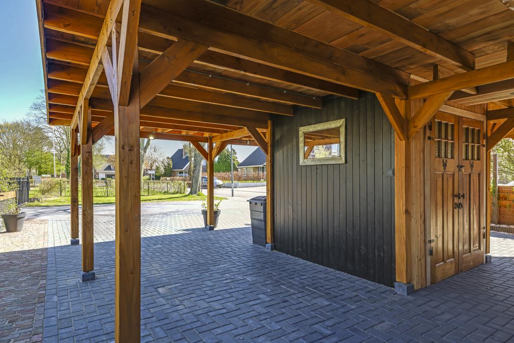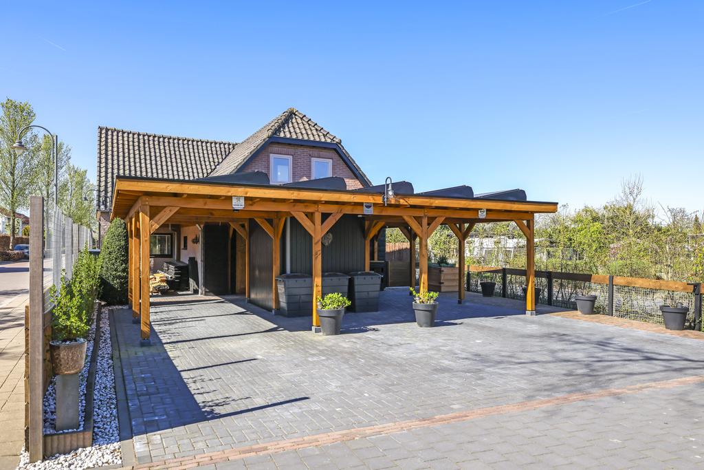 Aan de zijkant van de woning is de oprit en een riante carport gelegen. Deze carport is groter dan gemiddeld waardoor je er zelfs 5 (!) auto’s onder zou kunnen plaatsen. Je staat elkaar niet in de weg omdat er niet achter elkaar geparkeerd hoeft te worden. In het midden van de carport is een extra berging geplaatst. Ideaal voor bijvoorbeeld het stallen van de fietsen. Op het platte dak zijn de zonnepanelen geplaatst waardoor deze niet opvallend in het zicht liggen. Diverse verlichting zorgt ervoor dat de ruimte fijn verlicht wordt. De laadpaal blijft achter bij de woning.