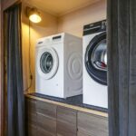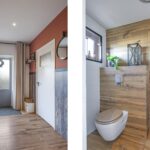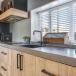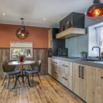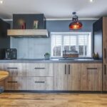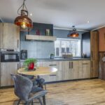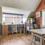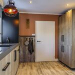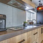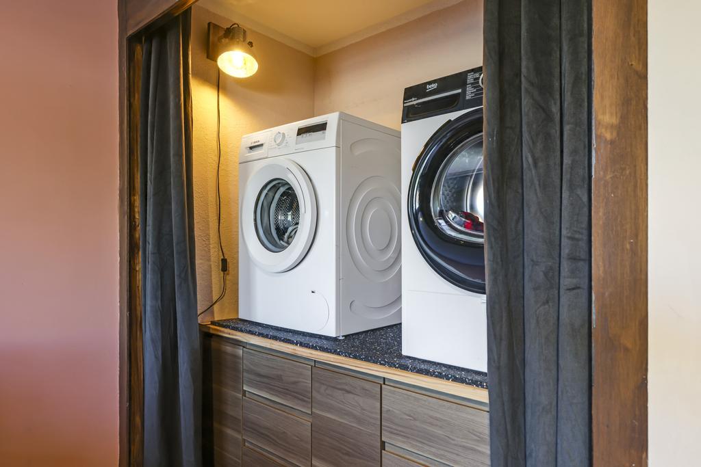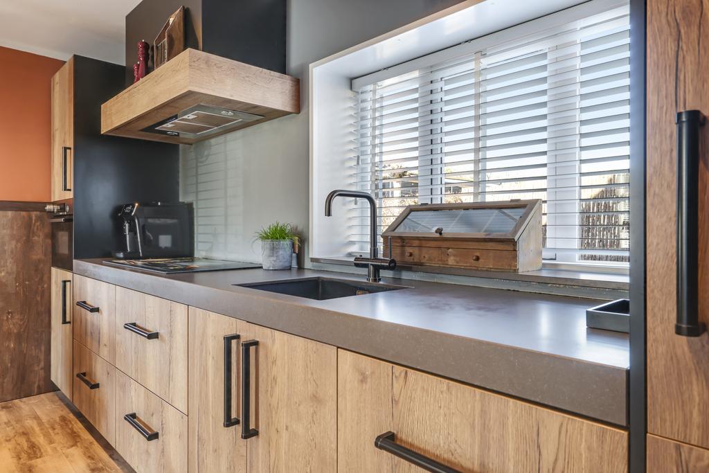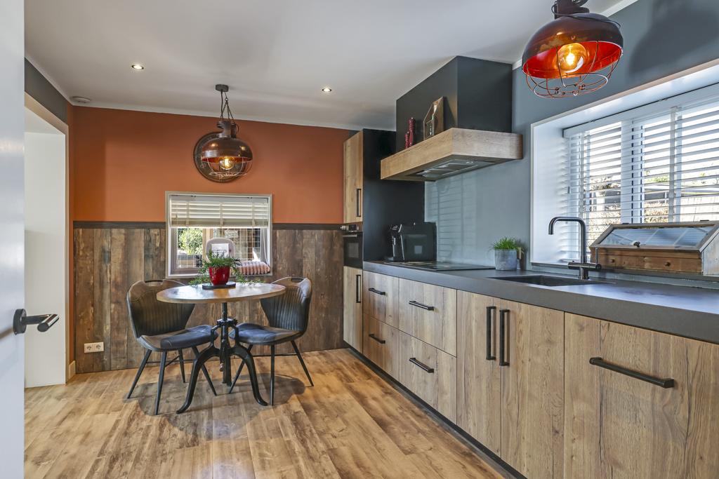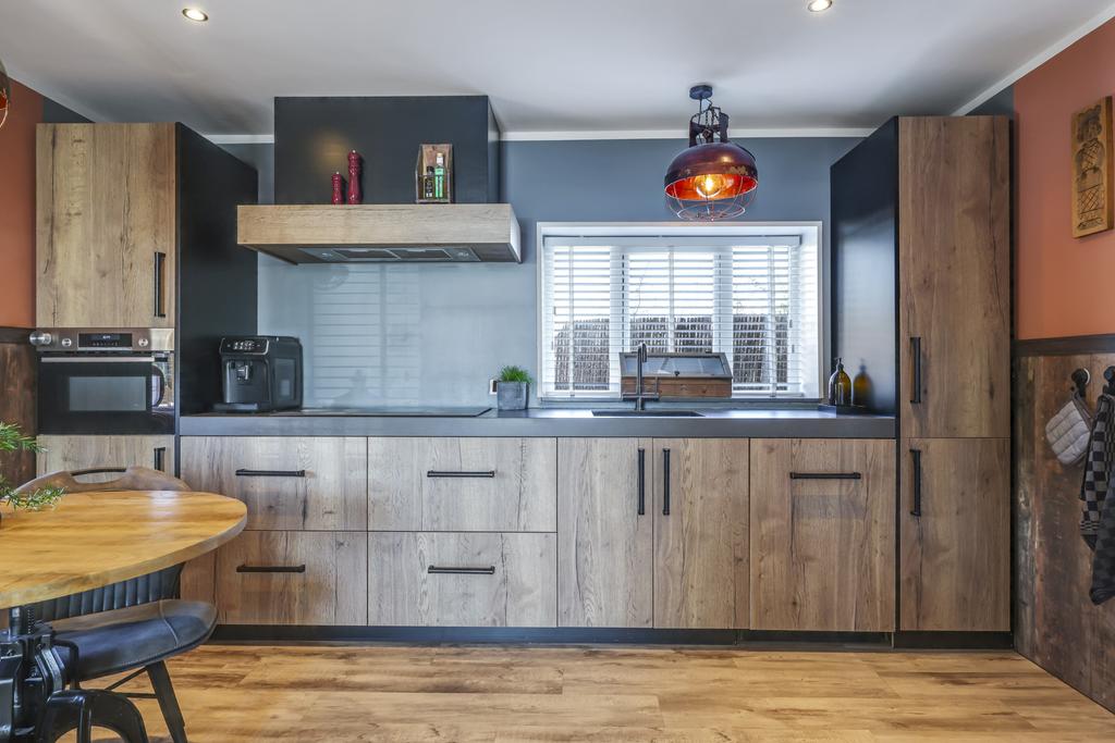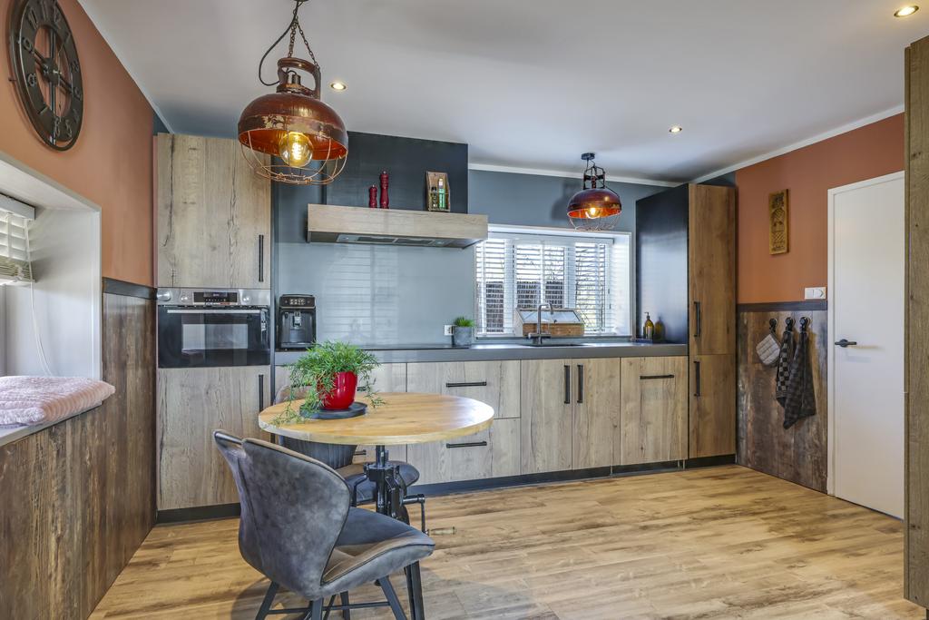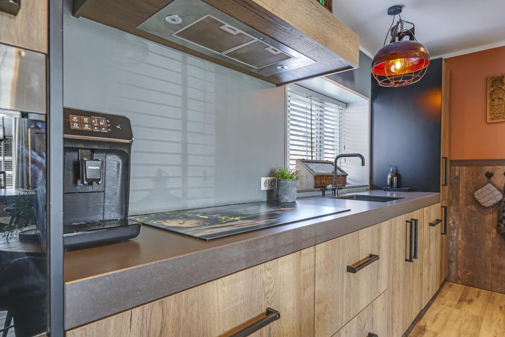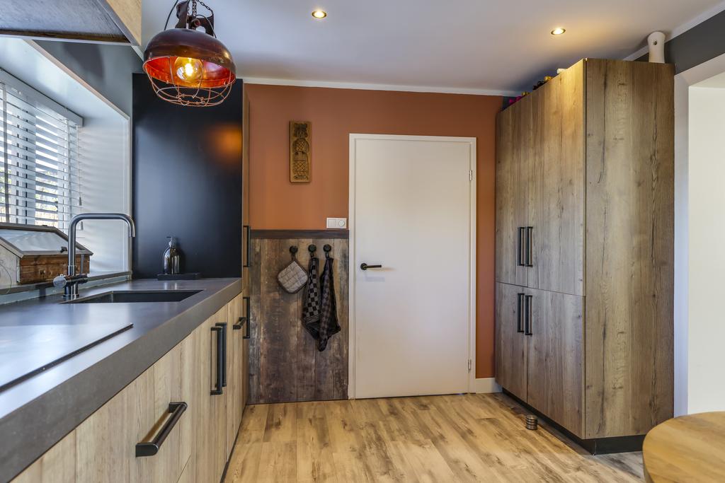 Bij deze woning hoort een ruim opgezette, moderne keuken. Door de ruime indeling heb je hier tevens plaats voor een 2e eethoek of bijvoorbeeld een ontbijtbar. Het keukenblok is in 2 delen recht tegenover elkaar geplaatst. De houtlook fronten met zwarte, brede grepen passen goed bij het dikke betonlook werkblad. Alle wenselijke inbouwapparatuur is tevens aanwezig. Zijnde een 5-pits inductiekookplaat, een koelkast, een vriezer, een vaatwasser, een combi-oven en een afzuigschouw. De Quooker zorgt voor direct kokend water uit de kraan. Spotverlichting maakt het geheel helemaal af.