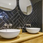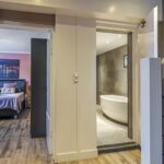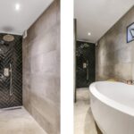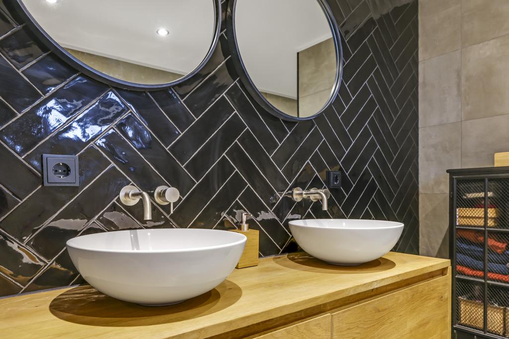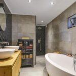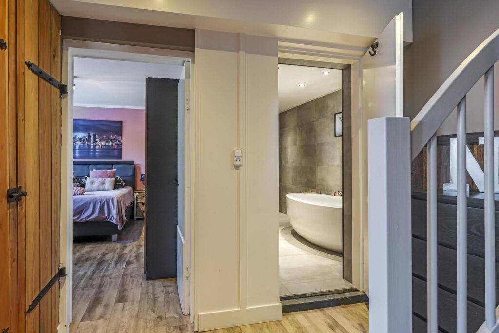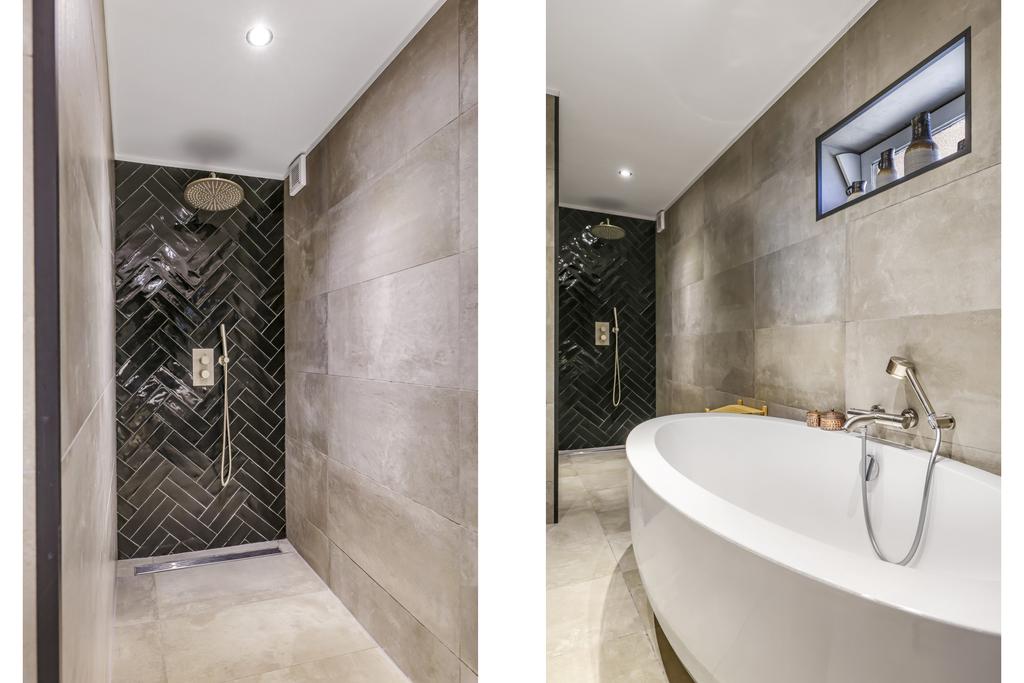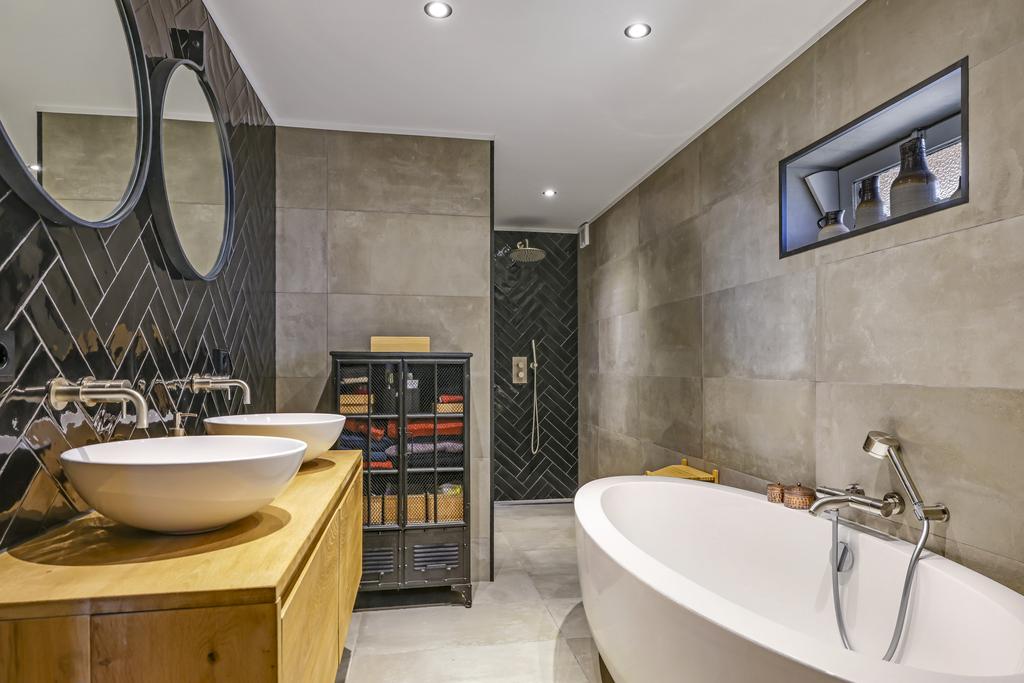 Naast de slaapkamer is direct de badkamer gelegen. De ruimte is zeer luxe ingericht met onder meer een vrijstaand ligbad en een brede inloopdouche. Het houten wastafelmeubel is voorzien van 2 waskommen en opbergruimte. Opvallend is dat zowel in de douche als bij de wastafelkranen het leidingwerk achter de tegels is verstopt. In het gestucte plafond is spotverlichting verwerkt. Ventileren kan middels het hooggeplaatste raam en de mechanische afzuiging.