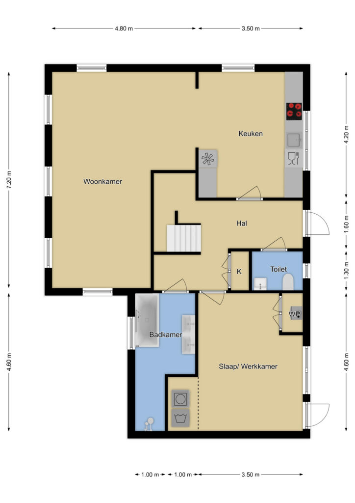 Met een inpandige breedtemaat van 7,2 (!) meter is deze woonkamer breder dan de gemiddelde woning. Hierdoor kun je er met gemak grote meubelstukken zoals een grote hoekbank kwijt zonder dat het direct ten koste gaat van het ruimtelijke gevoel, hetgeen nog eens wordt versterkt door de raampartijen aan 3 zijden van de kamer. Door de aanwezige vloerverwarming staan er ook geen radiatoren in de weg bij het inrichten van de ruimte. In de overgang naar de open keuken is er plaats voor een lange eettafel. Het plafond en de wanden zijn voorzien van stucwerk wat de ruimte een moderne uitstraling geeft.
