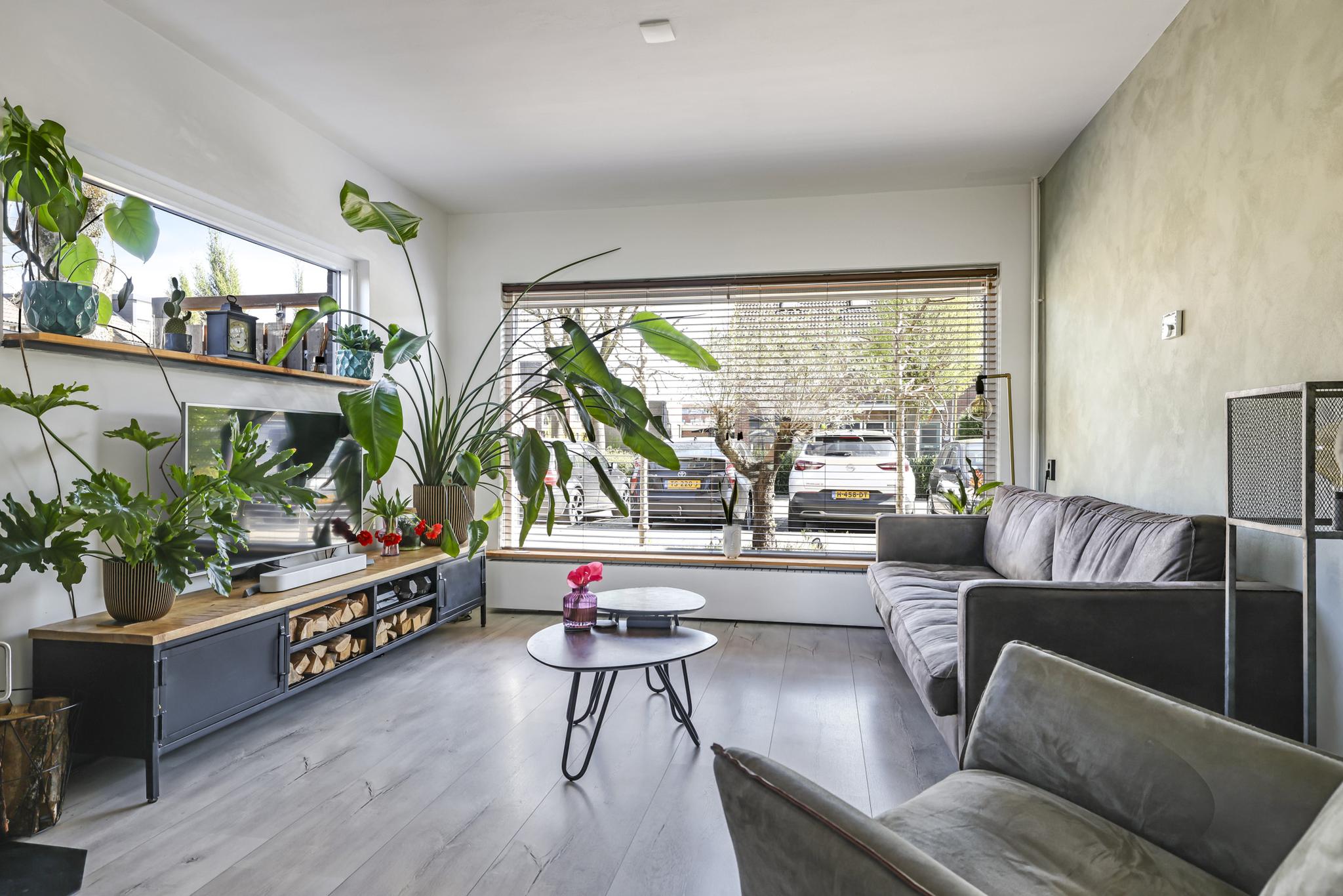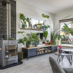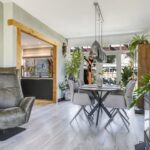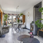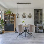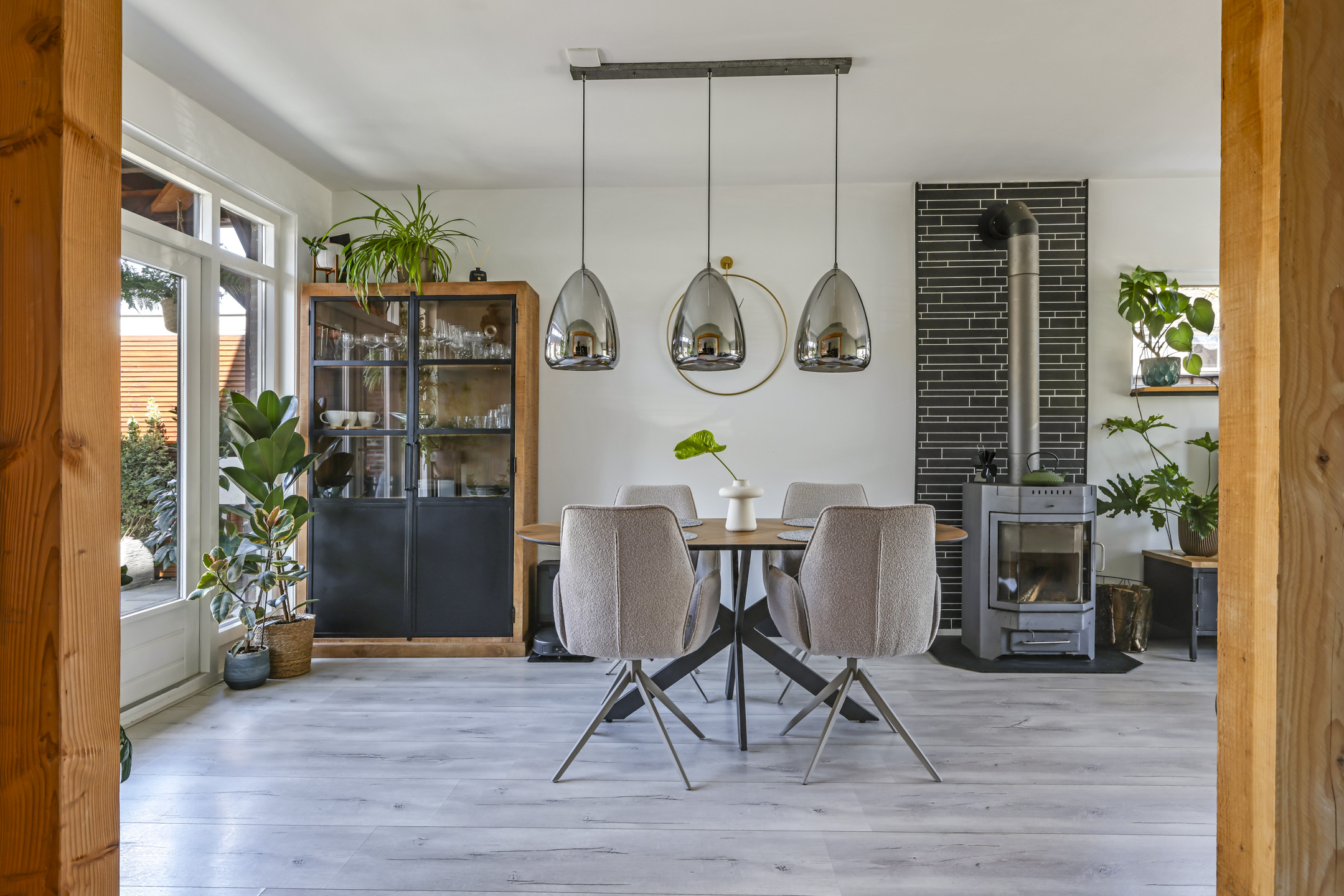Deze woonkamer geniet van opvallend veel lichtinval. Niet alleen om het een ware doorzonwoning betreft. Door de hoekligging is er ook nog een groot zijgevelraam aanwezig. De houtkachel zorgt voor een heerlijke warmte en gezelligheid in de winterdag. Er is gekozen voor een laminaatvloer met brede planken wat zorgt voor een ruimtelijk en luxe gevoel. De wanden en het plafond zijn verzorgd afgewerkt. Een pluspunt zijn de openslaande tuindeuren waardoor je in de zomerdag de tuin en woonkamer fijn bij elkaar kan betrekken.