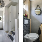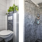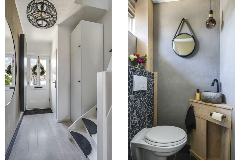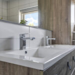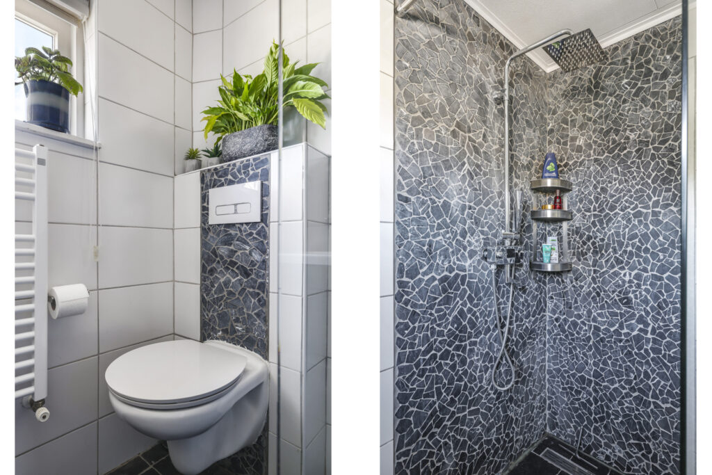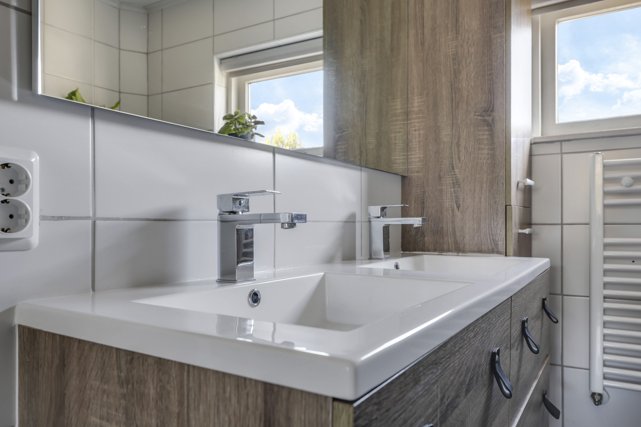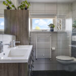 Net als de keuken heeft ook de badkamer een moderne en tijdloze uitstraling. Dit komt doordat er een combinatie is van verschillende tegels is toegepast. Het toegepaste sanitair is helemaal van deze tijd met o.a. een rainshower en separate handdouche in de inloopdouche, een breed 2-persoons wastafelmeubel met ladekorven en een hoge toiletkast. Net als in de hal is ook hier het 2e toilet zwevend geplaatst (wandcloset). Een handdoekradiator maakt de badkamer compleet. En niet te vergeten de inbouwspots in het plafond die voor sfeerverlichting zorgen. Erg praktisch is het uitzetraam dat niet alleen voor daglicht zorgt, maar ook voor de ideale ventilatiemogelijkheid.
