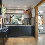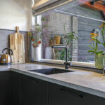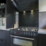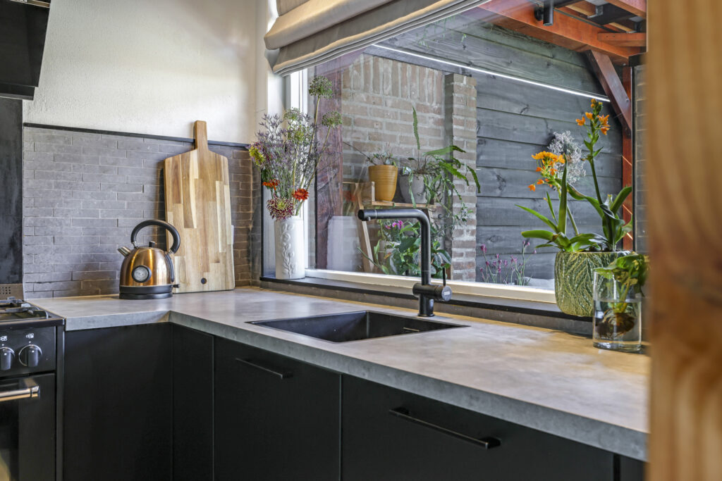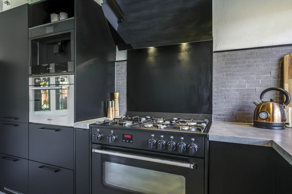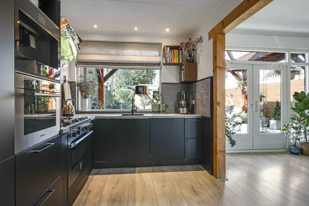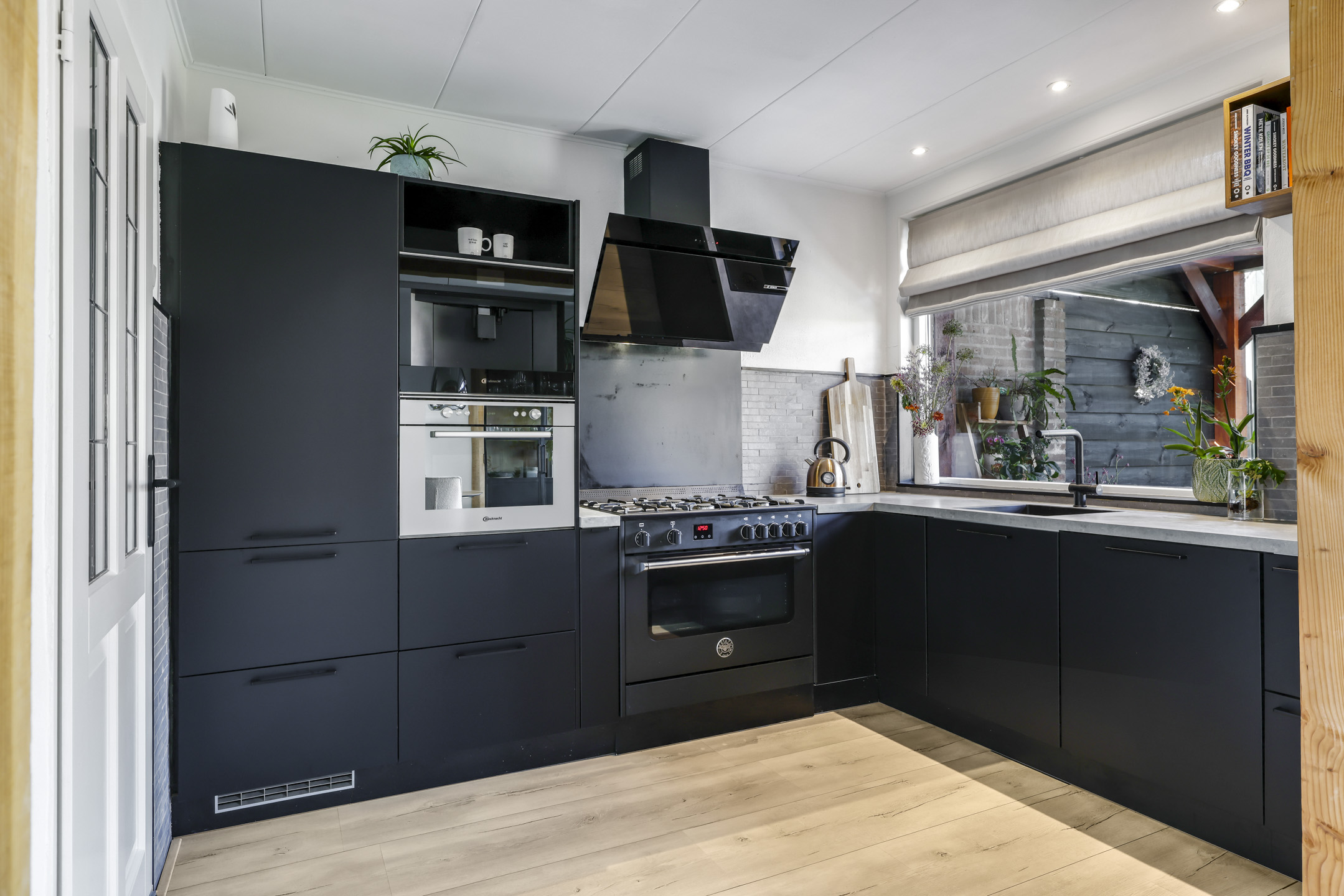 De keuken is slechts een paar jaar oud en dat zie je terug in de laatste trends. Zwarte fronten met zwarte grepen en een betonlook werkblad gecombineerd met een zwarte spoelbak en kraan zorgen voor een moderne en luxe uitstraling. Opvallend is hier het grote raam waardoor je tijdens het koken fijn de tuin in kijkt. Er is gekozen voor een breed (90cm) gasfornuis met grote oven (werkt niet naar behoren). De inbouwapparatuur bestaat uit een koelkast, een combi-oven, een vaatwasser en een afzuigkap. Zelfs het koffiezetapparaat is ingebouwd in de keuken. De glas-in-lood deur tussen de keuken en de hal maakt het geheel helemaal af.