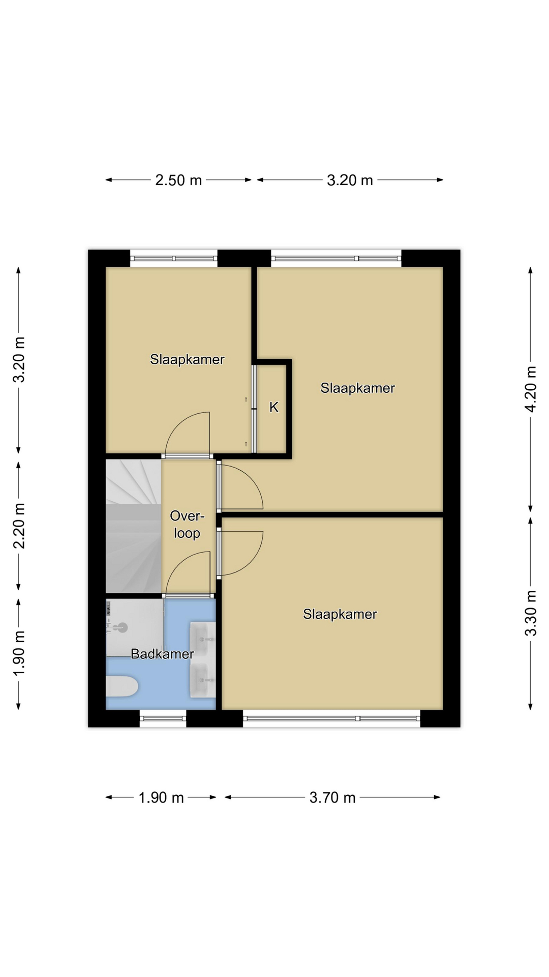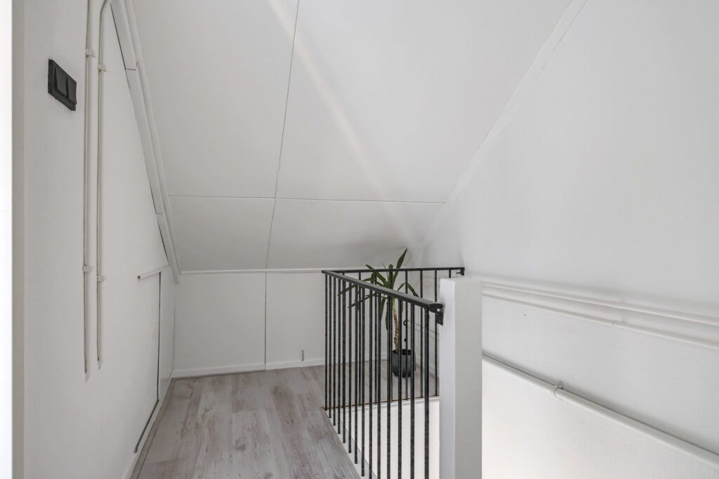 Op deze woonlaag schakelt de overloop 3 slaapkamers en de badkamer aan elkaar. De slaapkamers zijn allen goed bemeten en doordat er geen schuine kanten zijn, kun je de kamers optimaal indelen. De kamers zijn respectievelijk 13m², 12m² en 8m² groot. De kleinste kamer is voorzien van een brede inbouwkast met stijlvolle schuifdeuren. Zo kan je veel spullen opbergen zonder ruimte verlies van een deur. Deze woonlaag vormt één geheel door de doorlopende laminaatvloer.