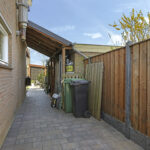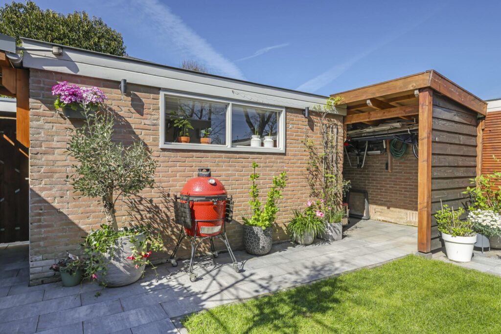 Door de hoekligging heb je een extra brede achtertuin. Dit zorgt niet alleen voor meerdere zithoeken, ook kom je hier geen bergruimte tekort. De tuin is ook nog op het westen gelegen waardoor je hier lekker van de middag en avondzon kan genieten. Diverse terrassen, gras en een border met planten en struiken zorgen voor een groene uitstraling. Achter in de tuin staat een stenen berging welke is voorzien van elektra en daglicht. Boven de achterom is een stukje overkapt waardoor je droog staat als je de berging wilt openen. Aan de andere zijde van de berging is tevens een overkapping gemaakt waardoor je lekker veel opbergruimte uit het zicht hebt. Dit is aan de zijkant van de woning op eenzelfde manier aangepakt. Daardoor heb je nog meer bergruimte uit het zicht.