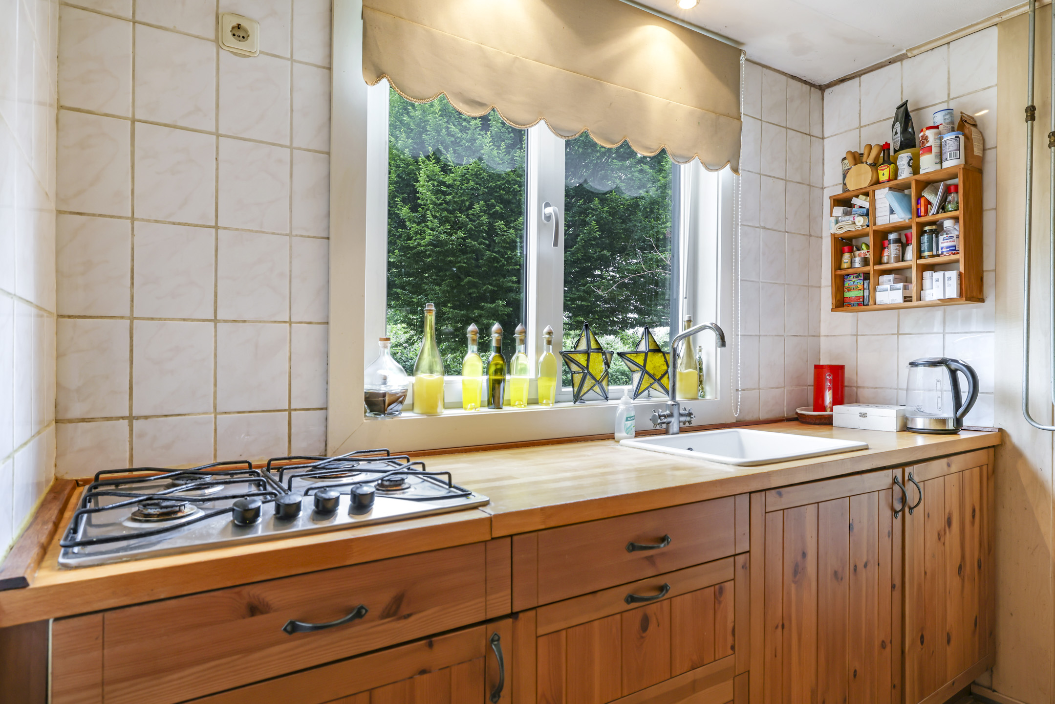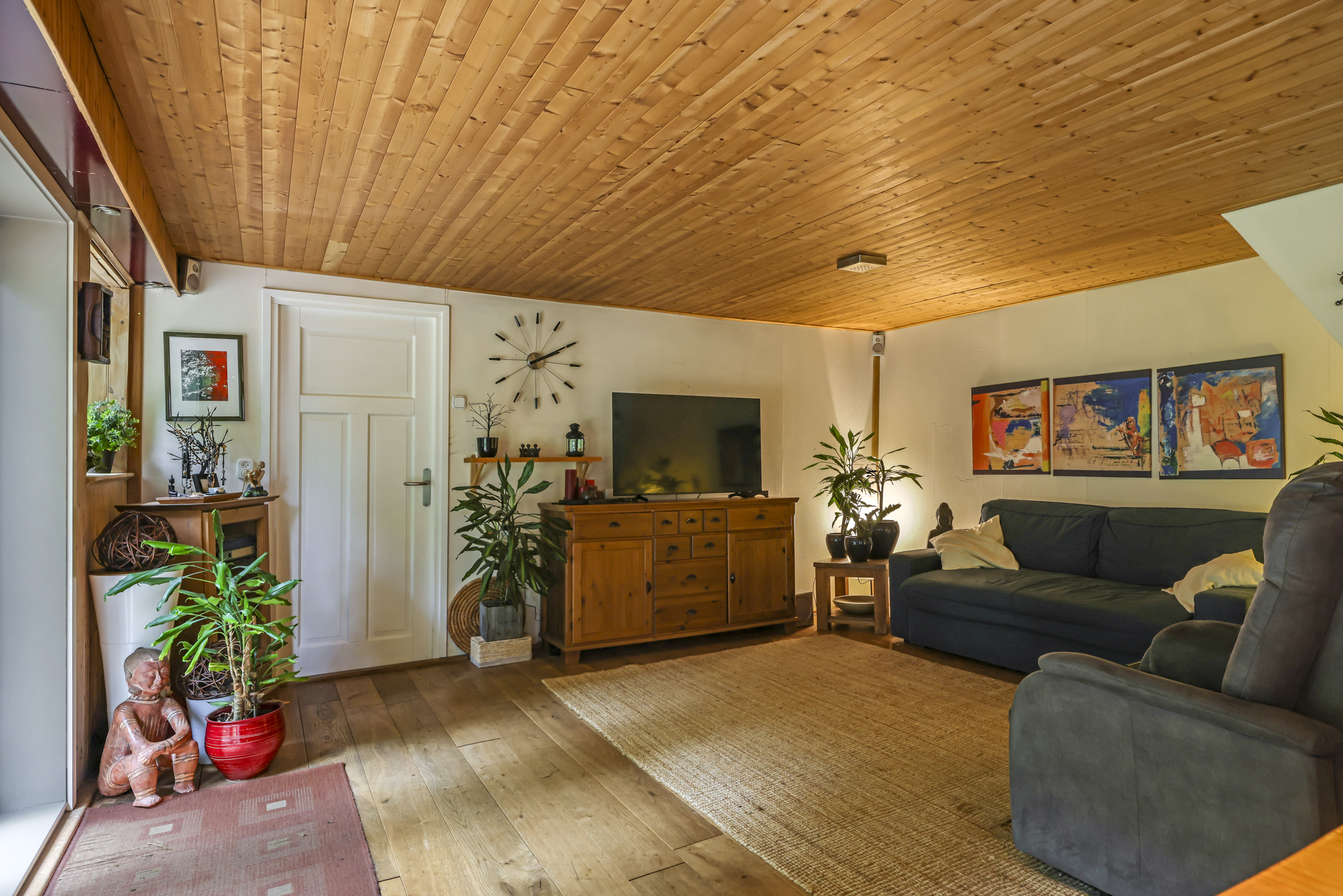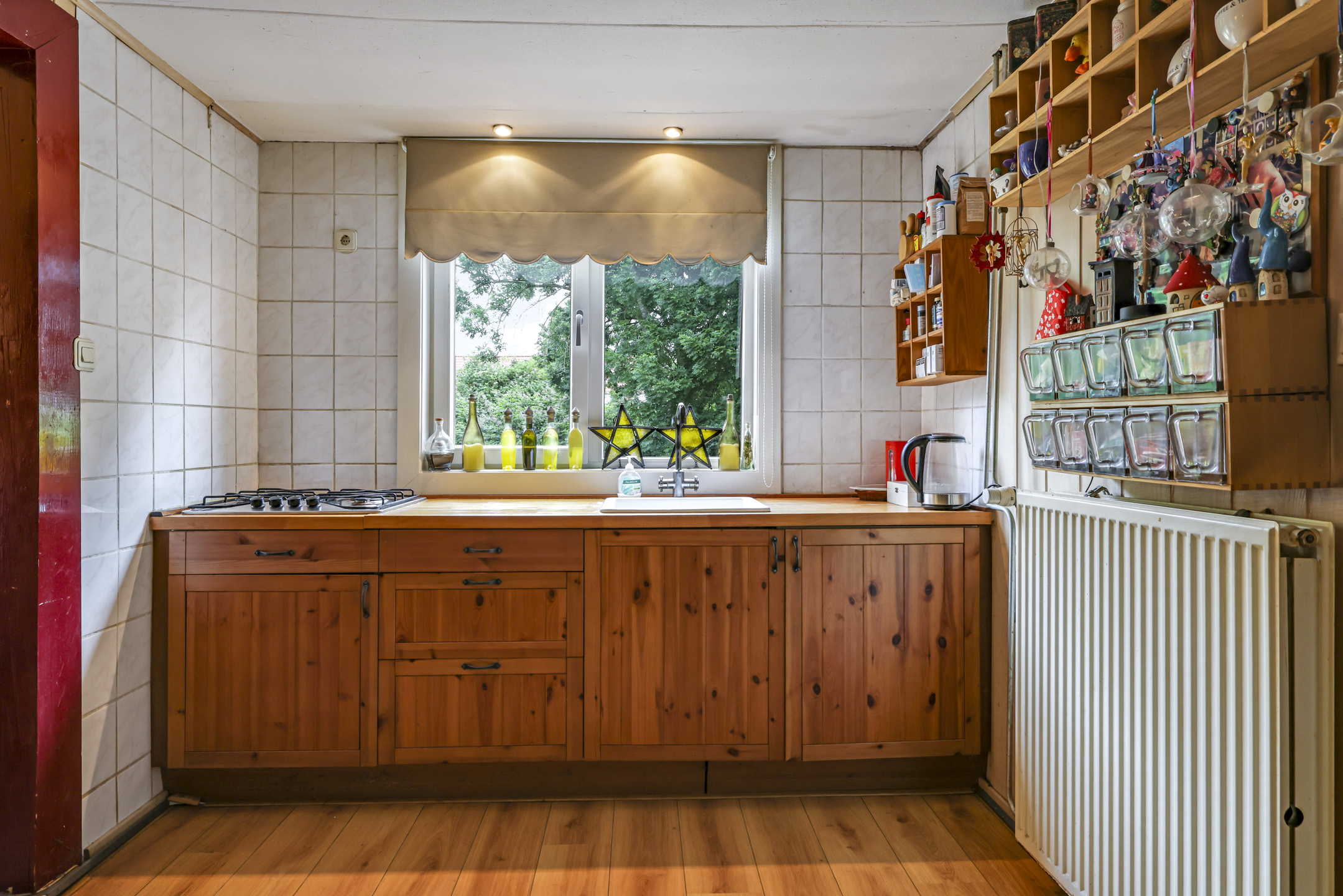 Vanuit de hal loopje door naar de keuken. Net als in het achterhuis is hier gekozen voor een houten keukenblok. Mocht je het wensen dan zou je bij de keuken zelfs nog een kleine eettafel kwijt kunnen. Aangesloten aan de keuken tref je de woonkamer. Opvallen zijn hier de grote ramen waardoor je een ruimtelijk gevoel ervaart. In deze ruimte kan je eenvoudig een grote zithoek en een 6-persoons eettafel kwijt.