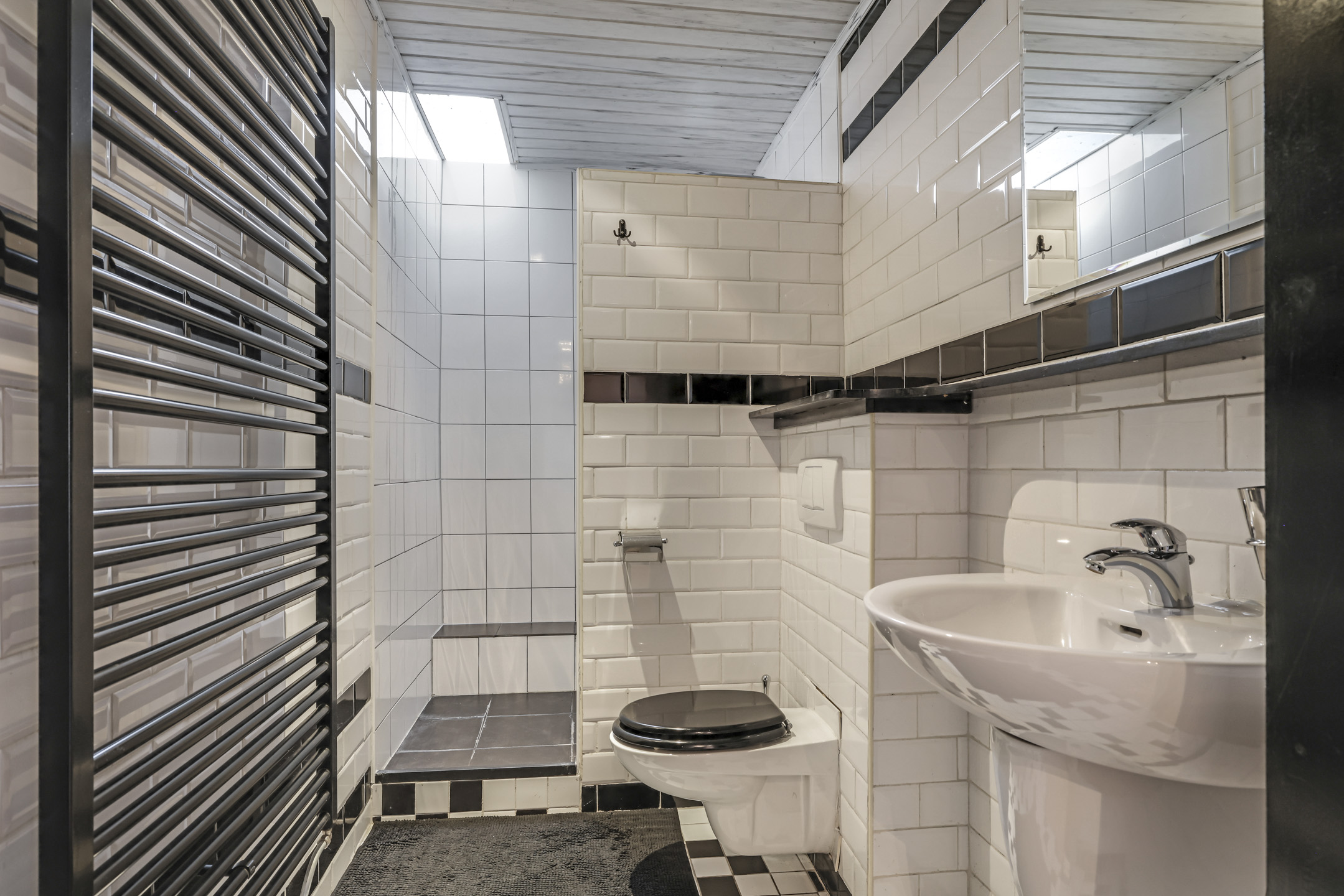 Deze woning kom je binnen via de in het midden van het pand gelegen hal. Vanuit deze hal heb je toegang tot het achterhuis, toegang tot een badkamer en toegang tot een berging waar o.a. de opstelling van cv-ketel is gesitueerd. De badkamer is ingedeeld met een toilet, een wastafel, een inloopdouche en een handdoekradiator. Het tegelwerk is uitgevoerd in een neutrale wit/antraciete kleurstelling.