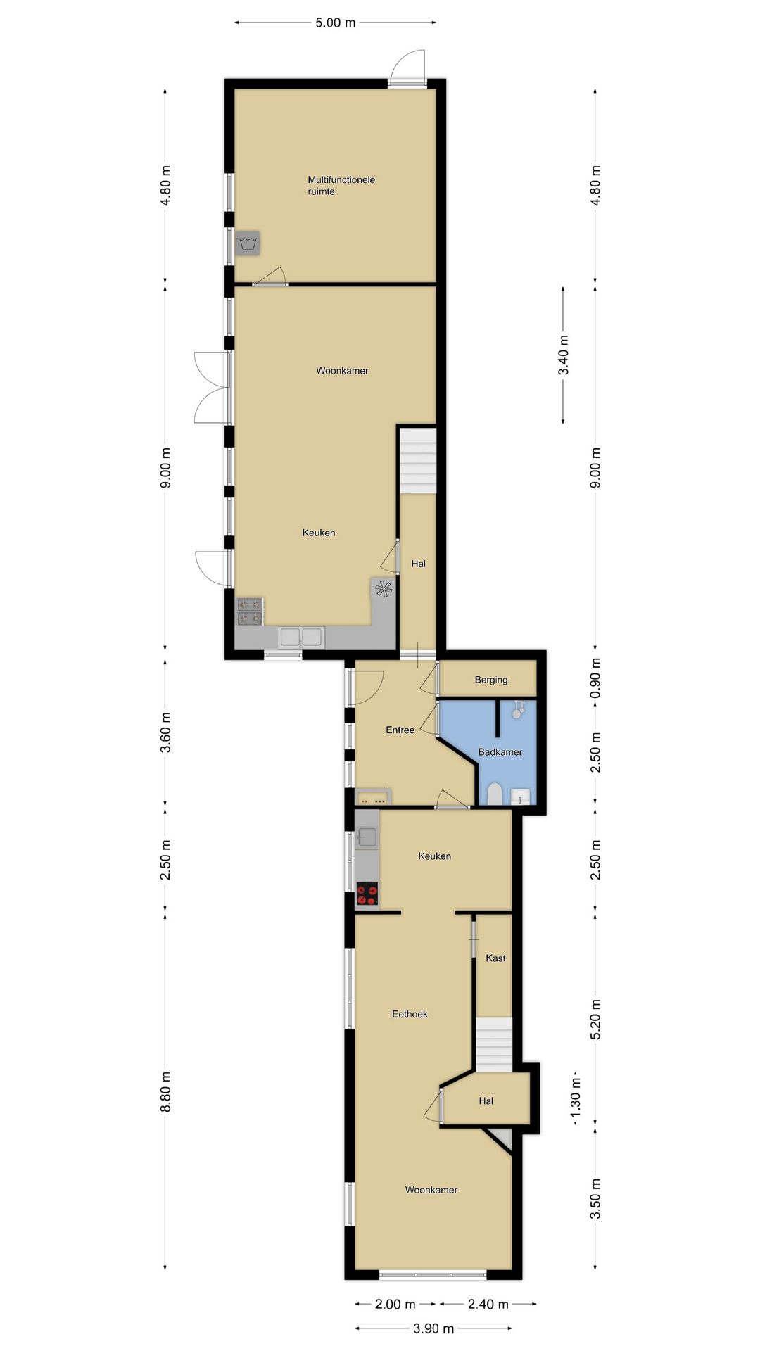 Woning opgedeeld in voorhuis en achterhuis, doorloop via hal