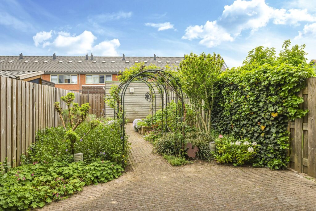 Via de openslaande deuren in de woonkamer is de achtertuin te bereiken. De tuin is gelegen op het volle zuiden en vangt daarmee de gehele dag zon. De tuin is zeer sfeervol aangekleed met veel fleurige planten en struiken. Een begroeide pergola zorgt voor een speelse doorloop naar achteren toe. Aan de gevel en achter in de tuin zijn terrassen gemaakt maar je heerlijk van het buitenleven kan genieten. Achter in de tuin staat nog een houten schuur voorzien van elektra welke zorgt voor de nodige berg- en stallingsruimte. Ernaast is de achterom aanwezig.