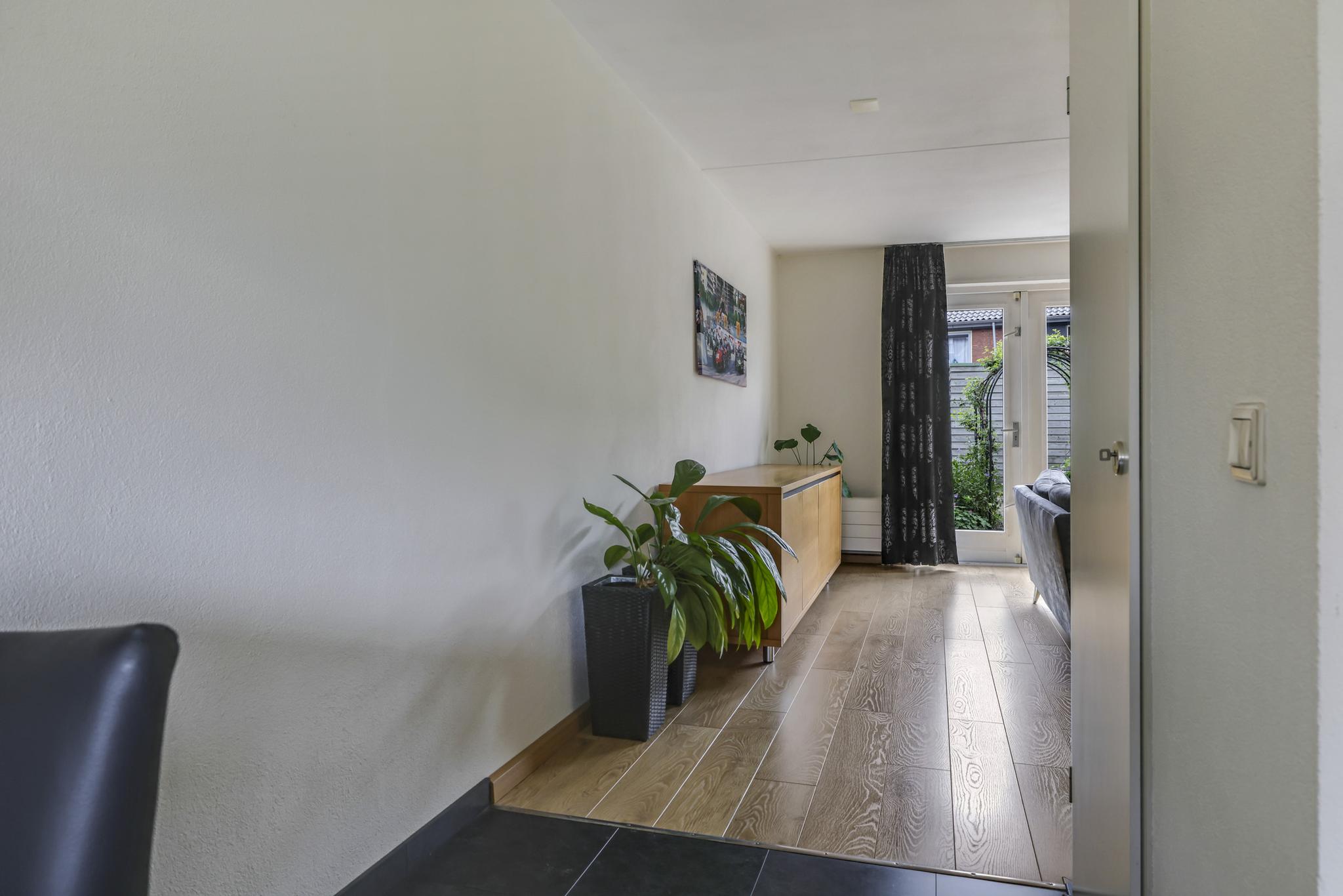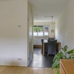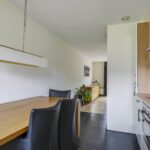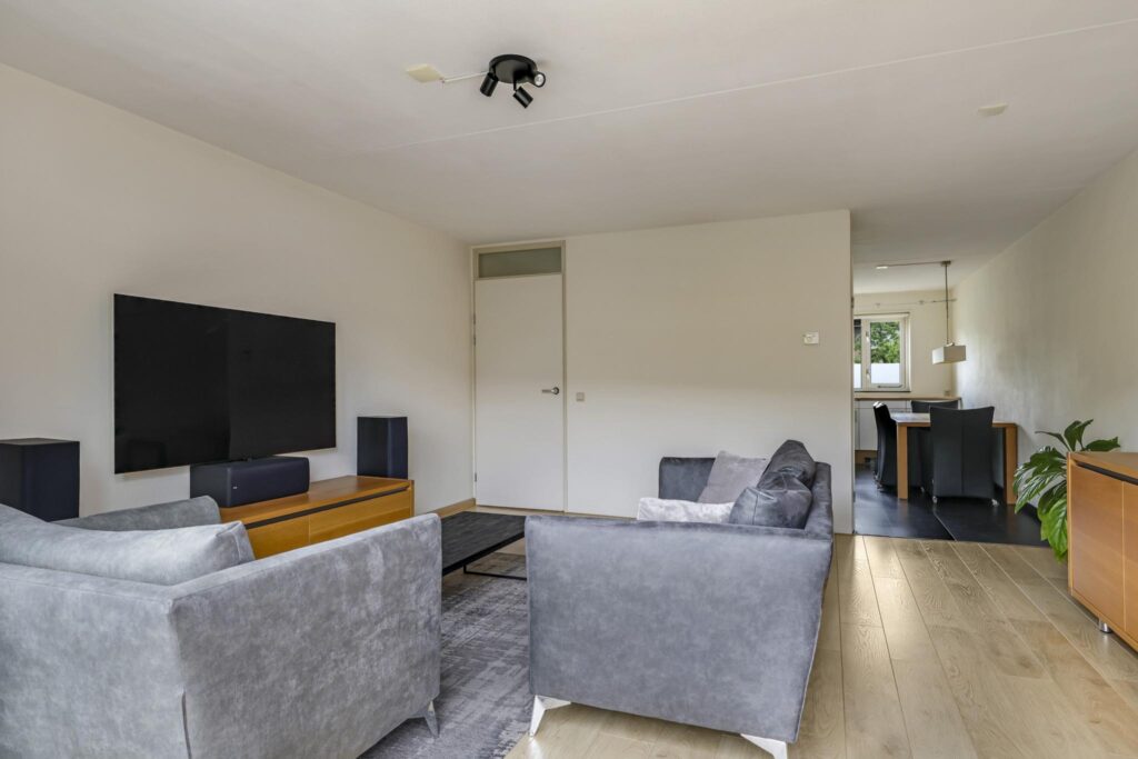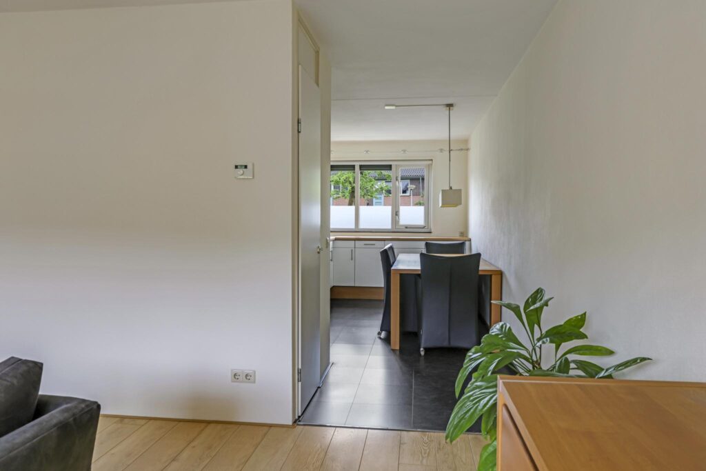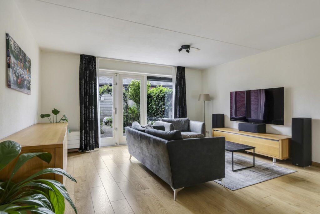 De woonkamer is aan de achterzijde van de woning gelegen. Hierdoor geniet je, mede door het vele glasoppervlak, van een fijn uitzicht in de groen aangeklede tuin. In de zomerdag zet je hier eenvoudig de openslaande deuren open waardoor je binnen en buiten bij elkaar kunt betrekken. Door de vierkante opzet van de ruimte is deze eenvoudig in te richten met een lekkere hoekbank en bijvoorbeeld een groot dressoir. Tussen de woonkamer en de keuken in is een trapkast aanwezig waardoor je hier veel opbergruimte uit het zicht hebt.