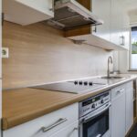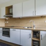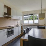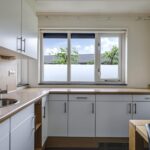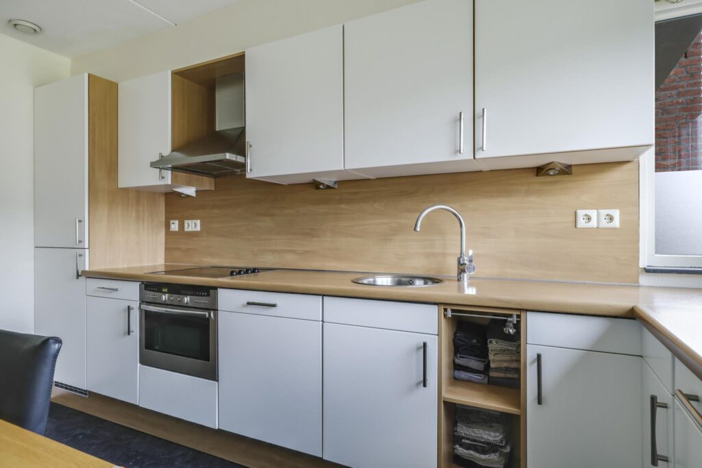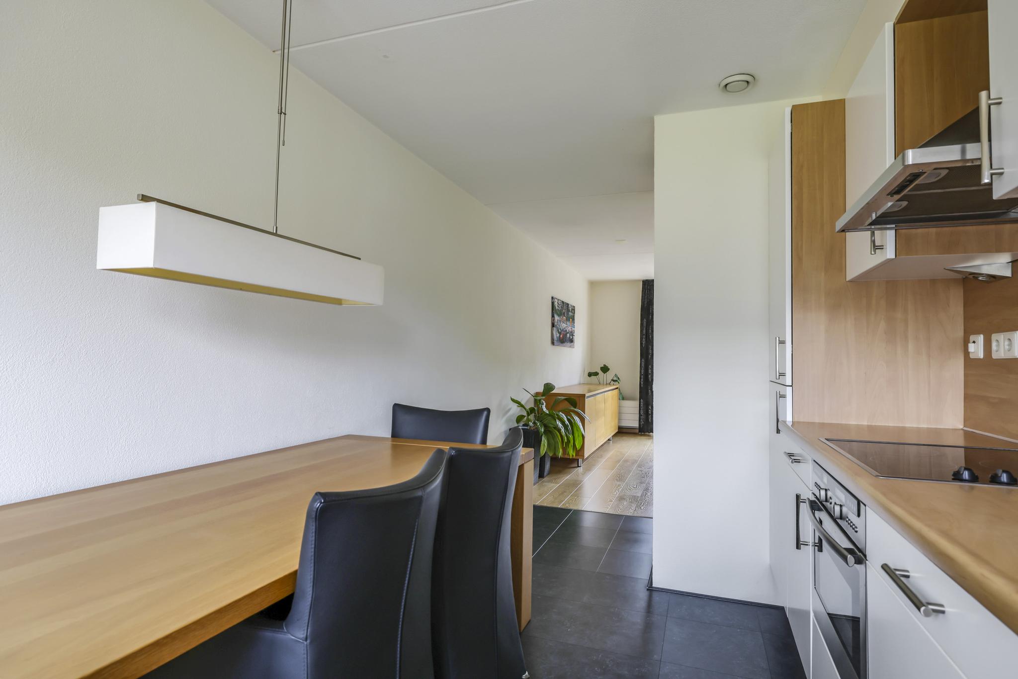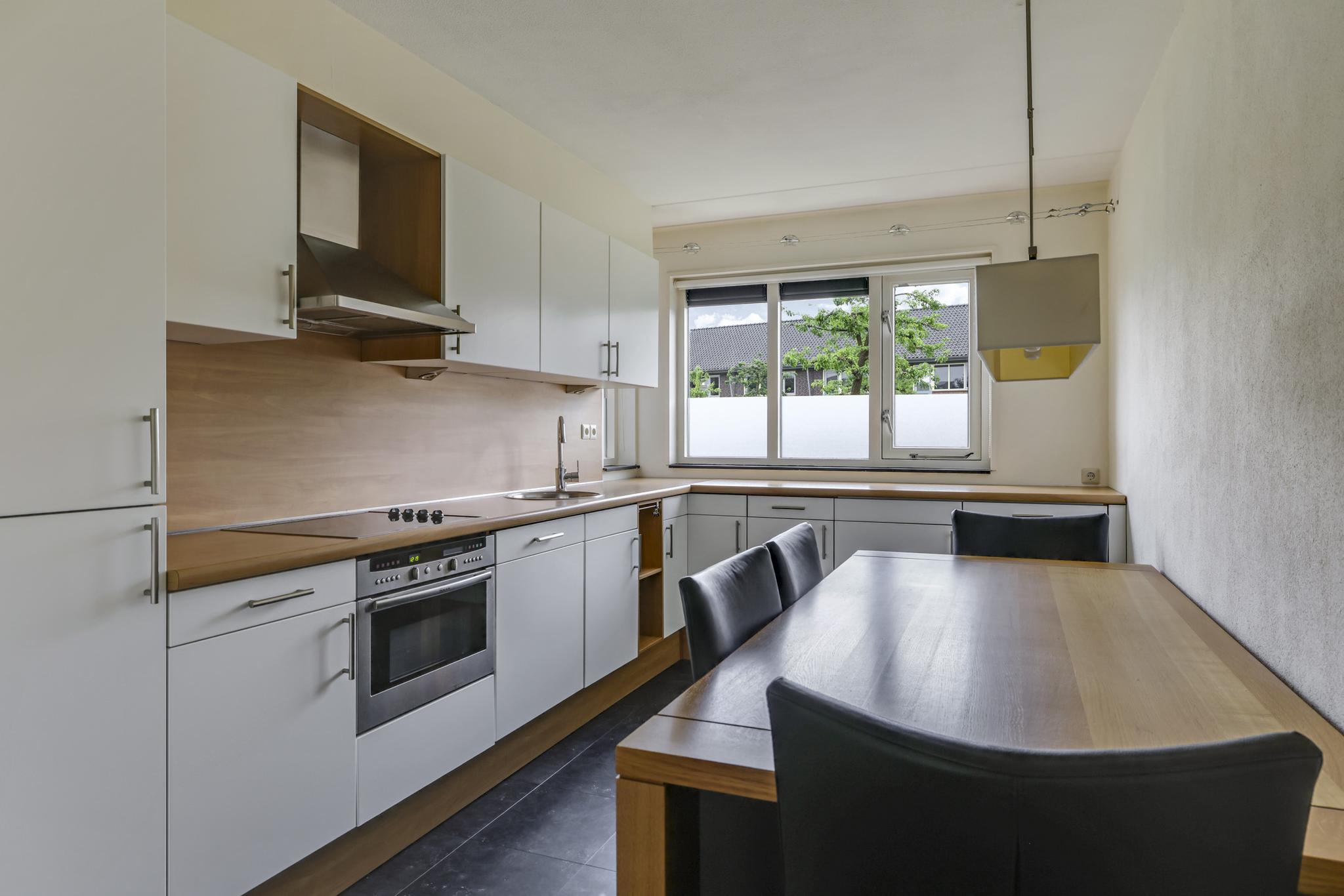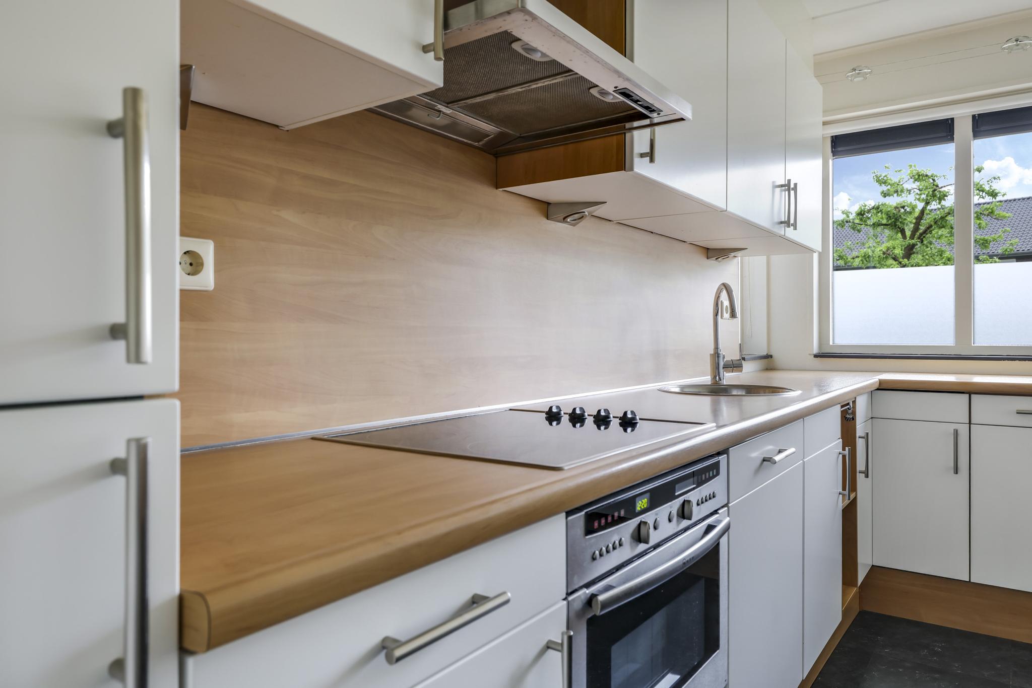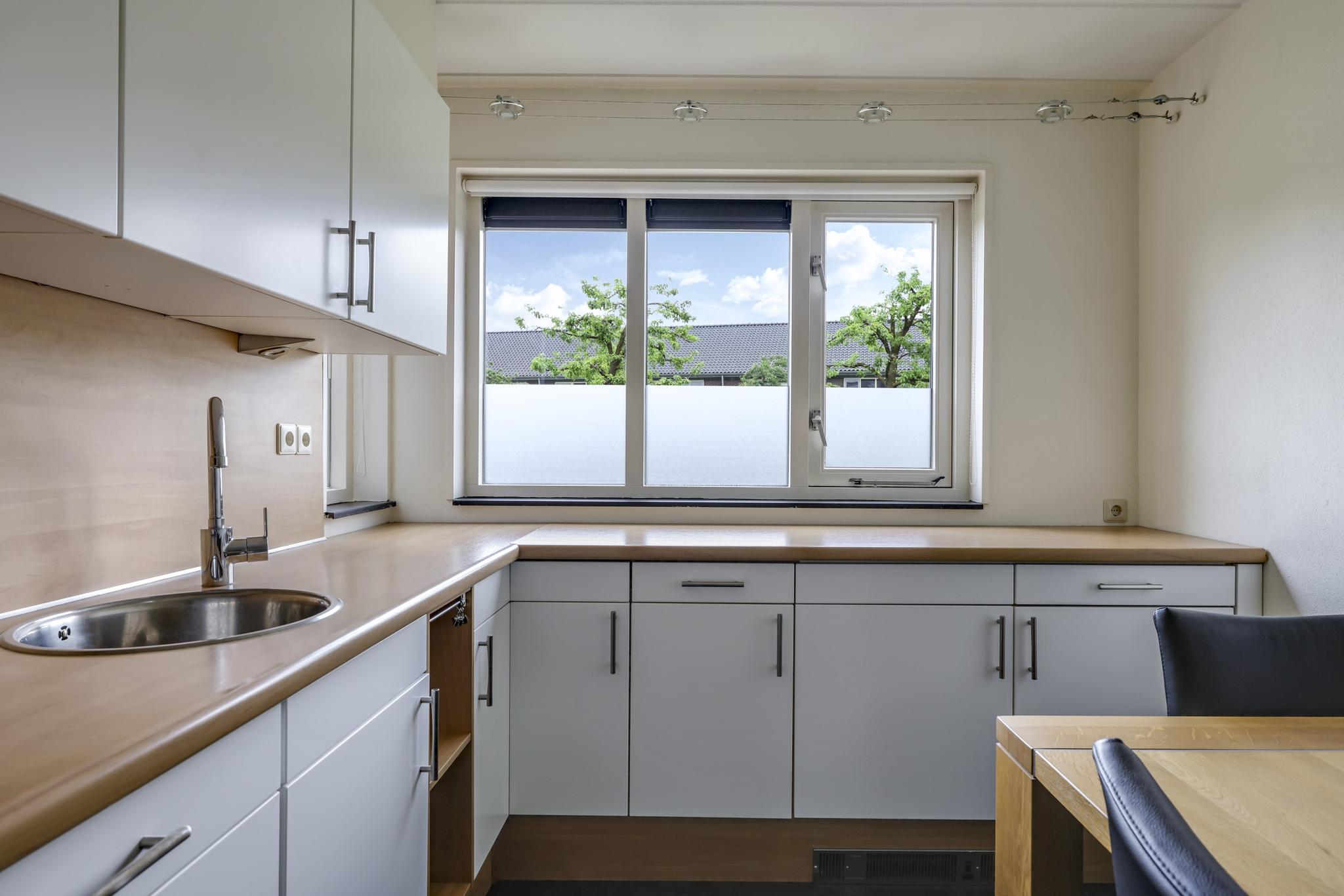 Een aantrekkelijke erker aan de voorzijde zorgt voor een ruimere opzet van de keuken. Dit geeft niet alleen een speels effect met een weids uitzicht op het voorgelegen groen, maar ook voor een groter keukenblok. Zo is er meer werkruimte op het aanrecht en is er een goede balans tussen kastruimte en inbouwapparatuur. De complete keuken is voorzien van de gewenste inbouwapparatuur zoals een 4-pits keramische kookplaat, een afzuigkap, een koel/vriescombinatie, een combi-oven/magnetron en een vaatwasser. Diverse bovenkasten zorgen voor maximaal veel opbergruimte. In de keuken kan je ook de eethoek kwijt. Hierdoor praat je gezellig verder tijdens het koken.