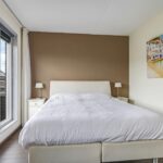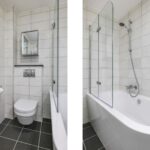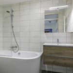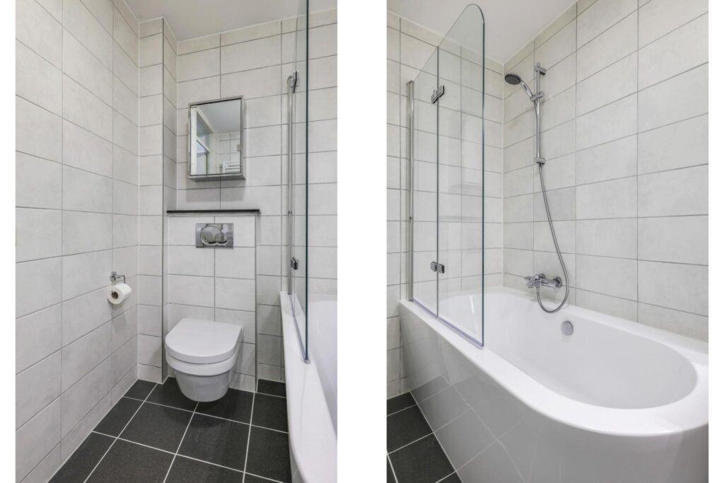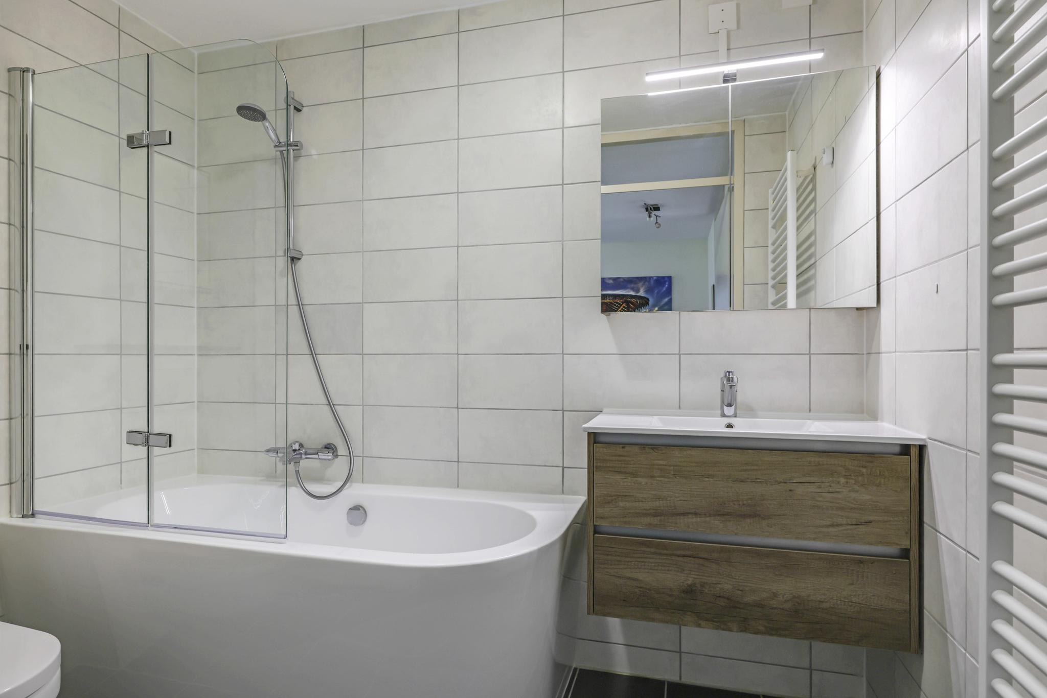 Tussen de slaapkamers in is de badkamer gelegen. Deze is geheel betegeld waarbij is gekozen voor de tijdloze combinatie van lichte wandtegels en antracietkleurige vloertegels. Het sanitair bestaat uit een half-vrijstaand ligbad/douche, een 2e (zwevend geplaatst) toilet en een wastafelmeubel. Het wastafelmeubel is voorzien van 2 brede lades en een spiegelkast waardoor je hier geen ruimte tekort zal komen. Uiteraard is er ook een handdoekradiator aanwezig. Ventileren is mogelijk middels de mechanische ventilatie.