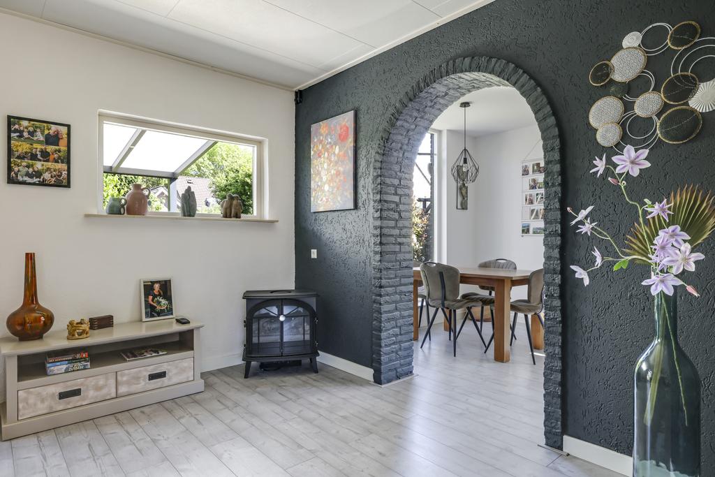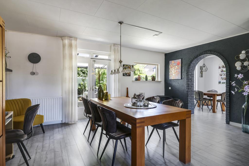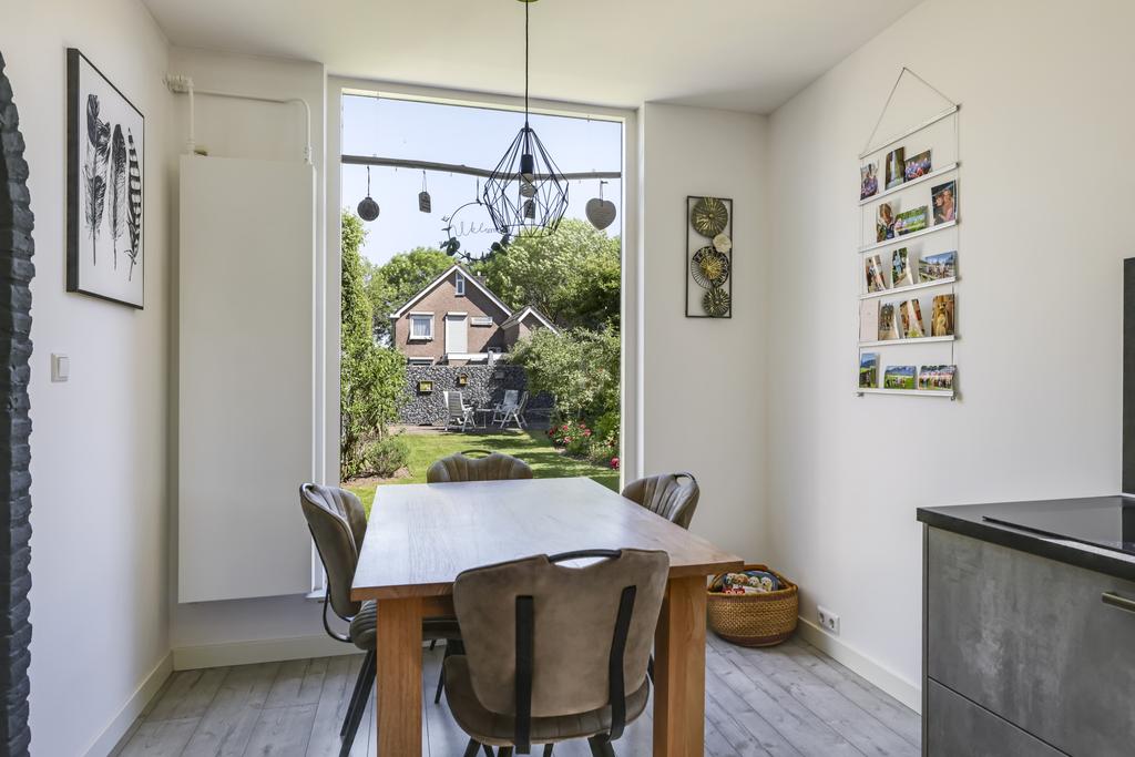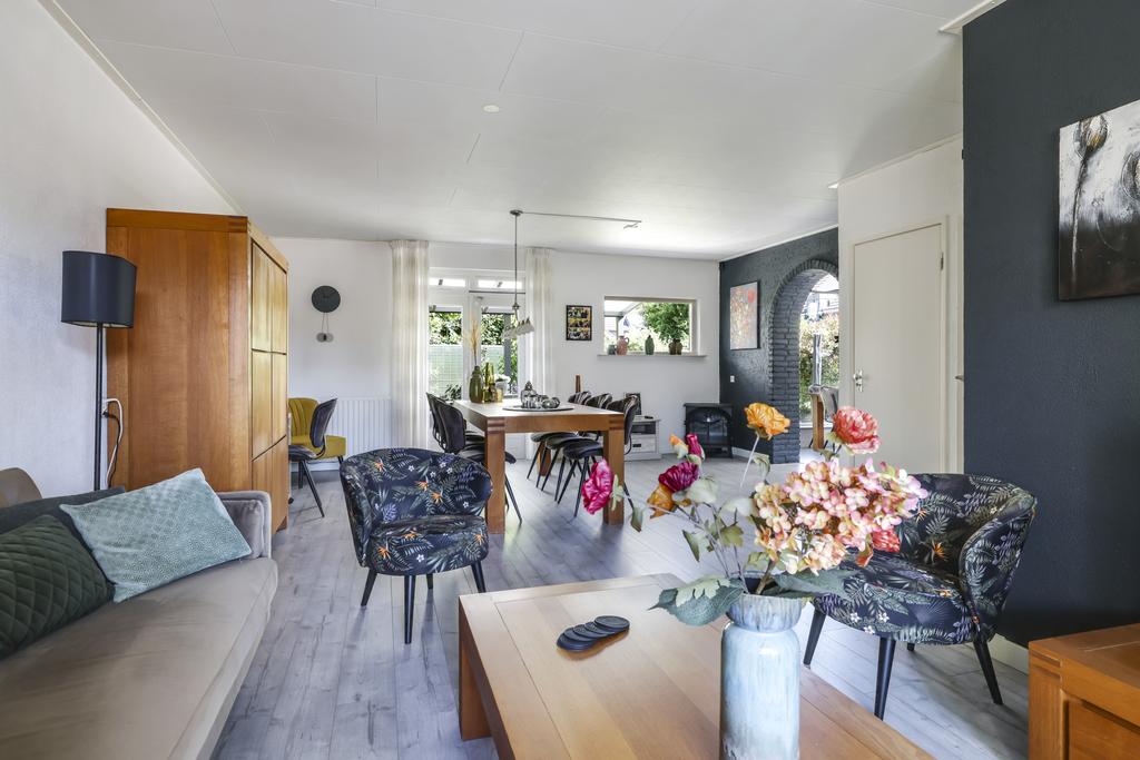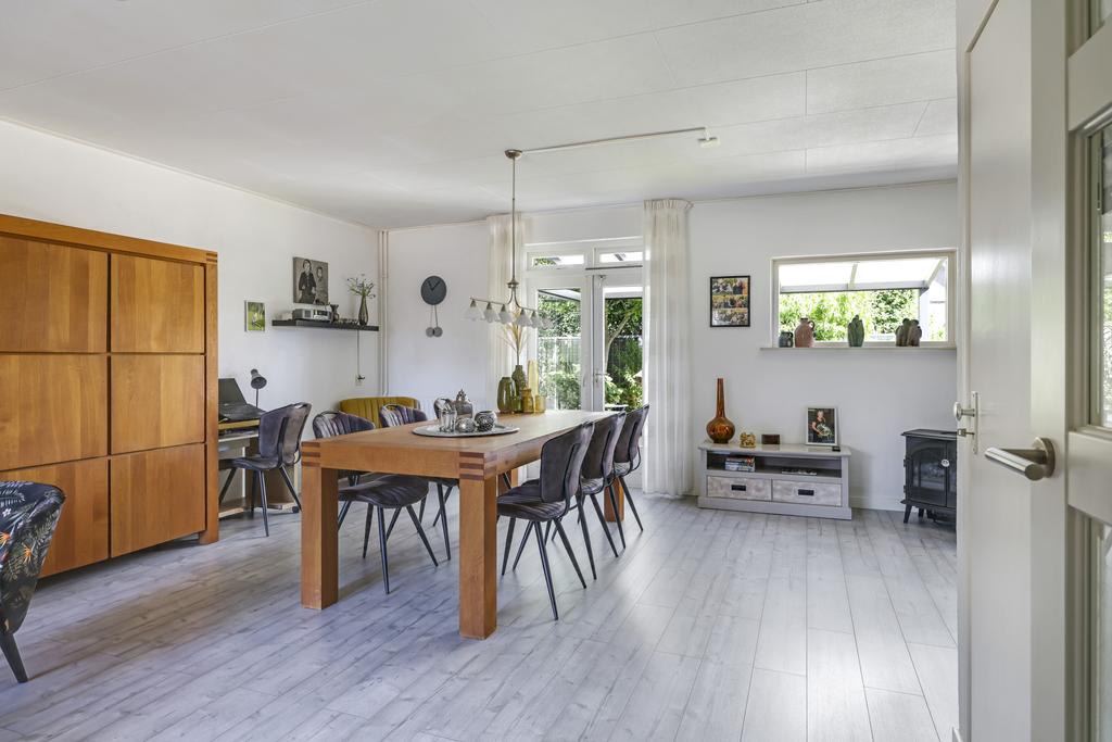 Wanneer je de woonkamer binnenkomt zie je direct dat dit geen standaard woning meer is. De keuken welke origineel aan de voorzijde van de woning stond is verplaatst naar de aanbouw. Aan de voorzijde is een erker geplaatst wat zorgt voor een speels effect en een ruimtelijker gevoel. Door beide ingrepen is er veel meer praktische leefruimte ontstaan waardoor je hier dan ook niet snel ruimte te kort zal komen. Een grote zithoek, een lange eettafel en een ruimte voor bijvoorbeeld een speelhoek voor de kinderen? Hier past het allemaal. Bovendien zet je de openslaande deuren open en loop je zo de tuin in en uit. In de hoek van de kamer is nog een trapkast aanwezig waar je de nodige opbergruimte vindt.