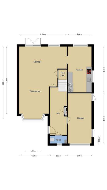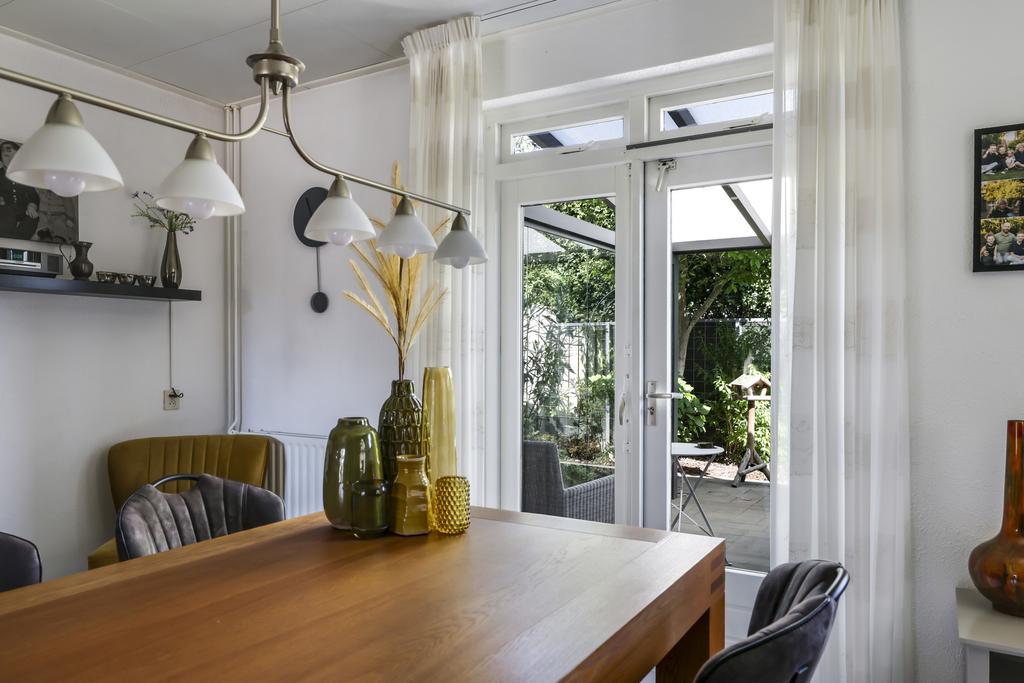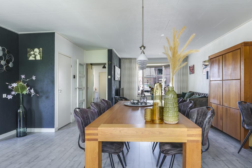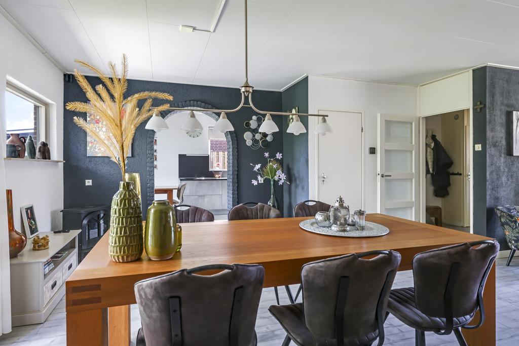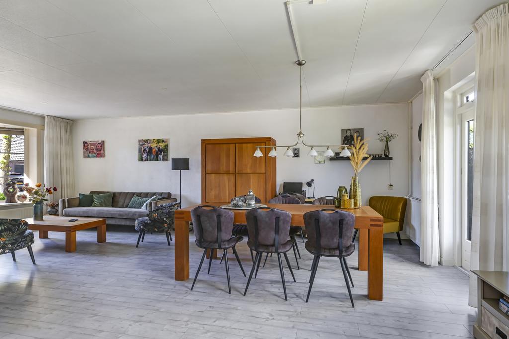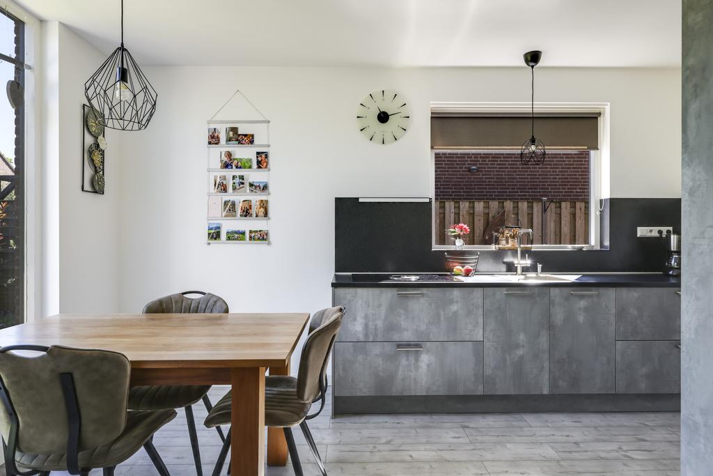Wanneer je de woonkamer binnenkomt zie je direct dat dit geen standaard woning meer is. De keuken welke origineel aan de voorzijde van de woning stond is verplaatst naar de aanbouw. Aan de voorzijde is een erker geplaatst wat zorgt voor een speels effect en een ruimtelijker gevoel. Door beide ingrepen is er veel meer praktische leefruimte ontstaan waardoor je hier dan ook niet snel ruimte te kort zal komen. Een grote zithoek, een lange eettafel en een ruimte voor bijvoorbeeld een speelhoek voor de kinderen? Hier past het allemaal. Bovendien zet je de openslaande deuren open en loop je zo de tuin in en uit. In de hoek van de kamer is nog een trapkast aanwezig waar je de nodige opbergruimte vindt.