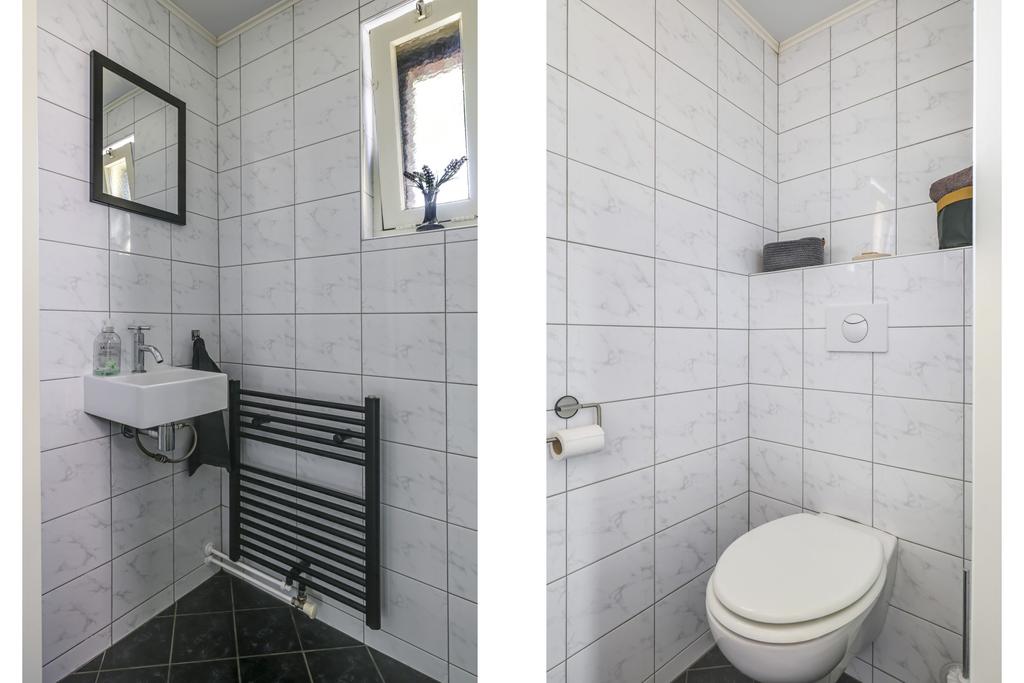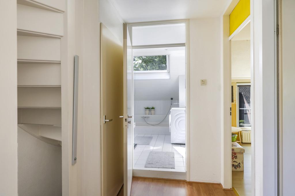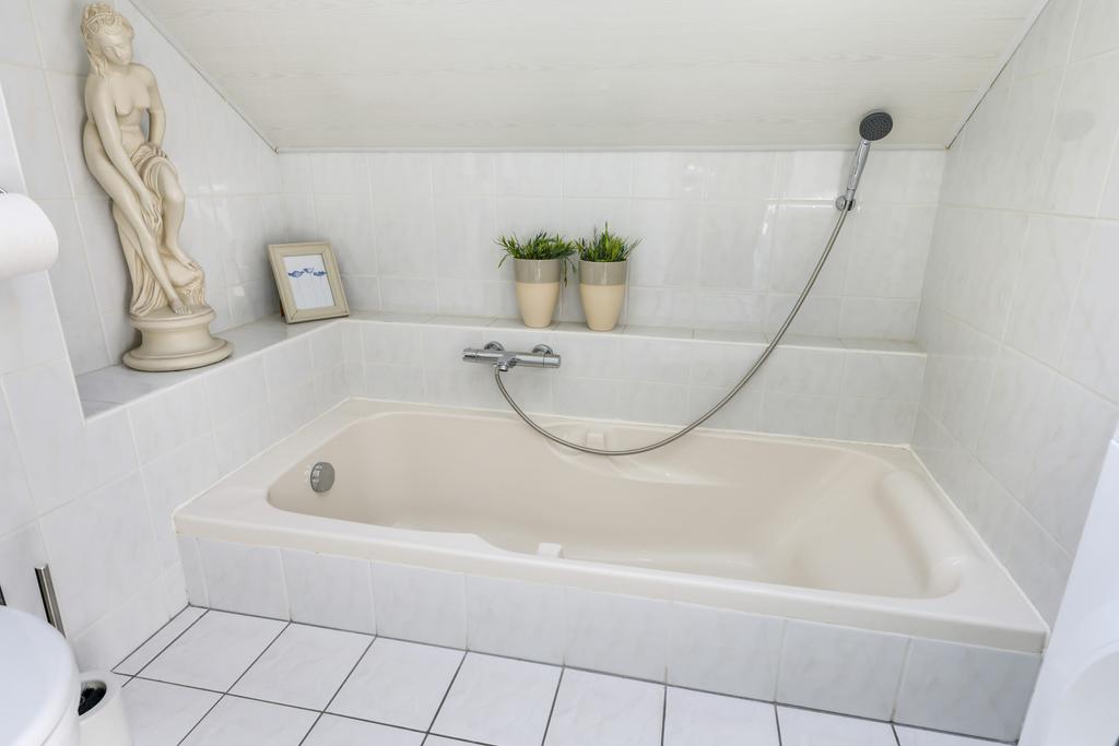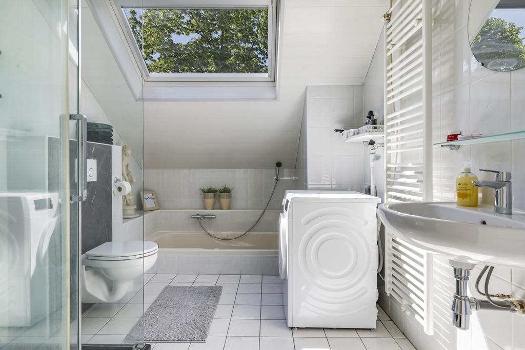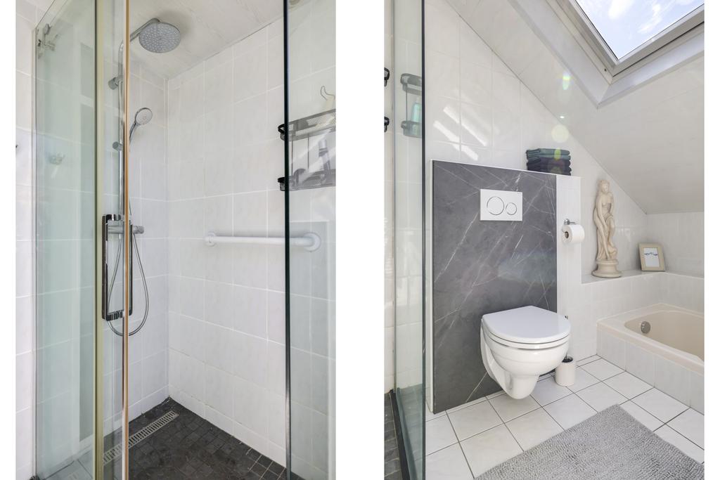 De laatste deur op de overloop is van de badkamer. Deze ruimte is verrassend ruim doordat de schuine kapconstructie hier doorloopt ten opzichte van de naastgelegen slaapkamer. Een groot dakraam zorgt daarbij voor de nodige lichtinval. De ruimte is ingedeeld met een ligbad, een brede inloopdouche, een 2e toilet (zwevend geplaatst) en een wastafel. Ook de wasmachine is hier geplaatst, echter zou je deze ook op de 2e verdieping kwijt kunnen waardoor je hier bijvoorbeeld een dubbel wastafelmeubel kan plaatsen. Uiteraard is er ook een handdoekradiator aanwezig.