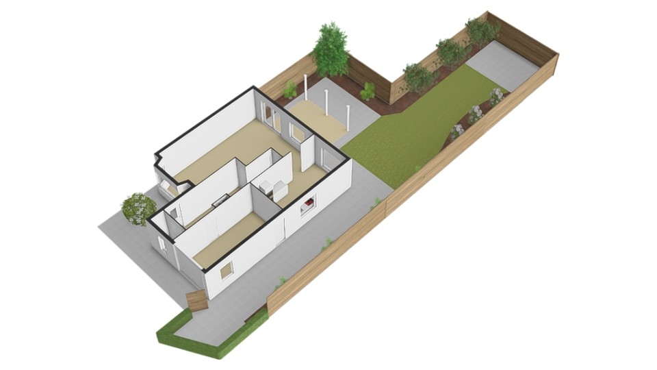 Opvallend is dat hier aan de voorzijde een strookje grond is verkregen. Dit lijkt slecht een klein stukje, echter betekent dit dat je hierdoor een eenvoudige mogelijkheid krijgt om ook met groter materiaal achter het huis te komen.