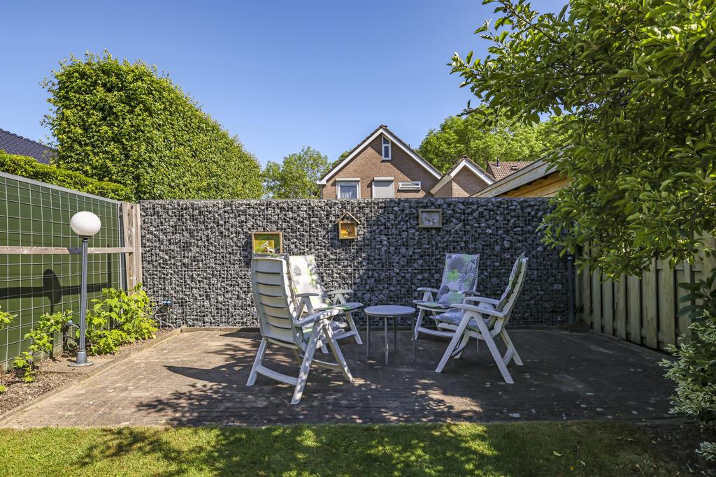 Bij deze woning heb je niet alleen binnen, maar ook buiten de woning lekker veel ruimte. Direct aan de woning is een overkapping geplaatst waaronder je lang buiten kan blijven zitten. Het rechterdeel van de tuin is maar liefst 17,5m diep waardoor je hier veel tuin hebt om van te genieten. Achterin tref je een terras waar je dan ook heerlijk in de zon kan zitten. Het grasgazon in het midden wordt omringt door diverse planten en struiken waarbij er tevens veel fruitbomen te vinden zijn. Doordat er nog bijna 3 meter tuin naast de woning is gelegen, heb je over de gehele tuin nét dat beetje extra om van te genieten.