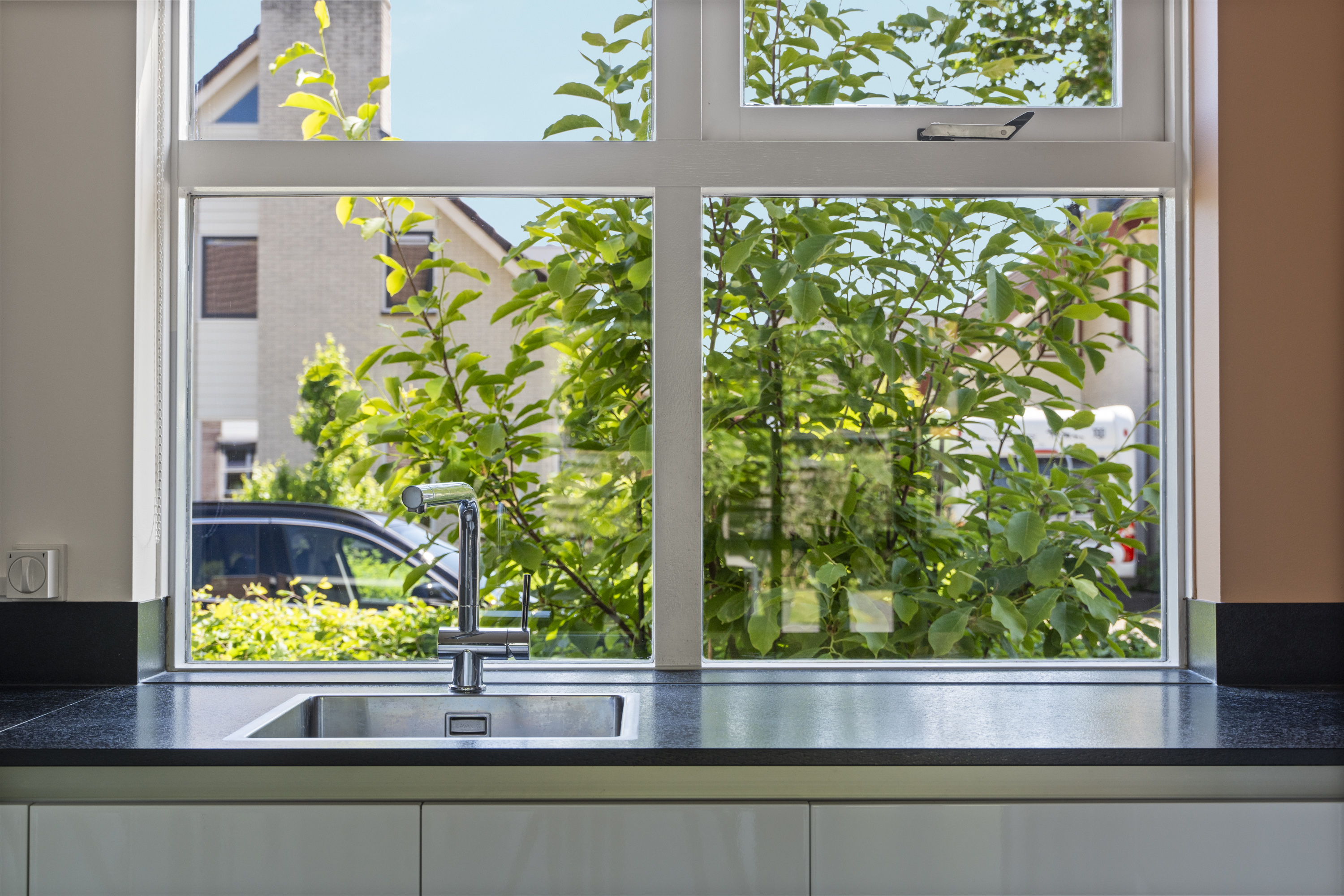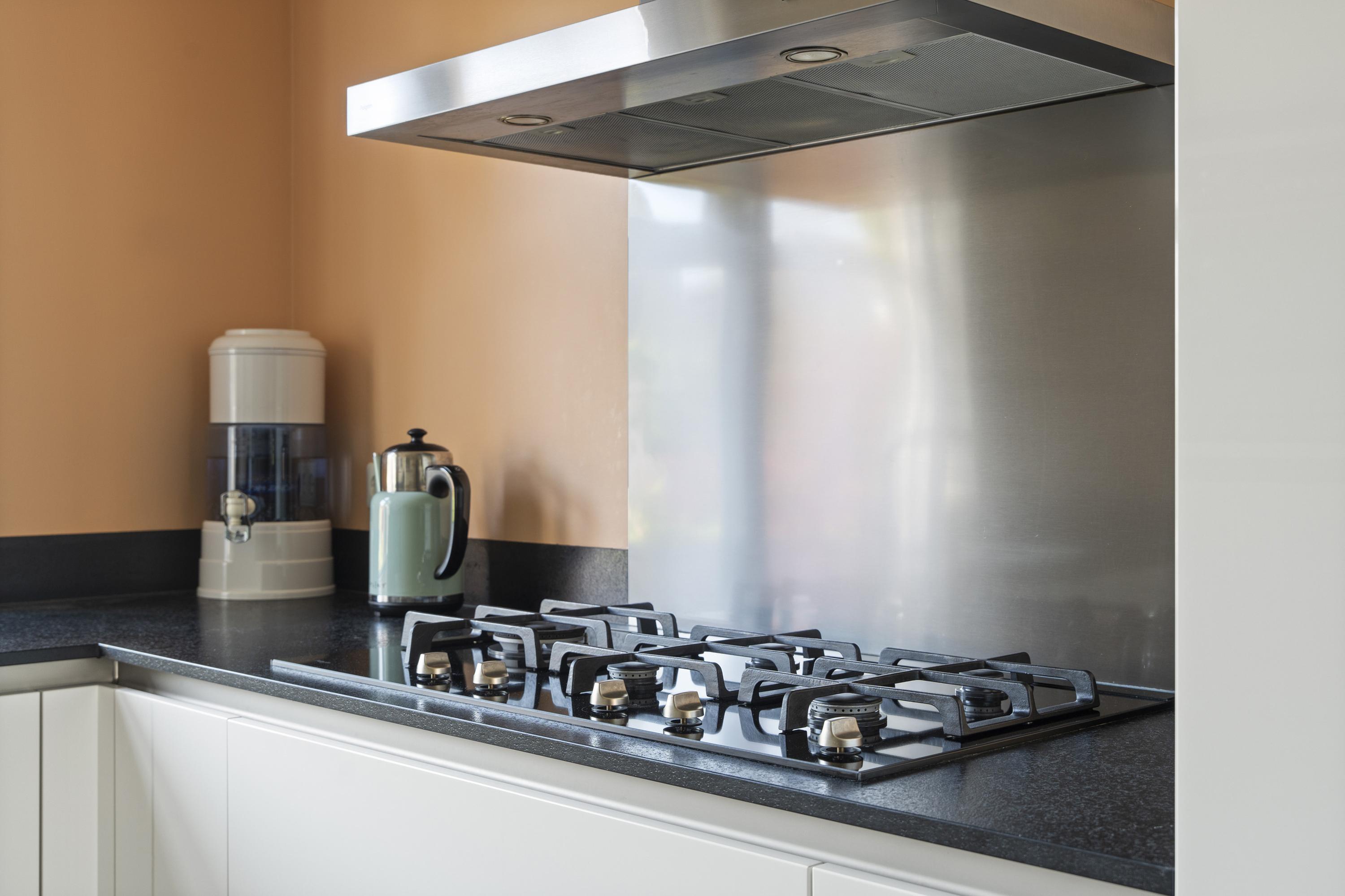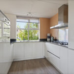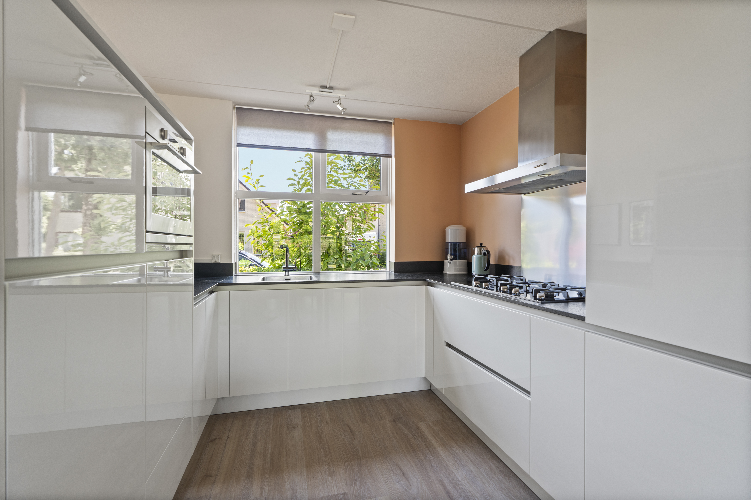 De keuken heeft een open karakter met de woonkamer. Er is gekozen voor een uitgebreide U-opstelling met witte, greeploze fronten wat mooi afsteekt bij het slanke, antracietkleurige werkblad. De inbouwapparatuur bestaat uit een 5-pits gaskookplaat, een afzuigschouw, een combi-over/magnetron, een vaatwasser en een koelkast. Aan kastruimte geen gebrek door de uitgebreide aanwezigheid van kasten en lades. Het aanwezige raam zorgt voor een fijn zicht in de straat. Eventueel kan je dit raam afsluiten middels een elektrisch bedienbaar rolluik.