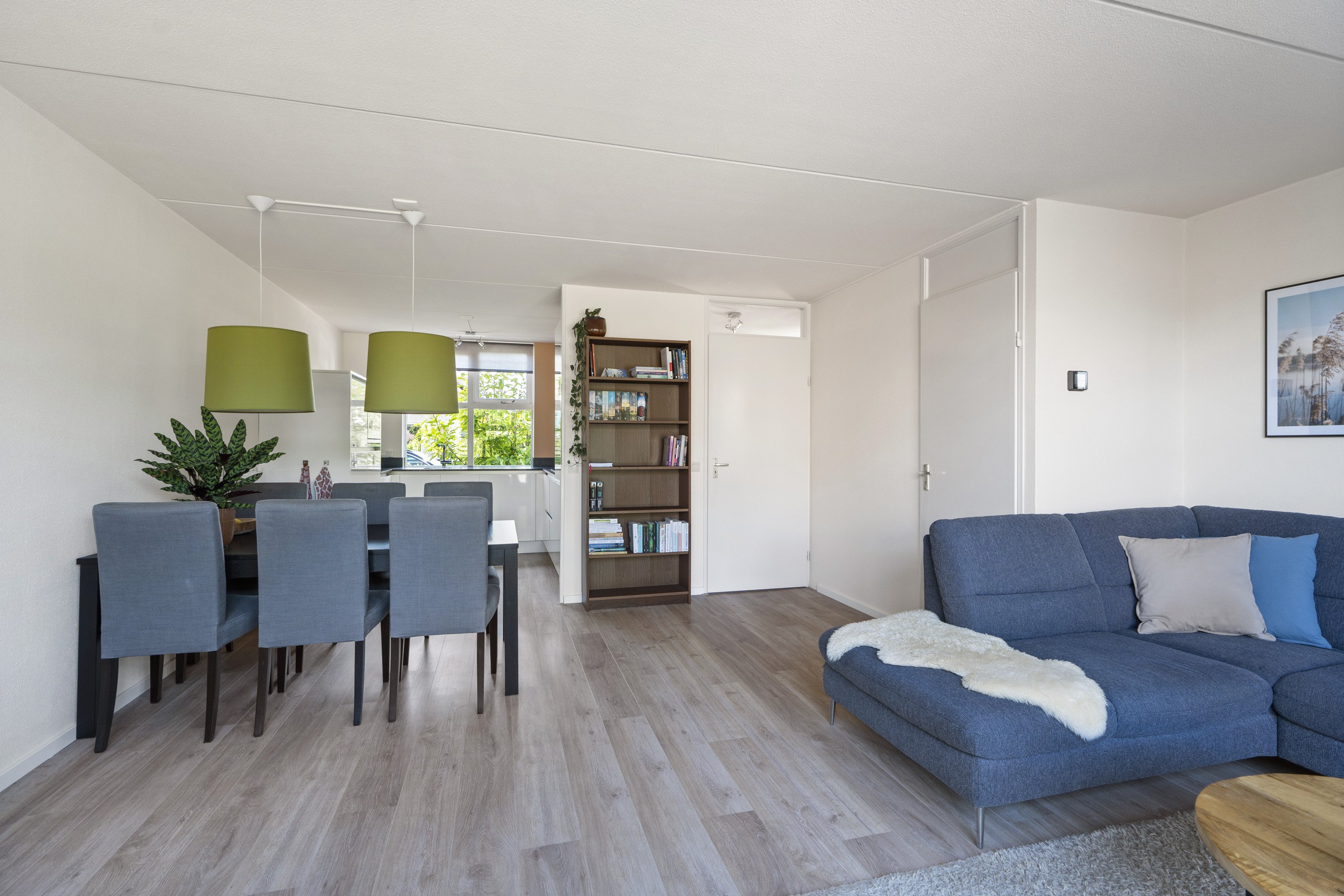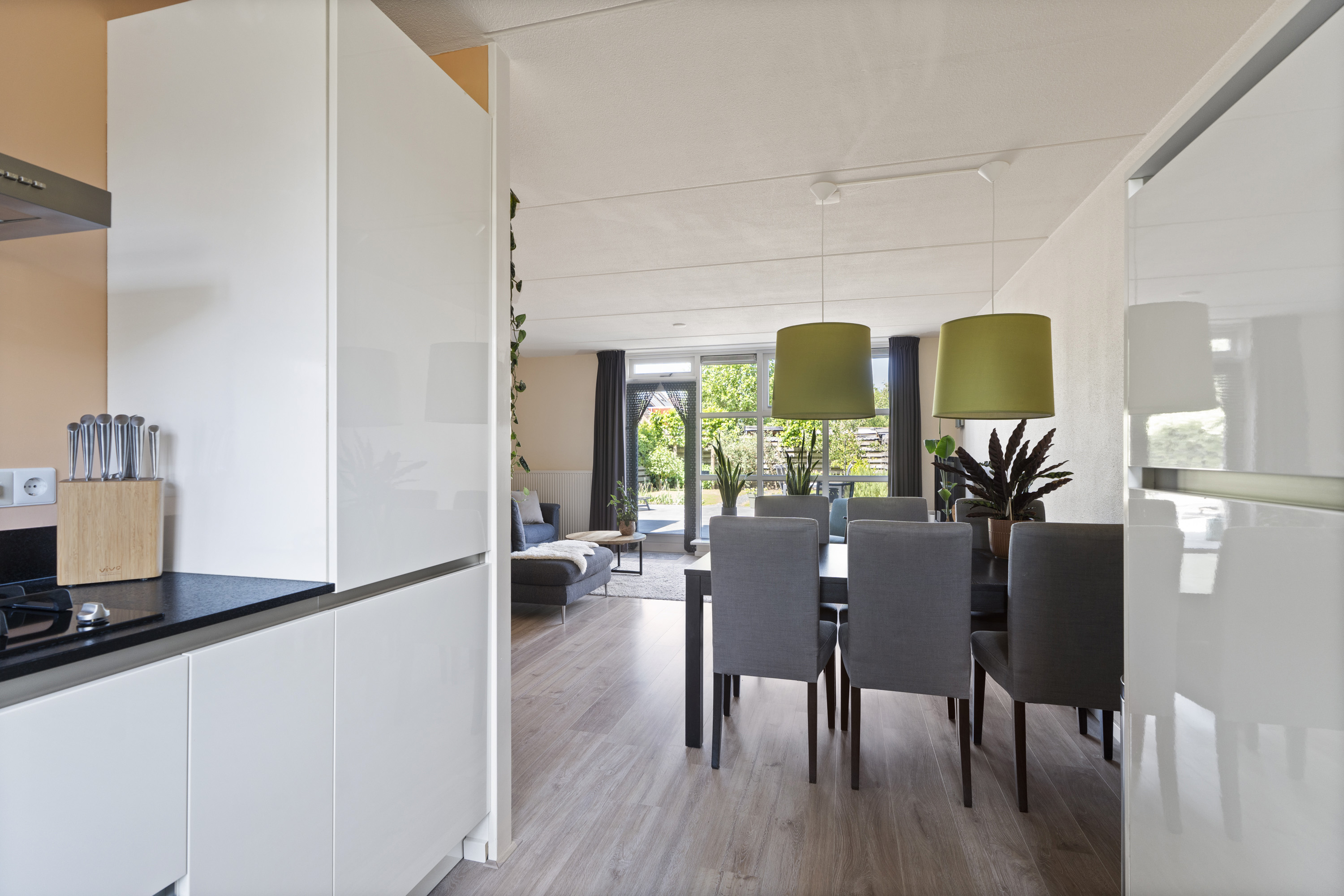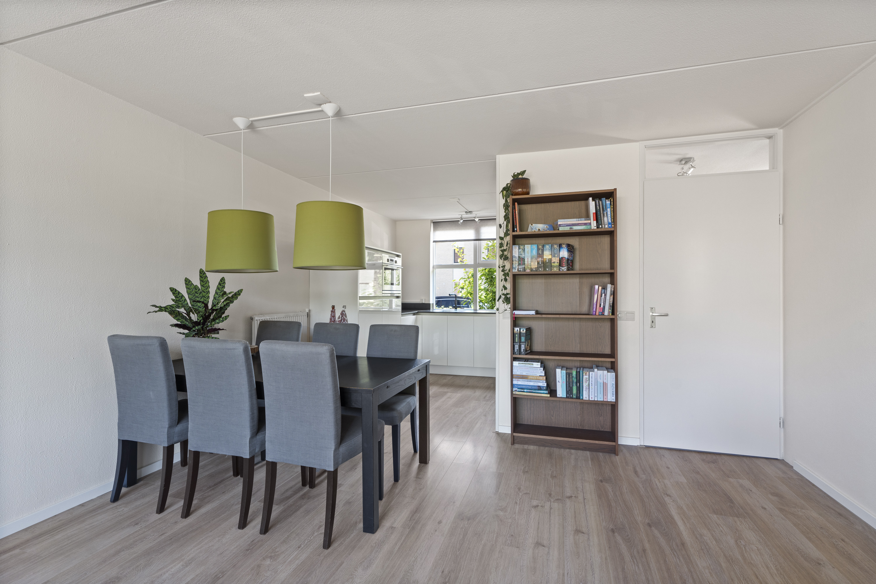 De woonkamer is aan de achterzijde gelegen, waardoor je een zicht hebt op de diepe achtertuin. Het raam is voorzien van een vakverdeling wat zorgt voor een speels effect. De woonkamer is van goed formaat waardoor je hier eenvoudig een grote hoekbank en een 6-persoons eettafel kwijt kan. Op de vloer ligt een lichte laminaatvloer wat het ruimtelijke gevoel versterkt. Via de tuindeur loop je zo de achtertuin in. In de hoek van de kamer is een trapkast aanwezig waardoor je hier veel praktische opbergruimte treft.