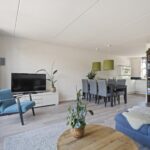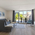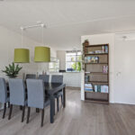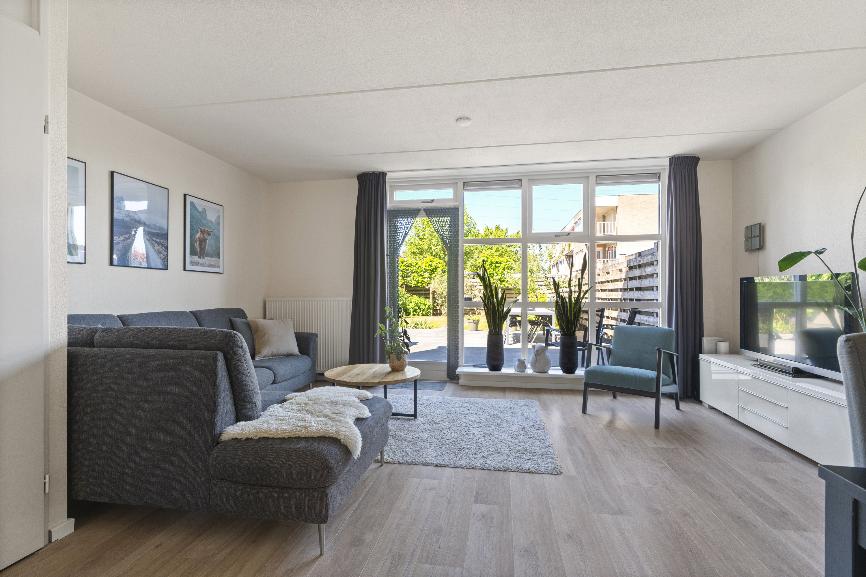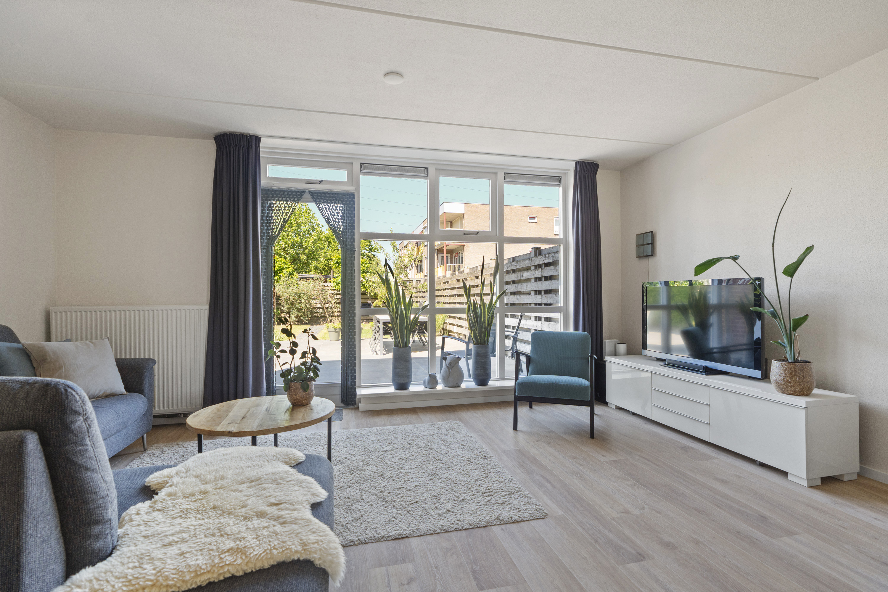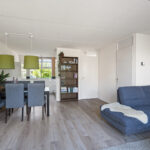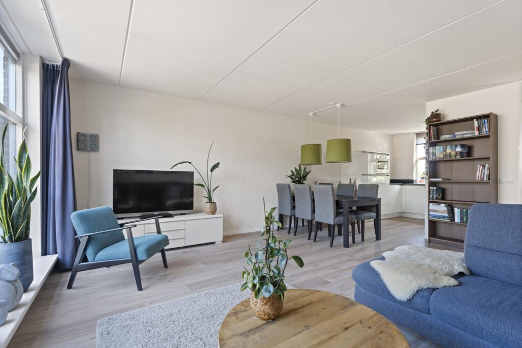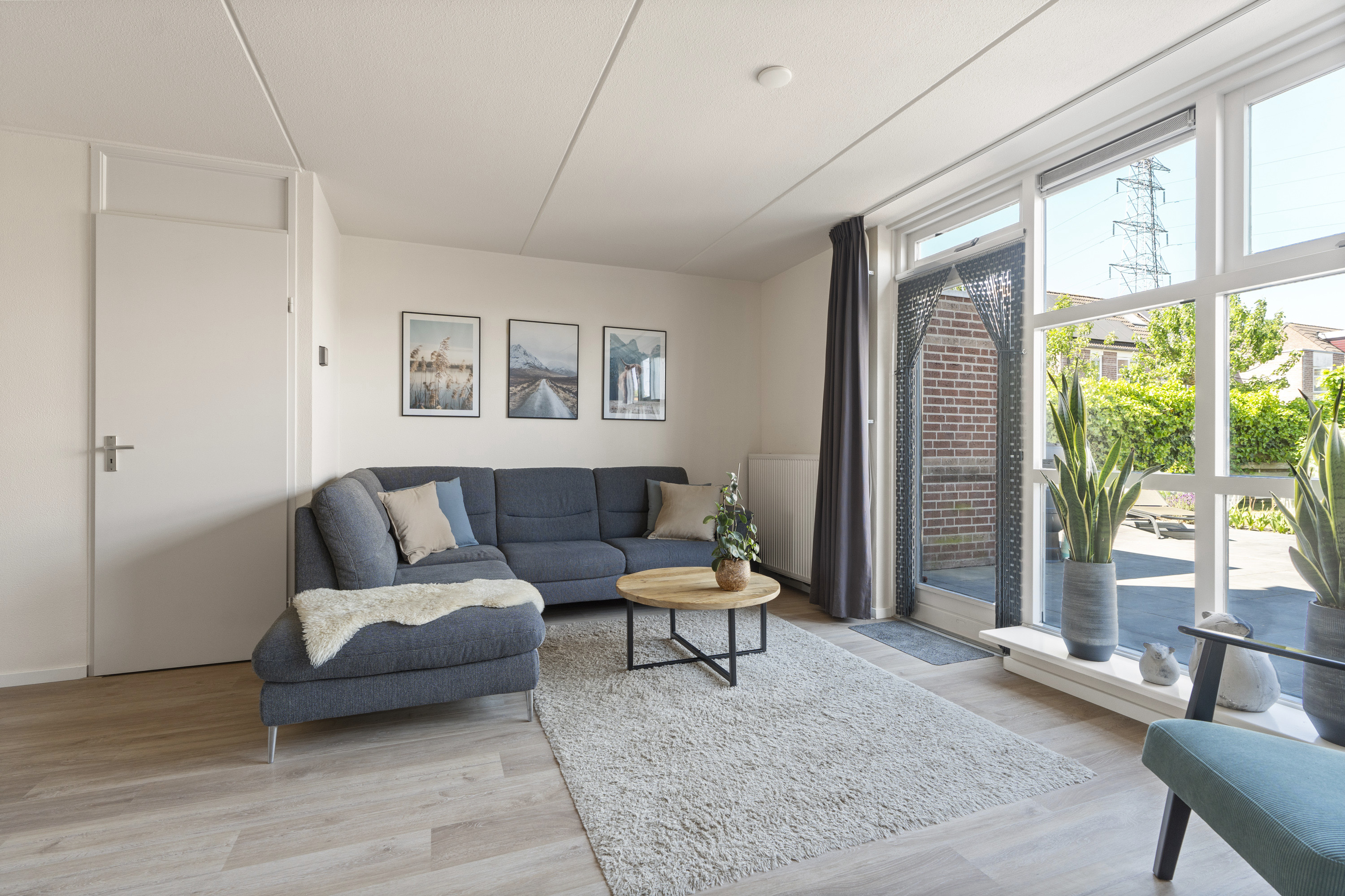 De woonkamer is aan de achterzijde gelegen, waardoor je een zicht hebt op de diepe achtertuin. Het raam is voorzien van een vakverdeling wat zorgt voor een speels effect. De woonkamer is van goed formaat waardoor je hier eenvoudig een grote hoekbank en een 6-persoons eettafel kwijt kan. Op de vloer ligt een lichte laminaatvloer wat het ruimtelijke gevoel versterkt. Via de tuindeur loop je zo de achtertuin in. In de hoek van de kamer is een trapkast aanwezig waardoor je hier veel praktische opbergruimte treft.