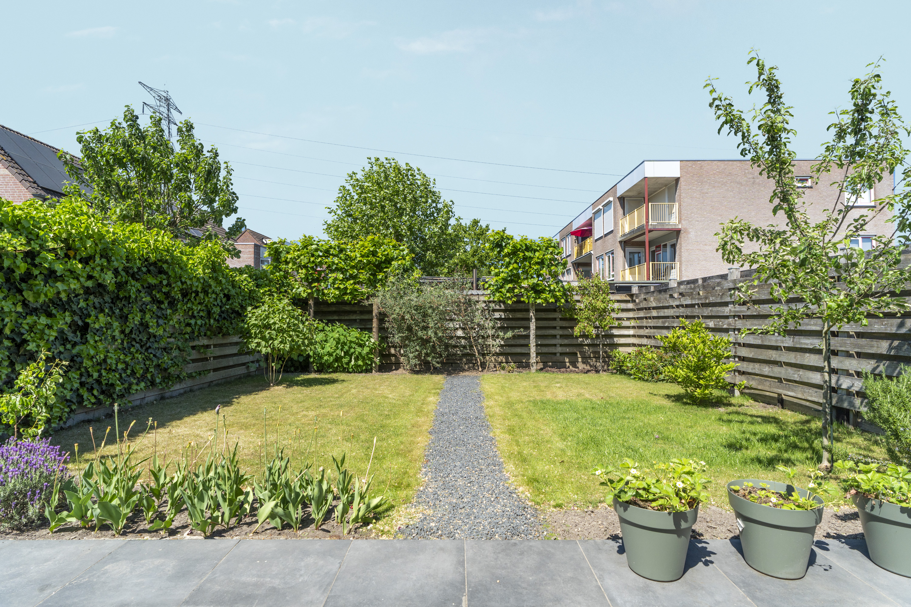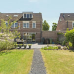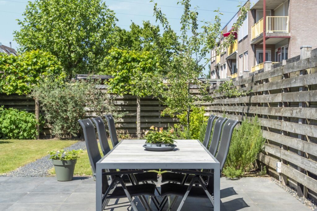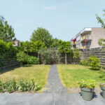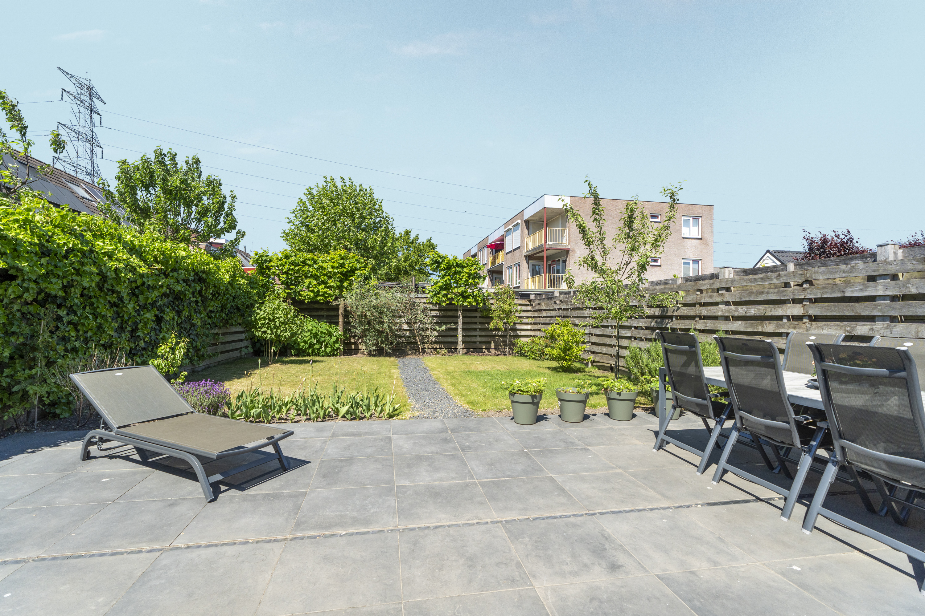 De achtertuin heeft een mooie diepte en door de aangebouwde garage ook een goede breedte. De tuin is overzichtelijk aangelegd met een terras, een gazon en bloemrijke borders. Groot formaat tegels zorgen voor een moderne uitstraling in de tuin. Een drain afvoer in het midden zorgt daarbij voor een goede afwatering op het royale terras. Doordat de achtergelegen woningen dwars op deze woning staat geniet je hier tevens van relatief veel ‘lucht’.