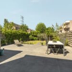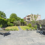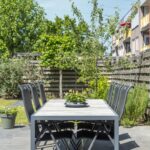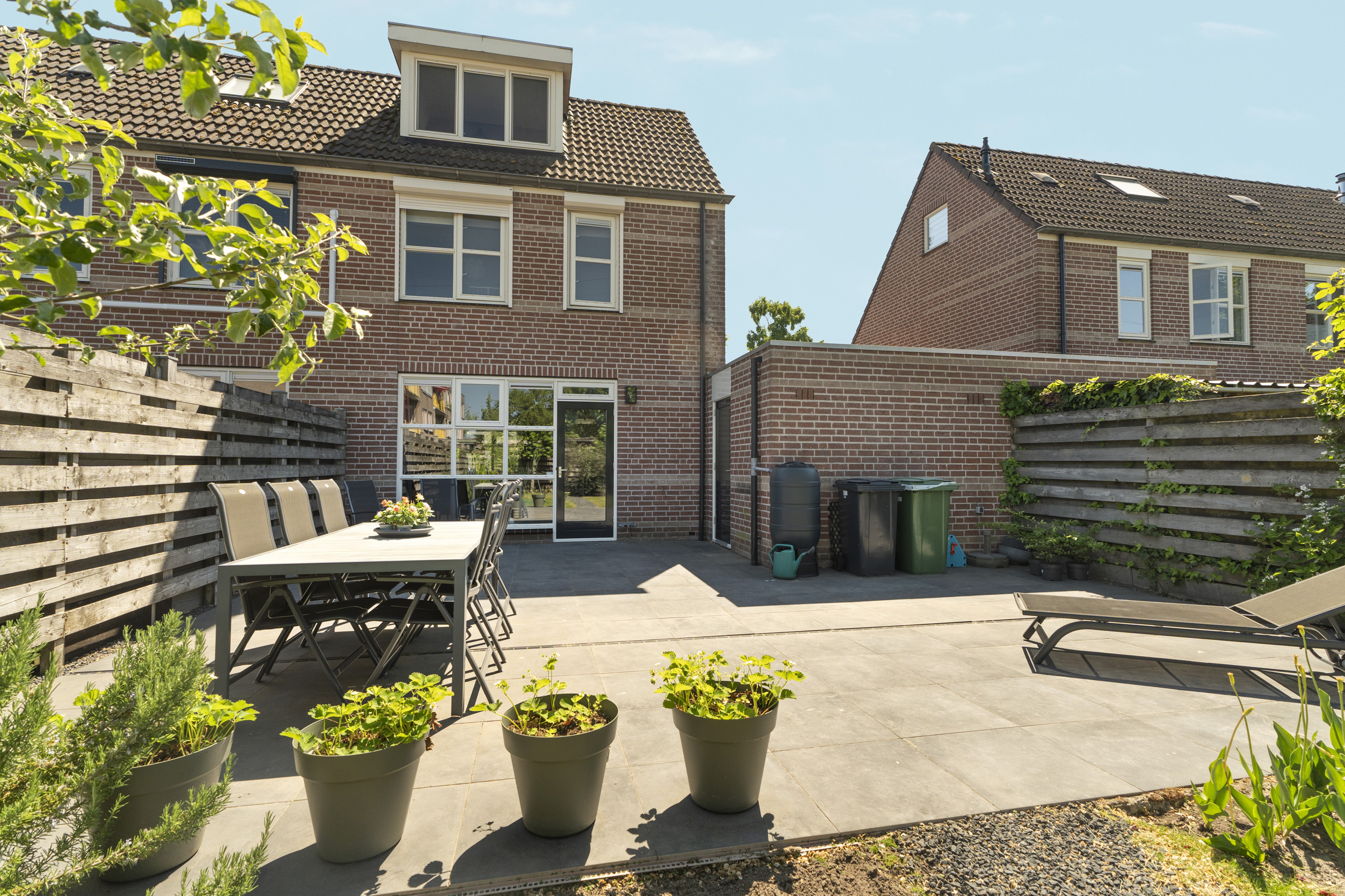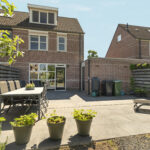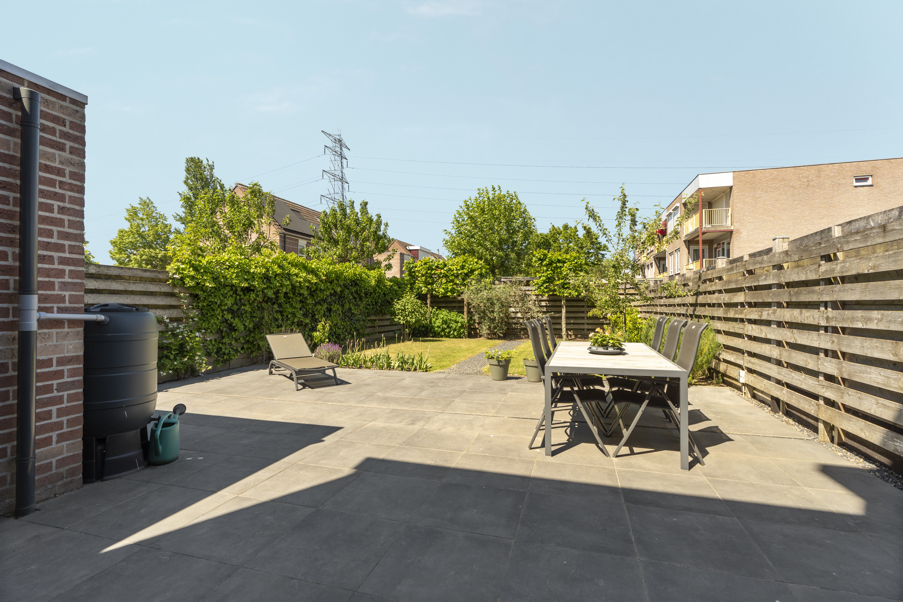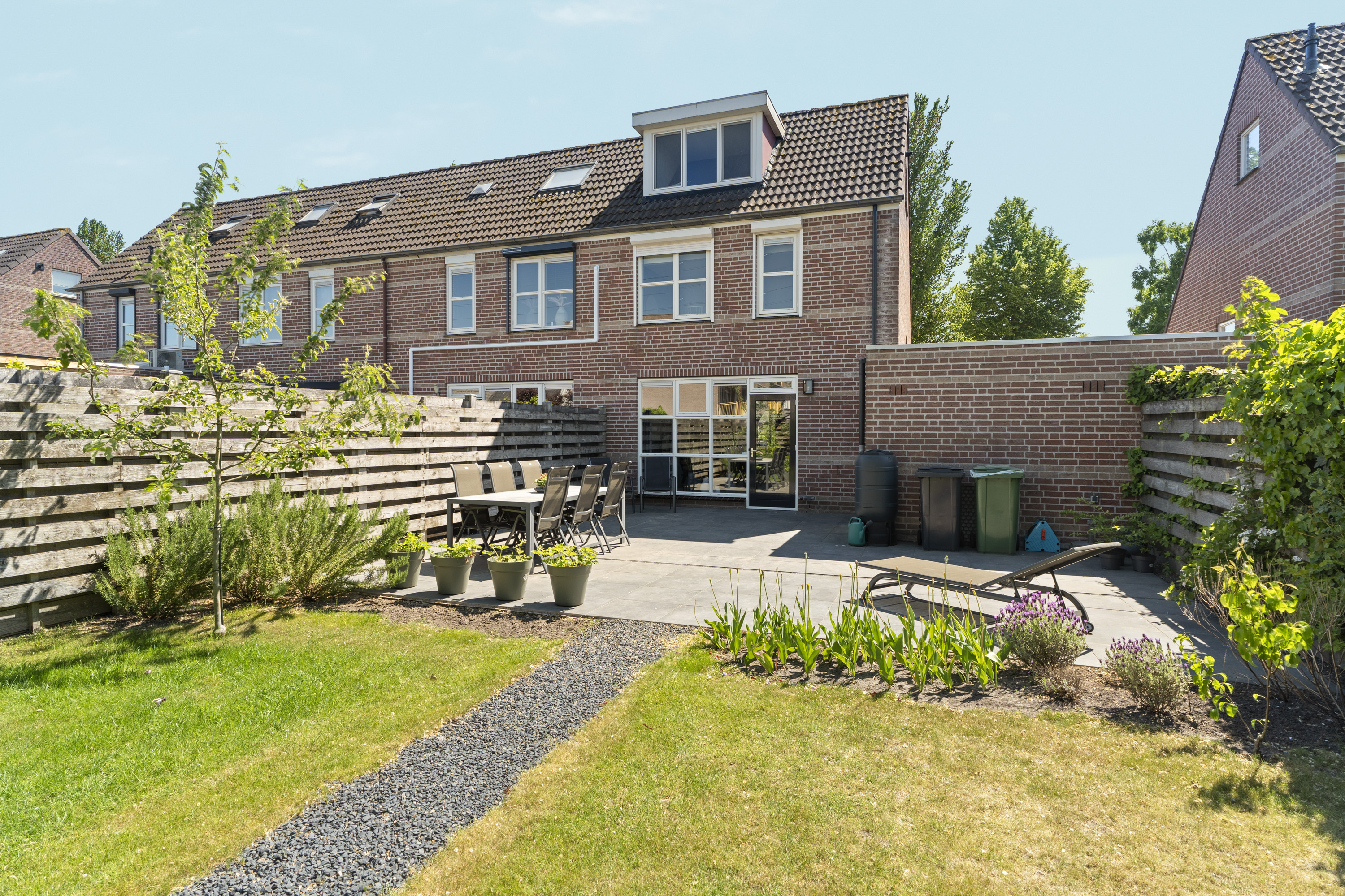 De achtertuin heeft een mooie diepte en door de aangebouwde garage ook een goede breedte. De tuin is overzichtelijk aangelegd met een terras, een gazon en bloemrijke borders. Groot formaat tegels zorgen voor een moderne uitstraling in de tuin. Een drain afvoer in het midden zorgt daarbij voor een goede afwatering op het royale terras. Doordat de achtergelegen woningen dwars op deze woning staat geniet je hier tevens van relatief veel ‘lucht’.