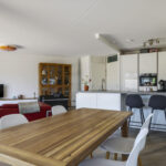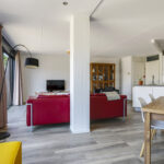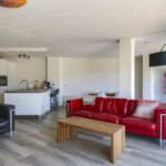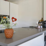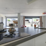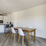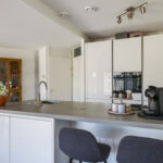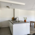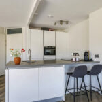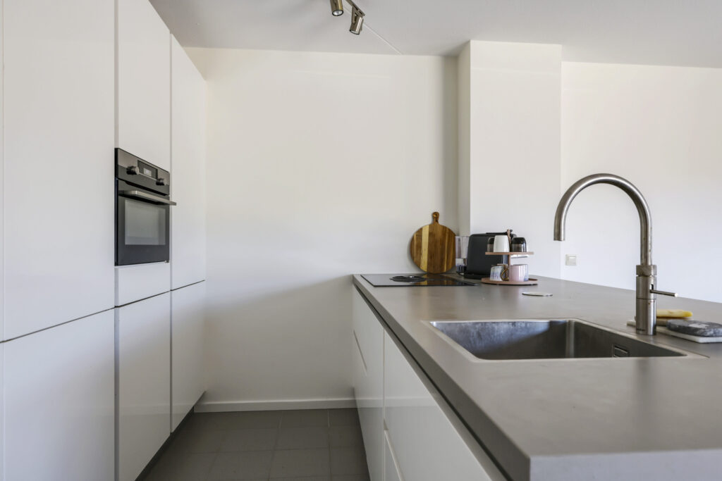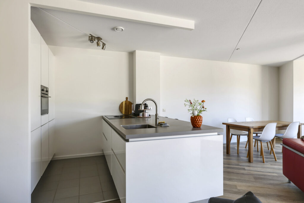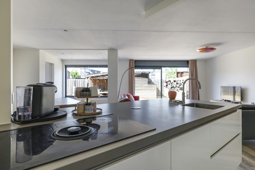 In 2019 is de keuken hier flink aangepakt. Origineel is er een scheidingswand aanwezig tussen de woonkamer en de keuken waardoor het een halfopen keuken betrof. Echter is bij deze woning de scheidingswand verwijderd waardoor er ruimte is ontstaan voor een luxe eilandkeuken. Tegen de achterwand is een hoge kastenwand geplaatst met o.a. een koel/vriescombinatie, een oven en extra veel opbergruimte. Daarvoor staat een lekker breed kookeiland waar een kookliefhebber zijn hart kan ophalen. Het is eiland is voorzien van een inductiekookplaat met geïntegreerde afzuiging, een vaatwasser en een spoelbak met Quooker. Een leuk detail is de bar aan het eiland, hieraan neem je rustig de dag door tijdens het koken.