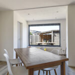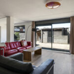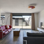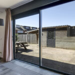 Uitgebouwde woonkamer met brede schuifpui en trapkast