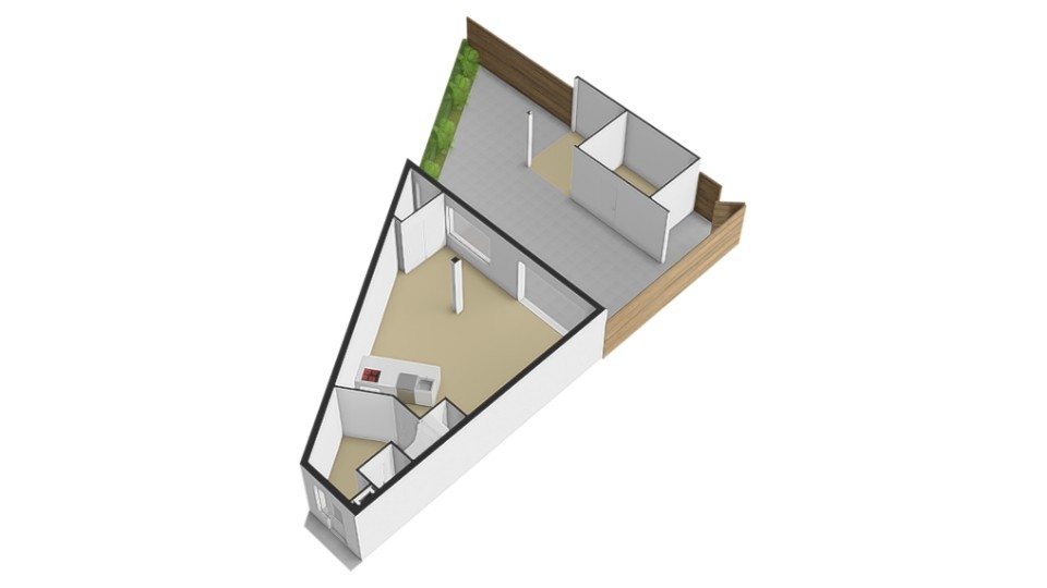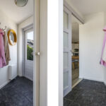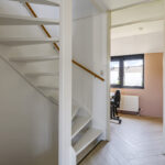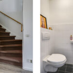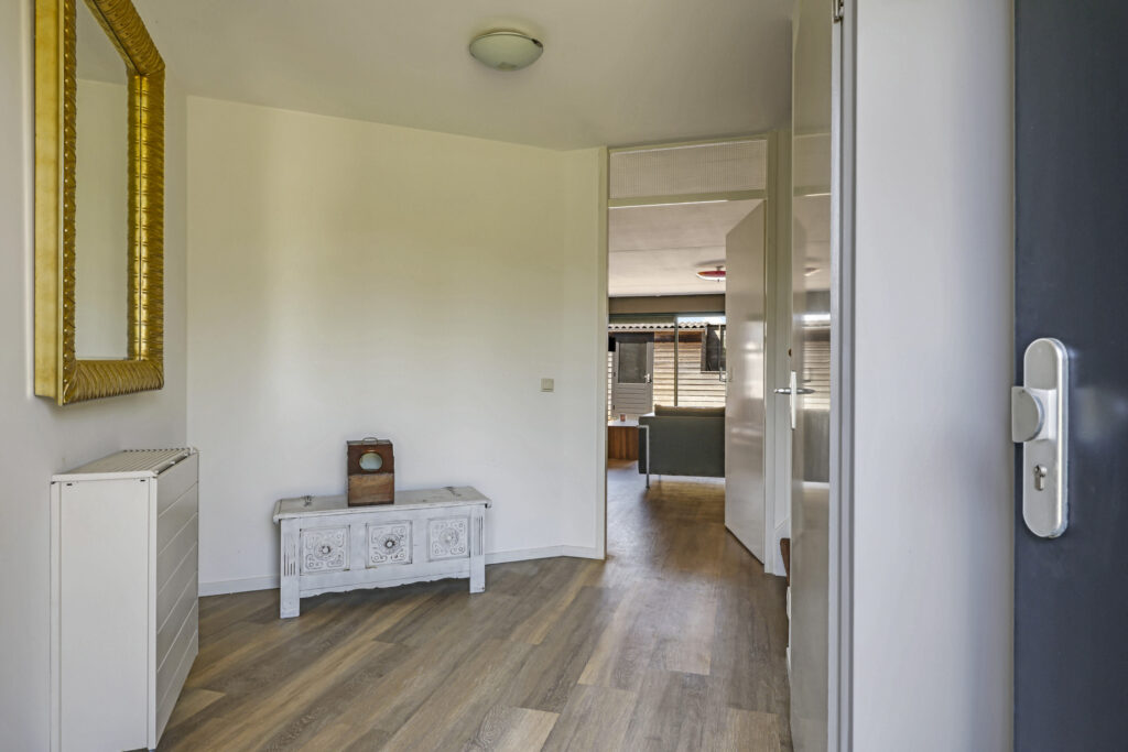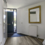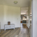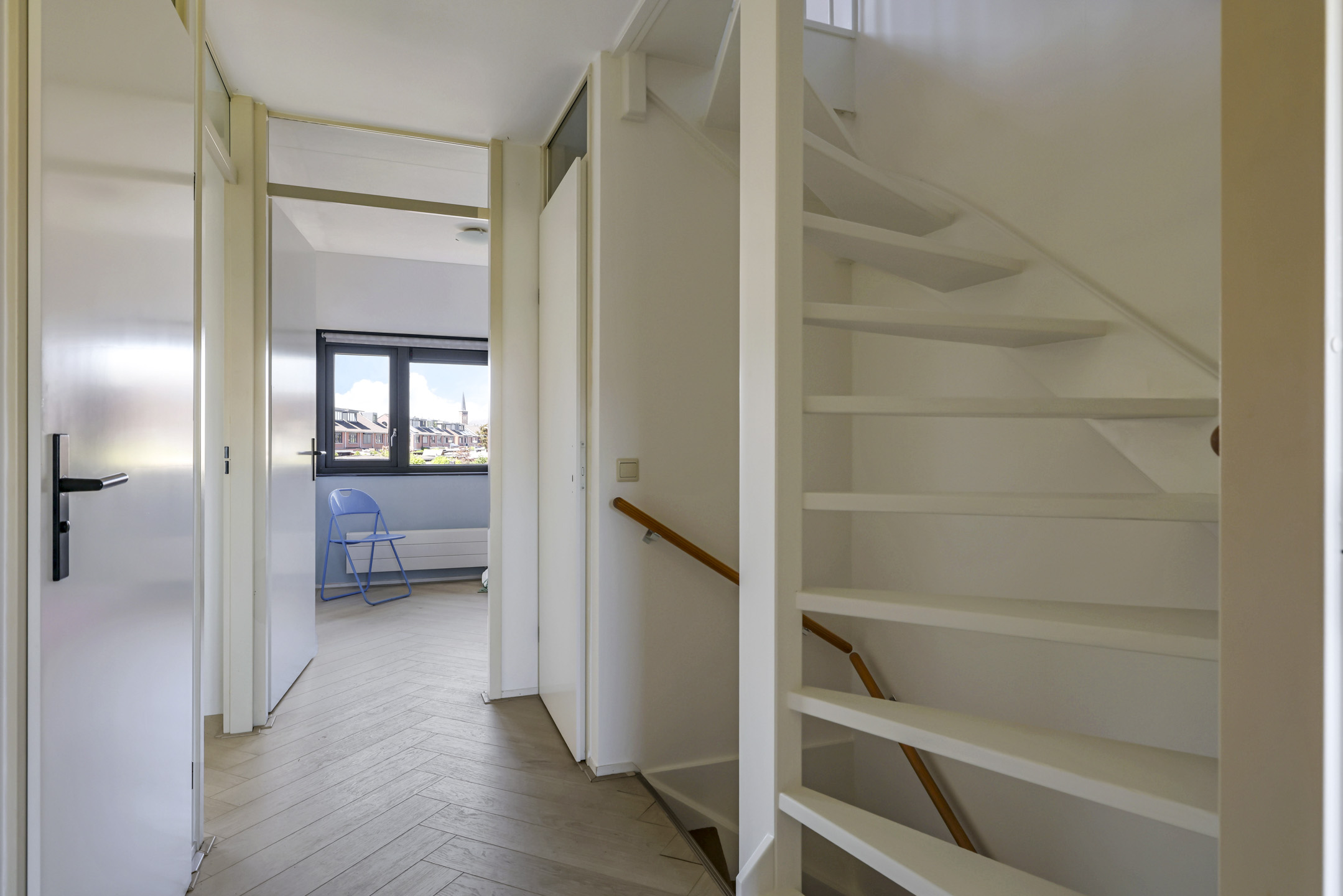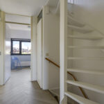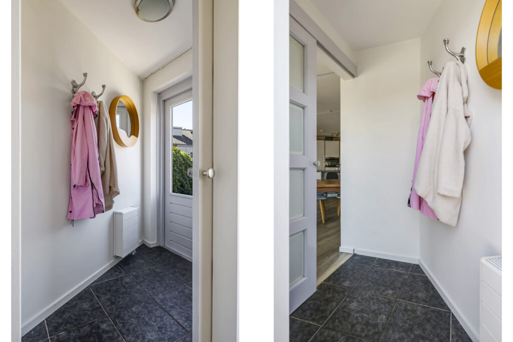 Wanneer je bij de voordeur staat, verwacht je zeker niet dat er zoveel ruimte nog achter deze deur schuilt. Bij binnenkomst in de hal ben je dan ook direct verrast over de indeling van de woning. De linker gevel loopt schuin weg waardoor de woning steeds breder wordt. In de hal alleen al zorgt dit voor veel extra opbergruimte. Ideaal om bijvoorbeeld de kinderwagen te plaatsen. In de hal bevindt zich tevens het toilet, welke zwevend is geplaatst en voorzien is van een fonteintje.
