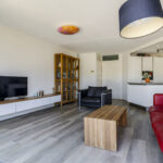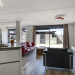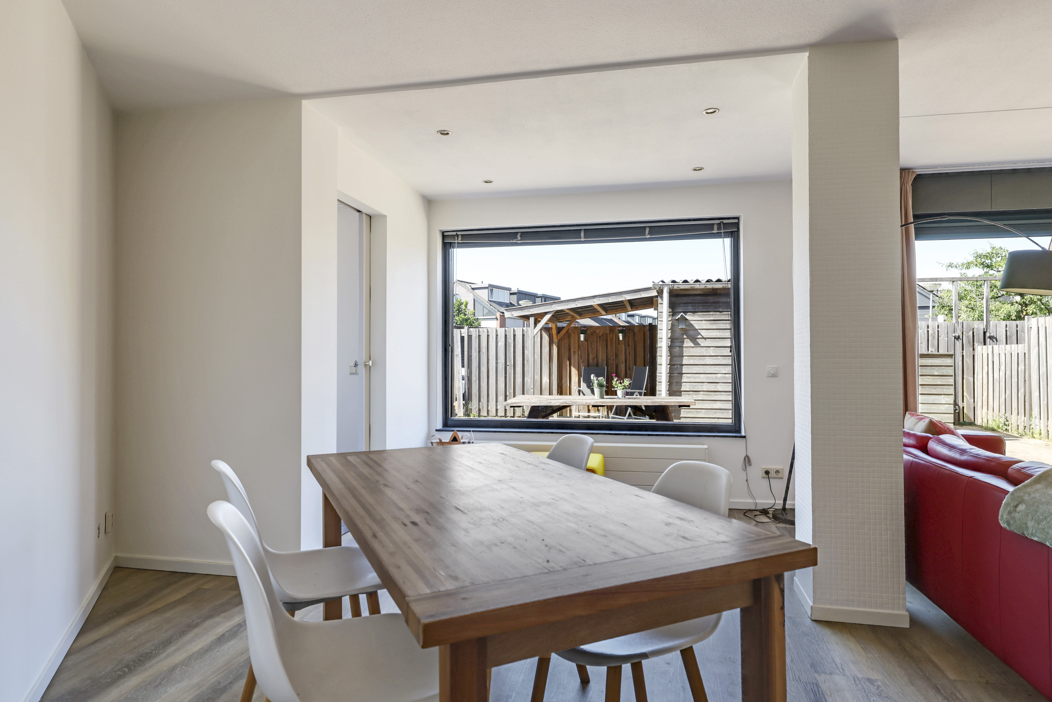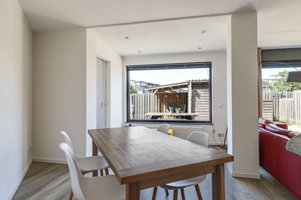 De woonkamer zal je direct verrassen door de breed uitlopende ruimte en het vele glasoppervlak. Direct bij de bouw van de woning er een uitbouw geplaatst. Hierbij is het rechter gedeelte van de kamer al dieper geworden dan de standaard. Later is de woning zelfs nog een 2e keer uitgebouwd waardoor de woning nu over de hele woonlaag dezelfde diepte heeft. In de hoek is nog een hal gecreëerd waar je fijn je jas en schoenen kwijt kan wanneer je achterom komt. Opvallend is het vele glasoppervlak waardoor je heel veel lichtinval treft. De pvc-vloer en de gestucte wanden zorgen hier voor een strakke uitstraling.