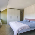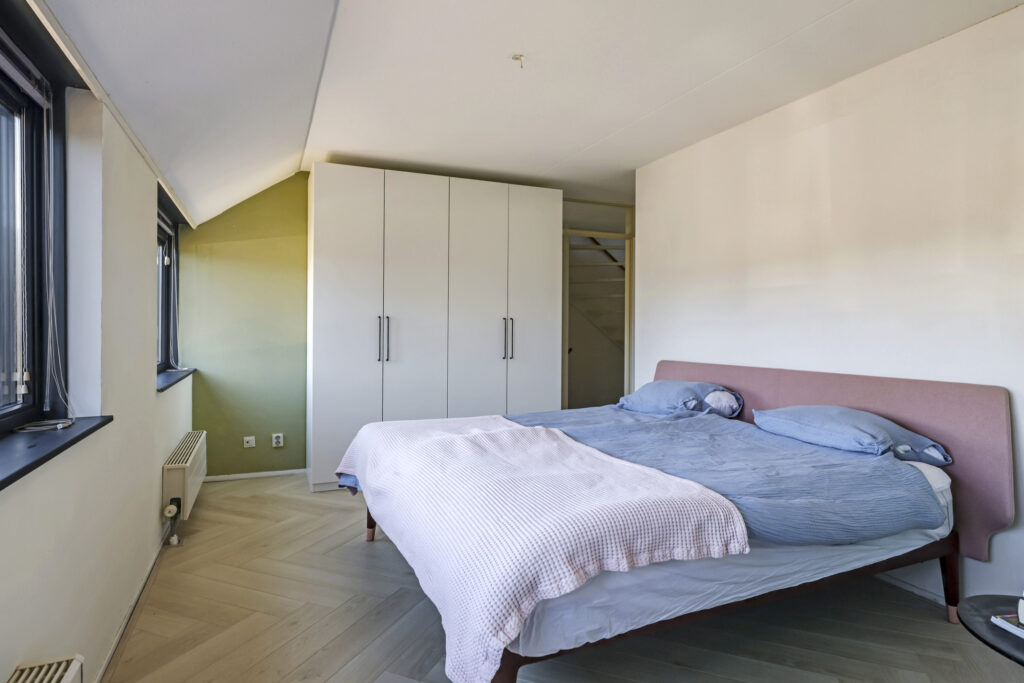 Via de trapopgang in de hal komen we op de 1e verdieping terecht. Hier schakelt de overloop 3 slaapkamers en de badkamer aan elkaar. De kamer die direct opvalt is de hoofdslaapkamer. Hier zie je de schuine wand goed terugkomen wat zorgt voor veel ruimte op de kamer. Voldoende voor kasten of zelfs een werkhoek. Ook de andere 2 kamers zijn goed bemeten. Op de vloer ligt een eenduidige laminaatvloer welke in het moderne visgraatpatroon is gelegd. Erg praktisch is de vaste inbouwkast op de overloop welke zorgt voor veel extra opbergruimte.