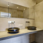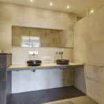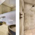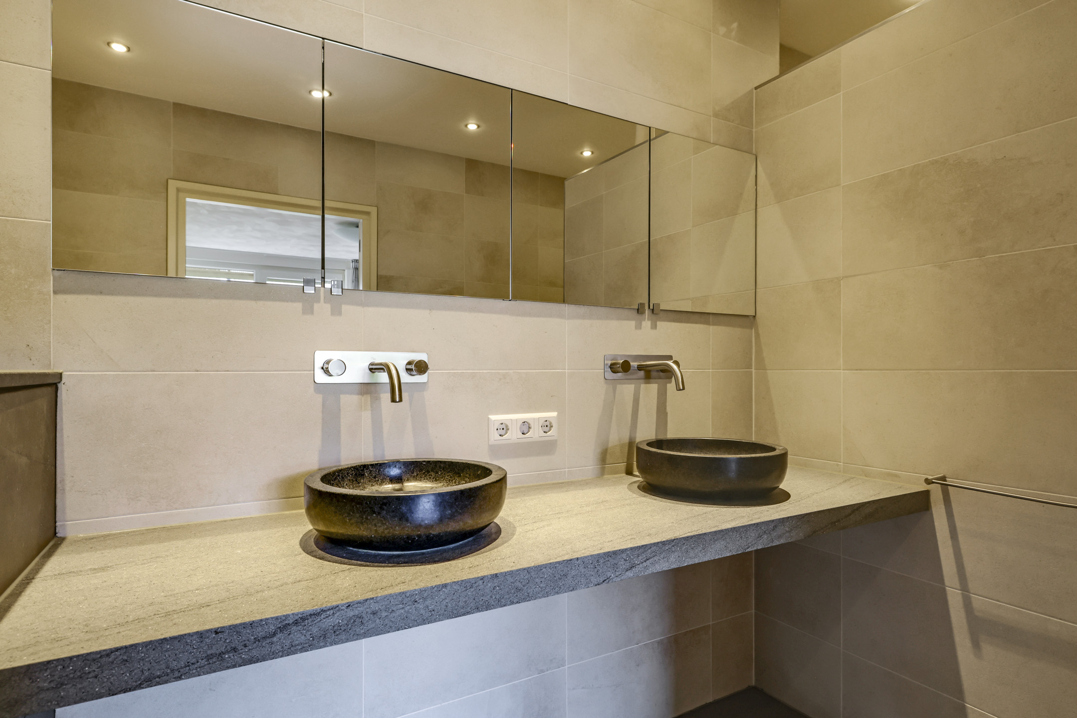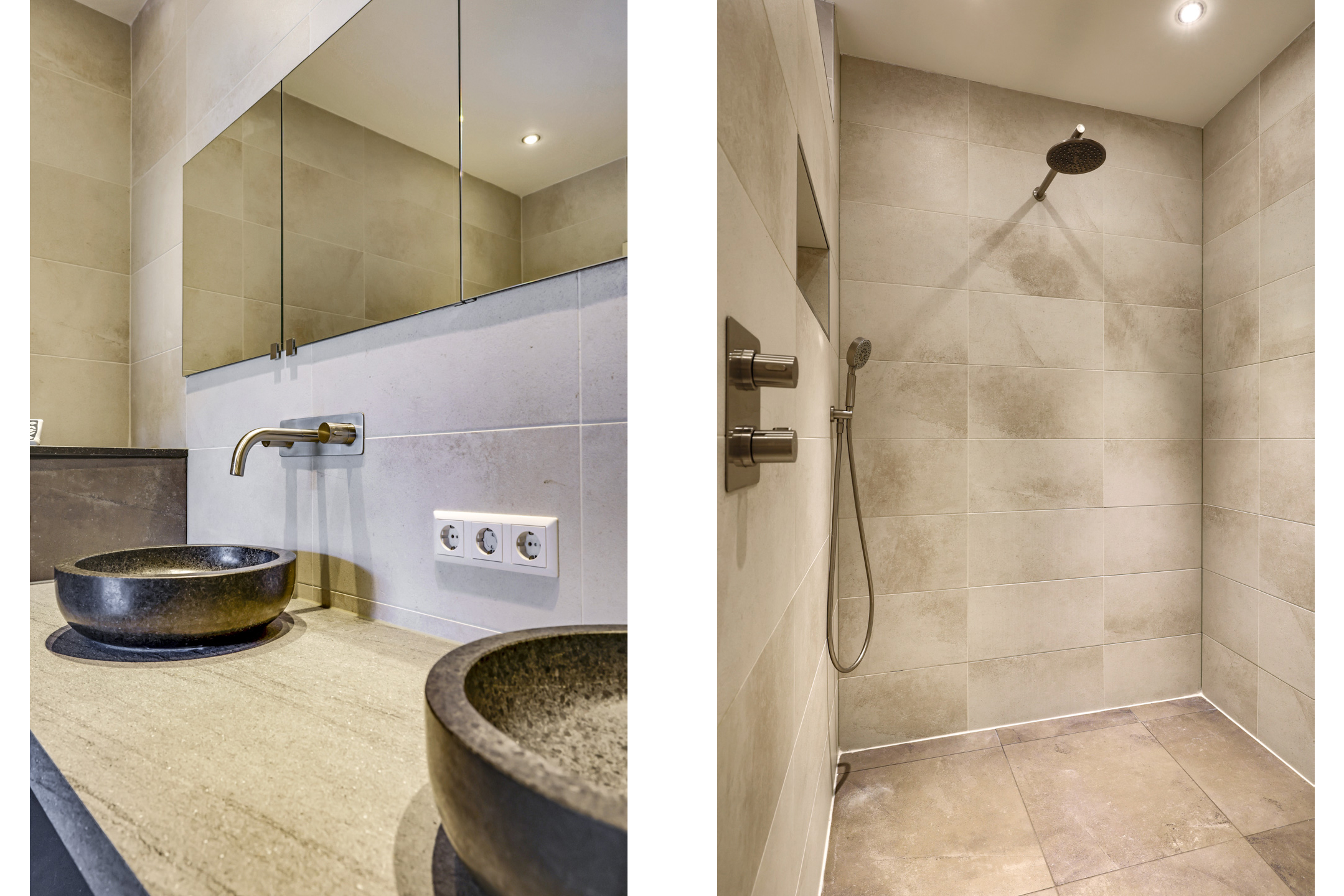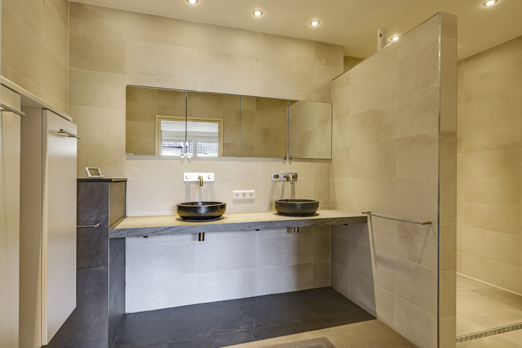 Badkamer met dubbel wastafelmeubel en inloopdouche.
