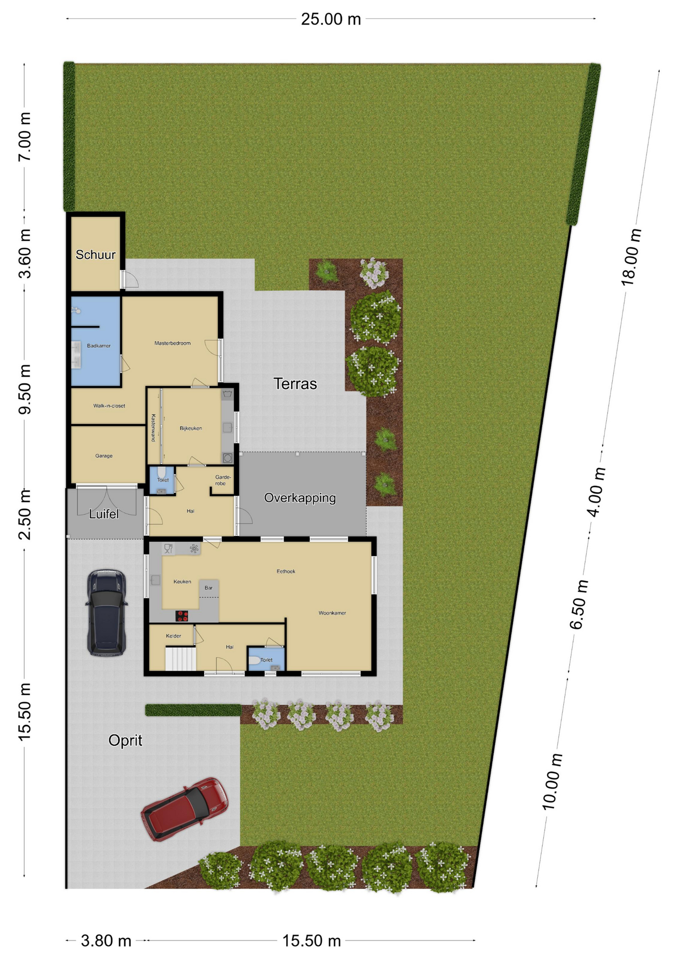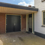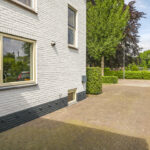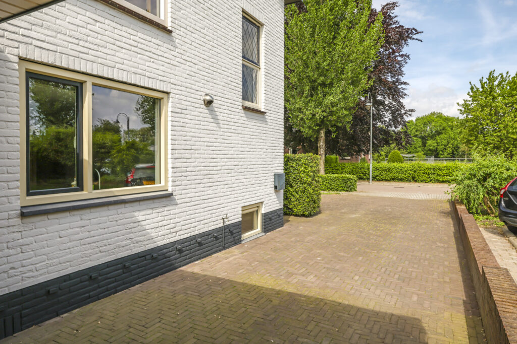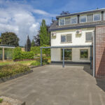 Aan de voorzijde is een comfortabele, brede oprit gelegen van 18 (!) meter lang. Dit is inclusief de luifel bij de voordeur waardoor je er altijd droog staat. Door deze lengte kun je met gemak 3 tot 4 auto’s achter elkaar parkeren. Het voorste gedeelte is verbreed waardoor je een auto ook nog schuin naar de zijkant kunt parkeren. Dit is erg handig wanneer je 2 auto’s hebt. Je hoeft elkaar daardoor niet in de weg te staan.