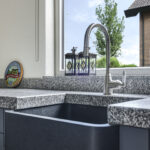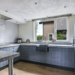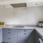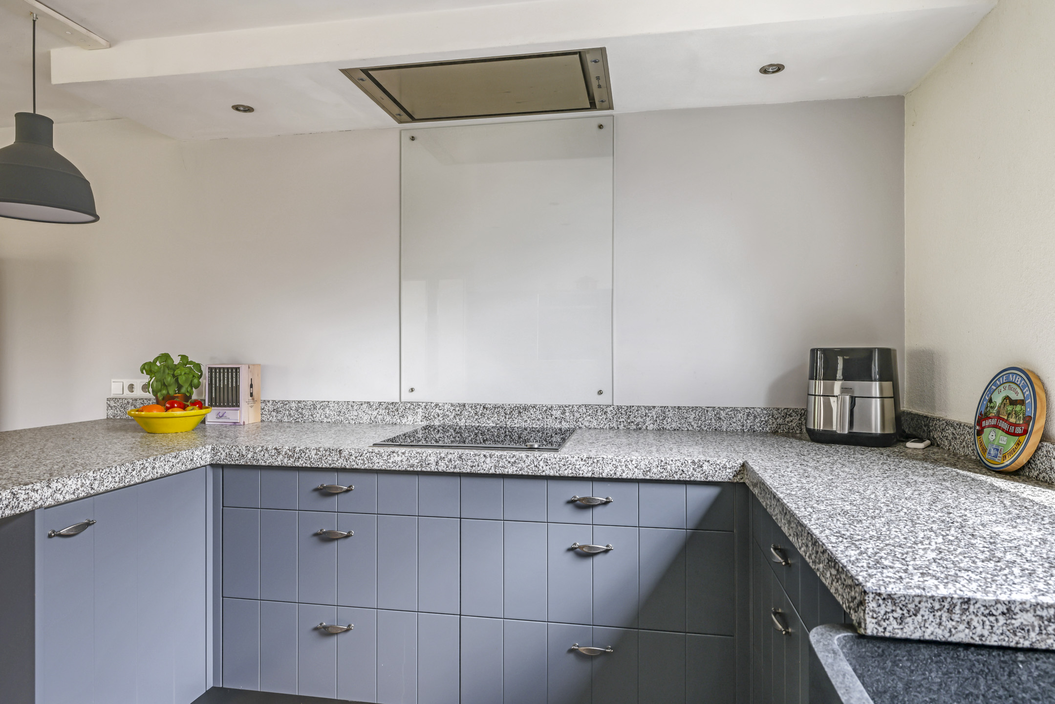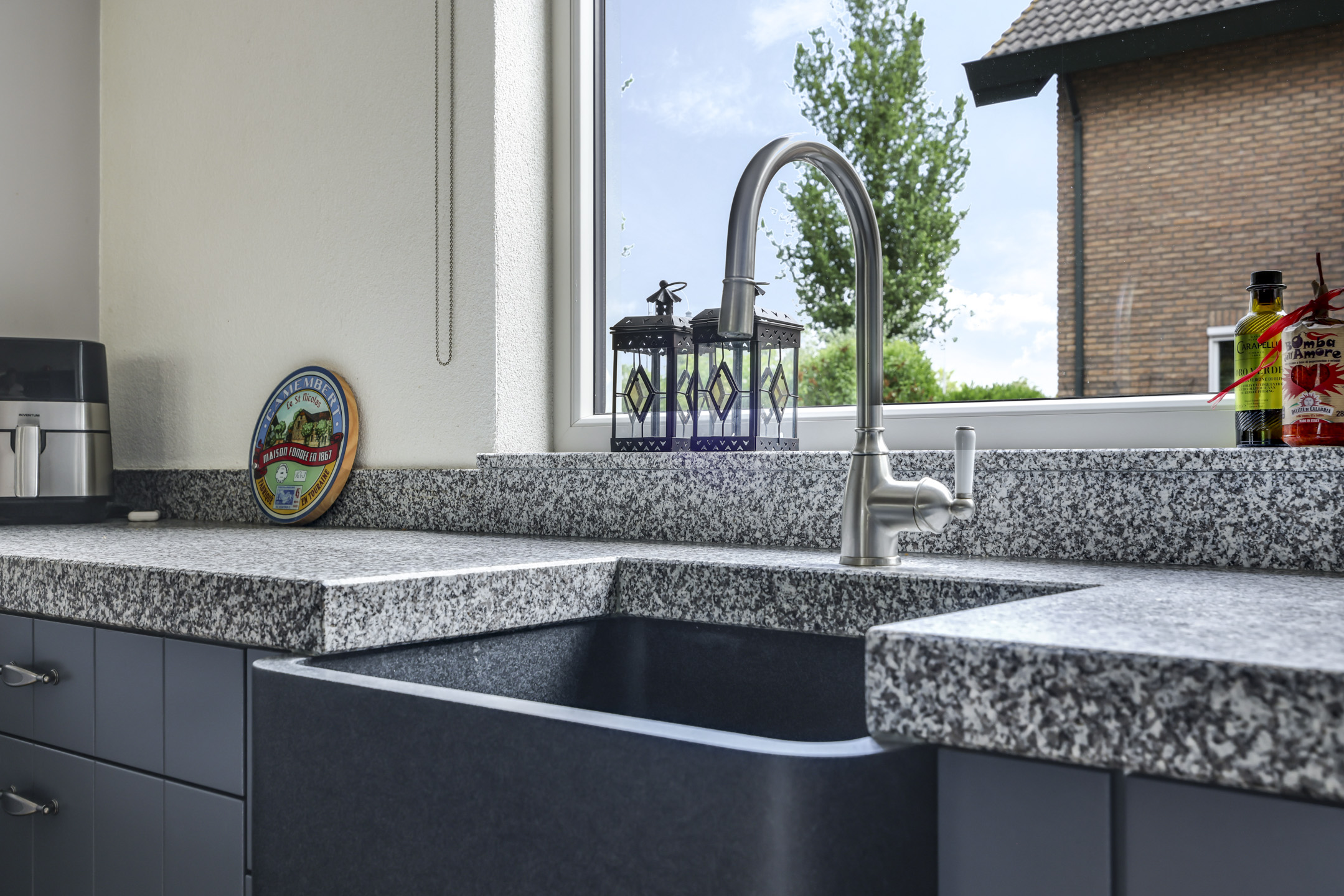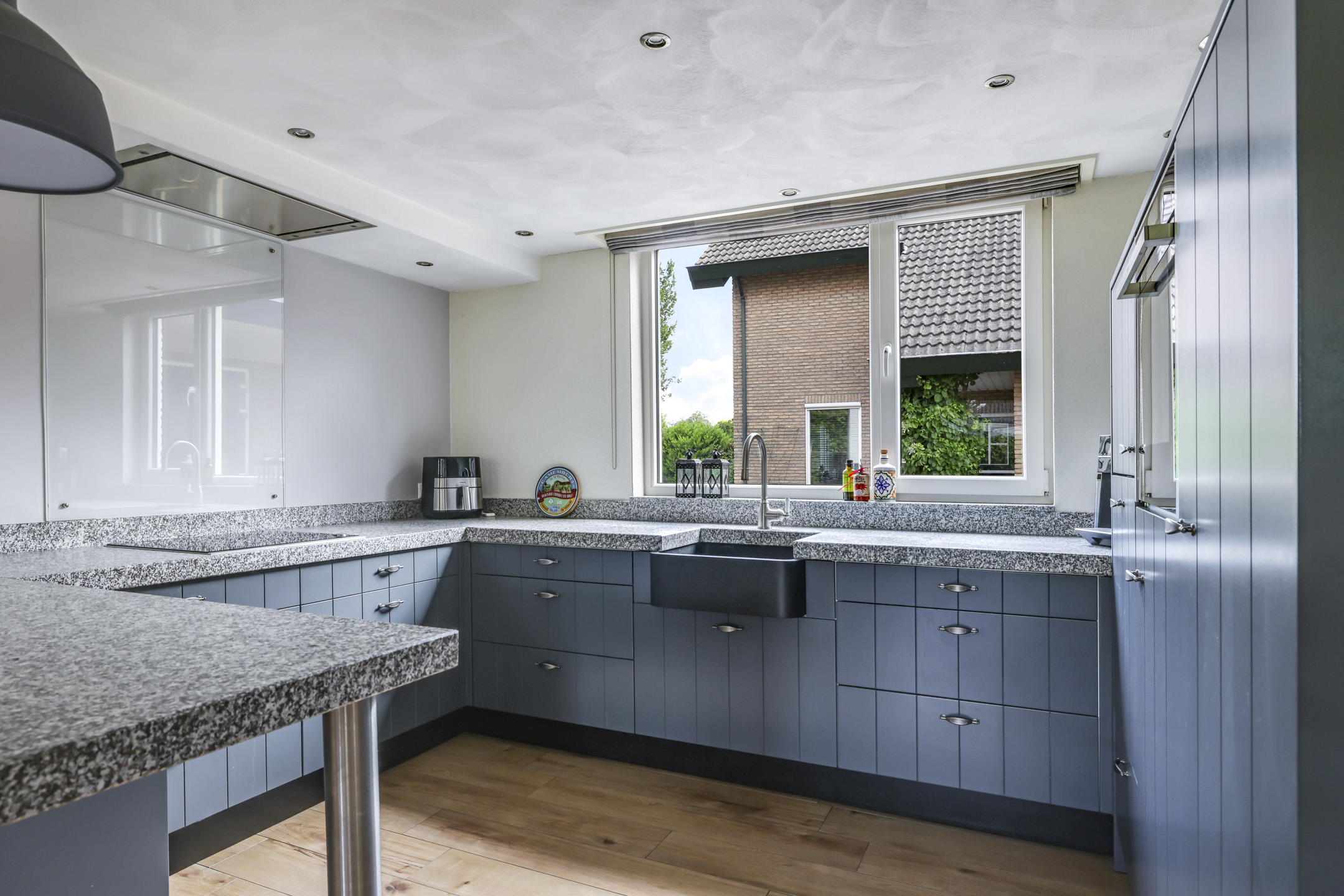 Benedenwoning heeft een luxe inbouwkeuken met o.a. een dik granieten werkblad en natuurstenen gootsteen