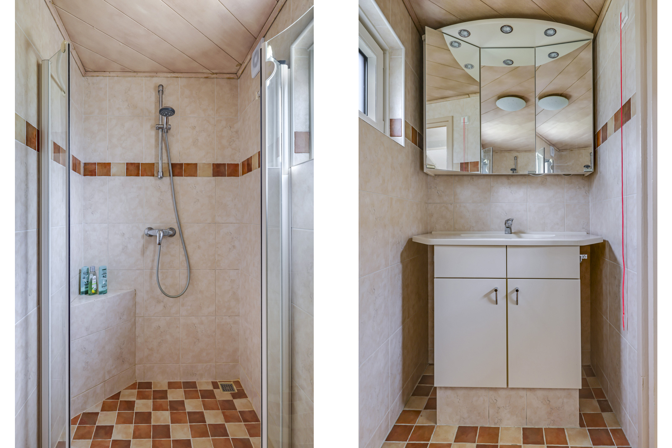 De woning heeft geen volwaardige garage meer, maar de ‘inpandige’ schuur is ideaal als stallingsruimte voor fietsen en/of een motor. Het heeft dubbele deuren waardoor deze ruimte goed toegankelijk is. Overigens is het meer dan alleen een stallingsruimte. Hier vinden we namelijk ook de warmtepomp en elektrische boiler terug.