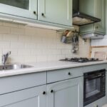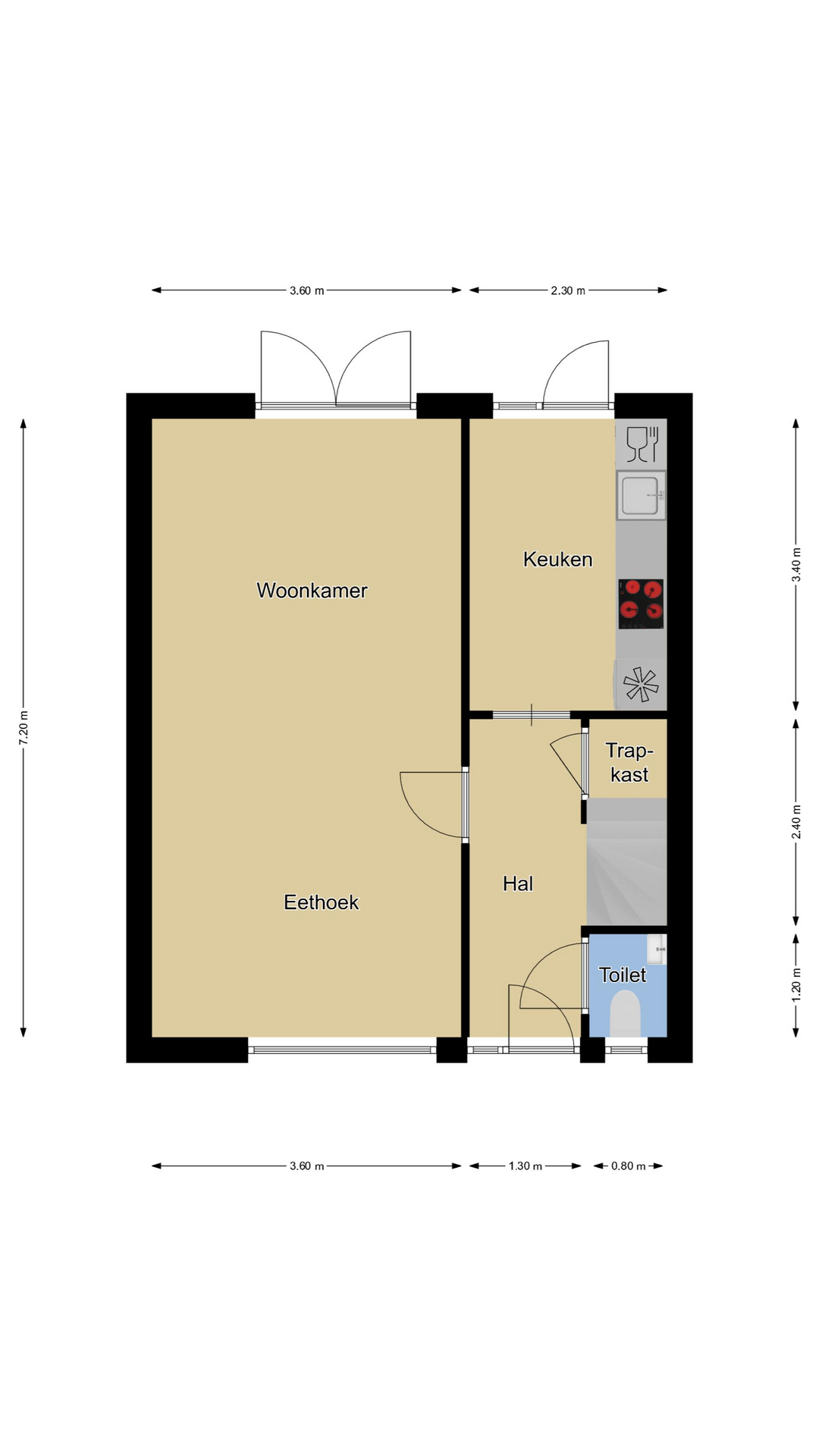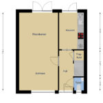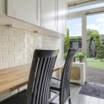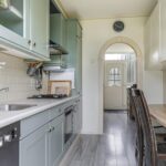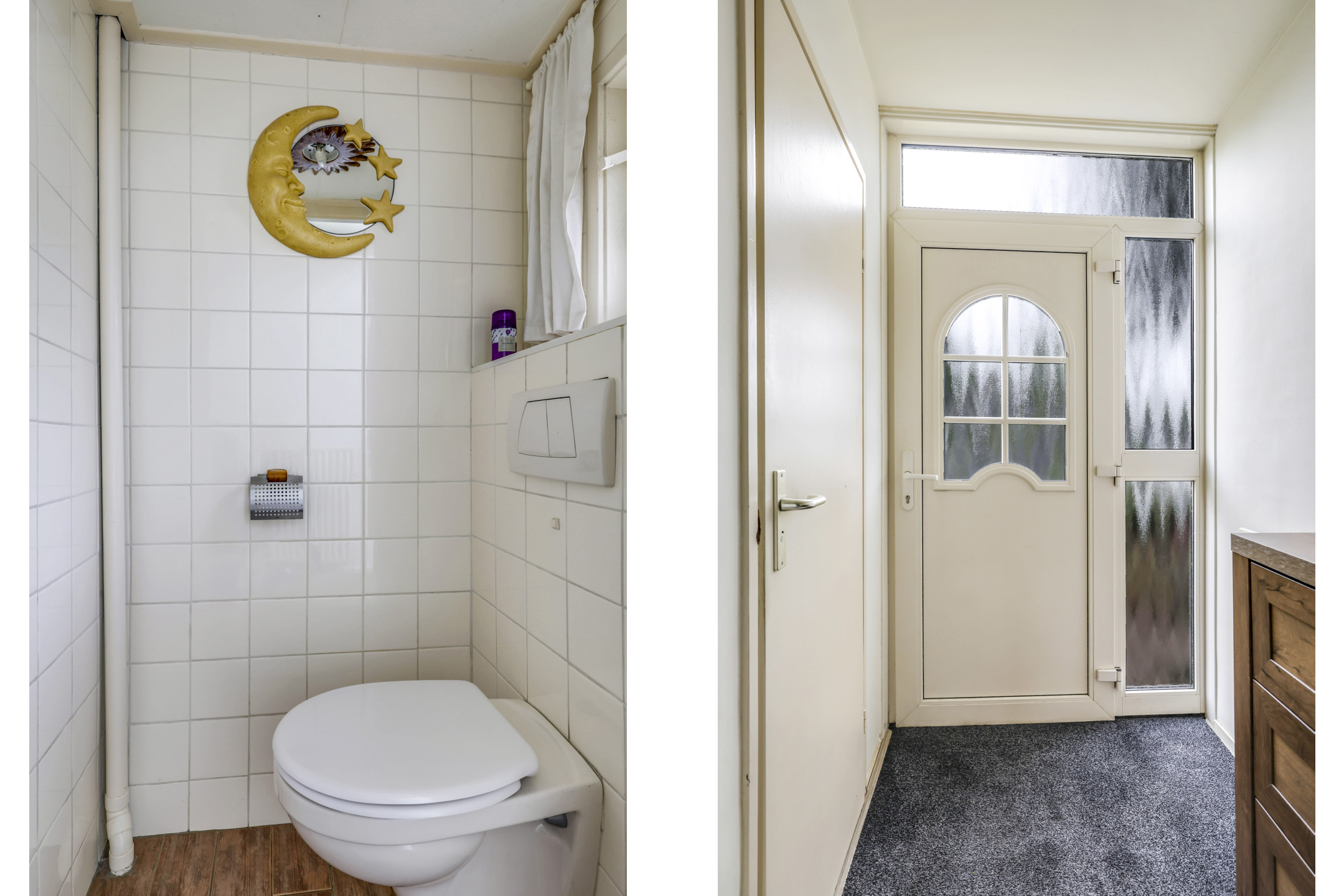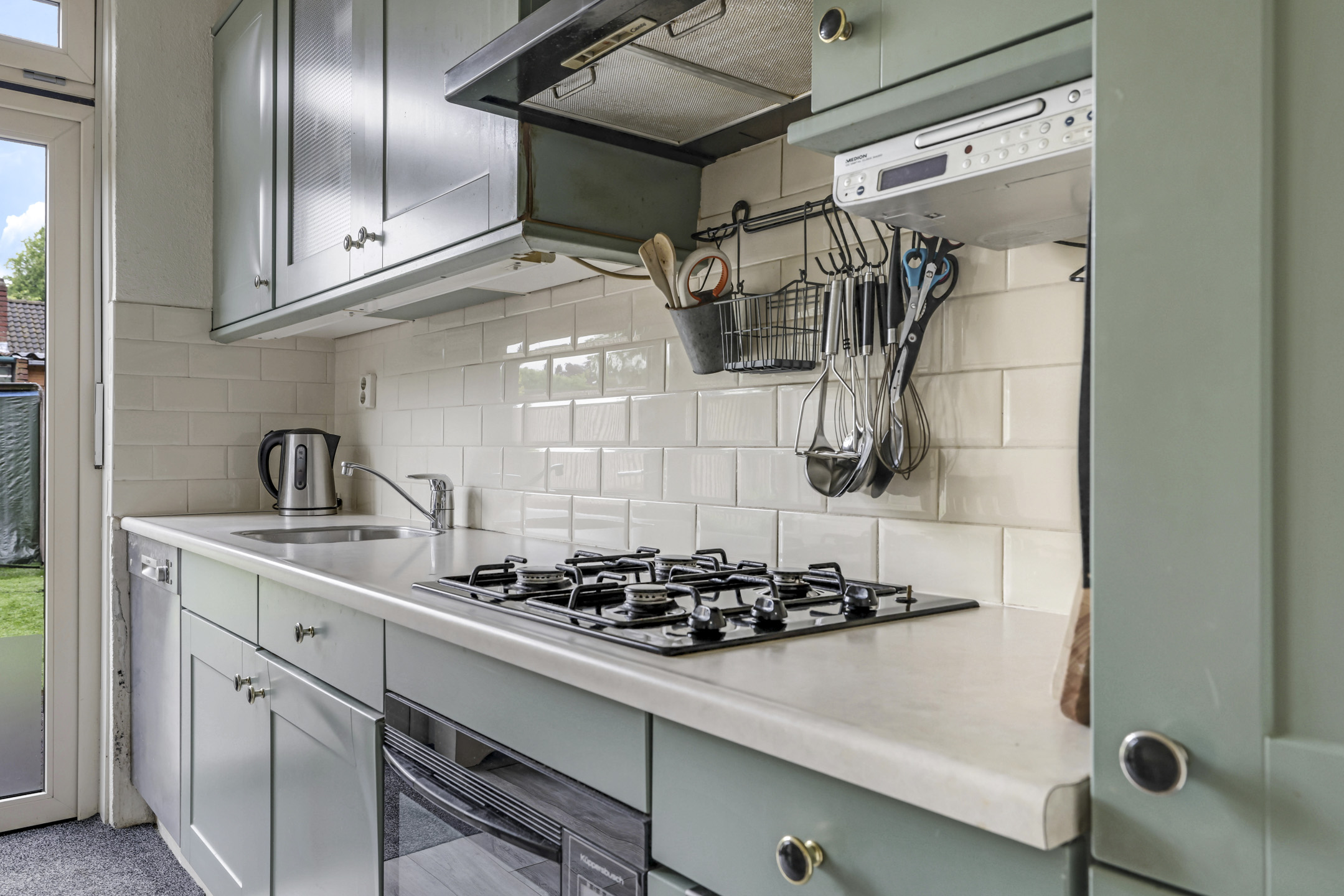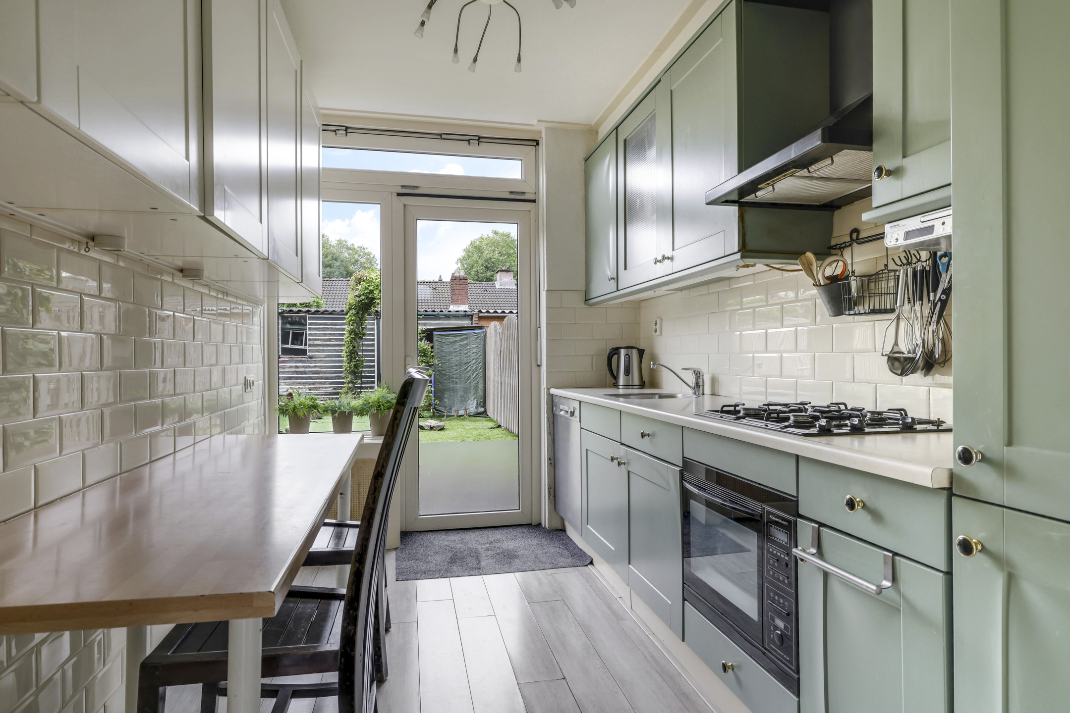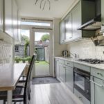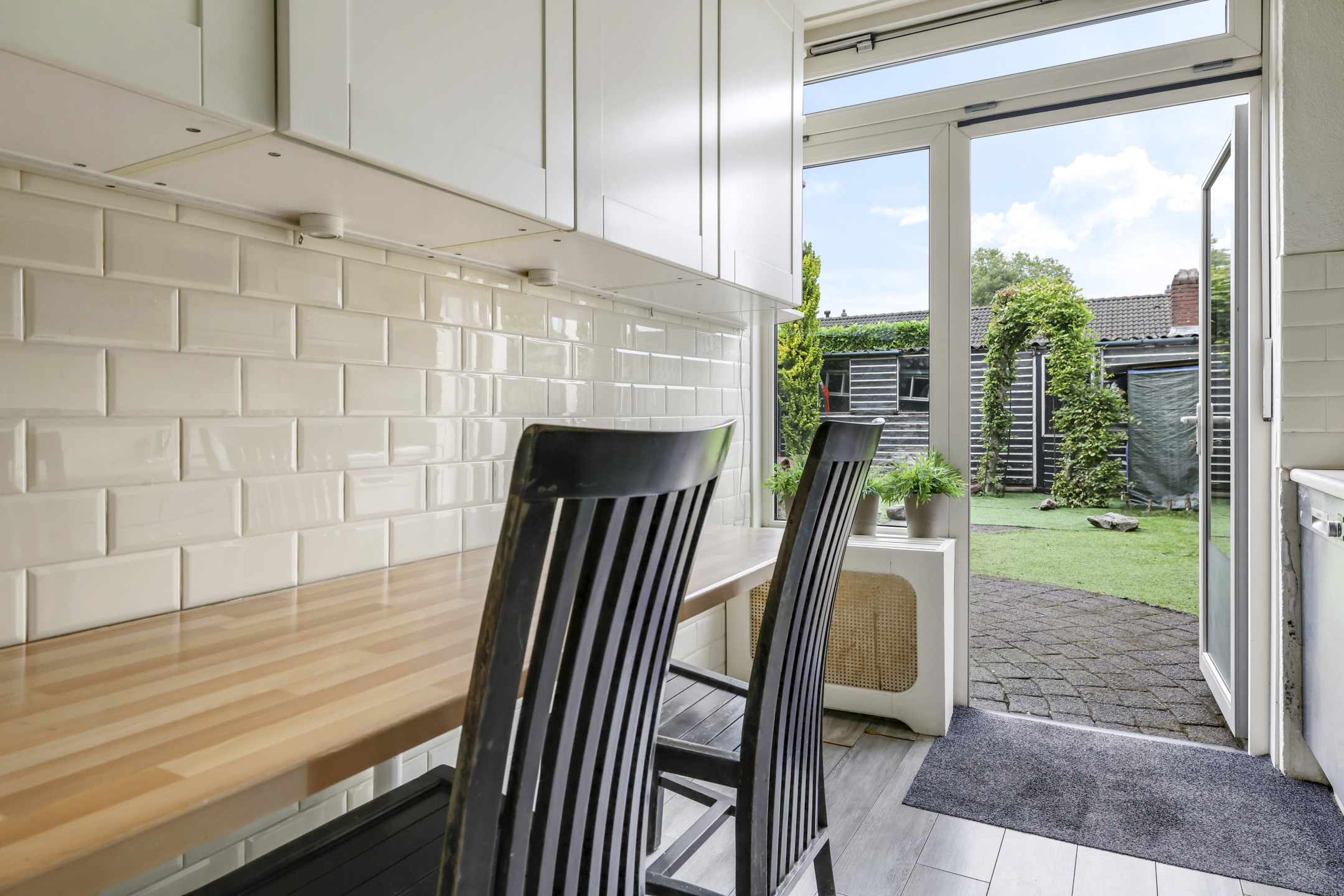 De keuken bevindt zich aan de achterzijde van de woning en betreft een dichte keuken. Mocht je het wensen dan kan je een open keuken creëren door de scheidingswand met de woonkamer te verwijderen. Door dan de toegangsdeur tot de huidige keuken dicht te maken ontstaat er ruimte voor bijvoorbeeld een hoekkeuken. Mocht je toch liever een dichte keuken houden, dan kan je ervoor kiezen om de keuken uit te breiden met een 2e keukenblok tegenover het huidige blok of een ontbijtbar. In de keuken is tevens een tuindeur aanwezig waardoor je ook vanuit hier direct de tuin in loopt.