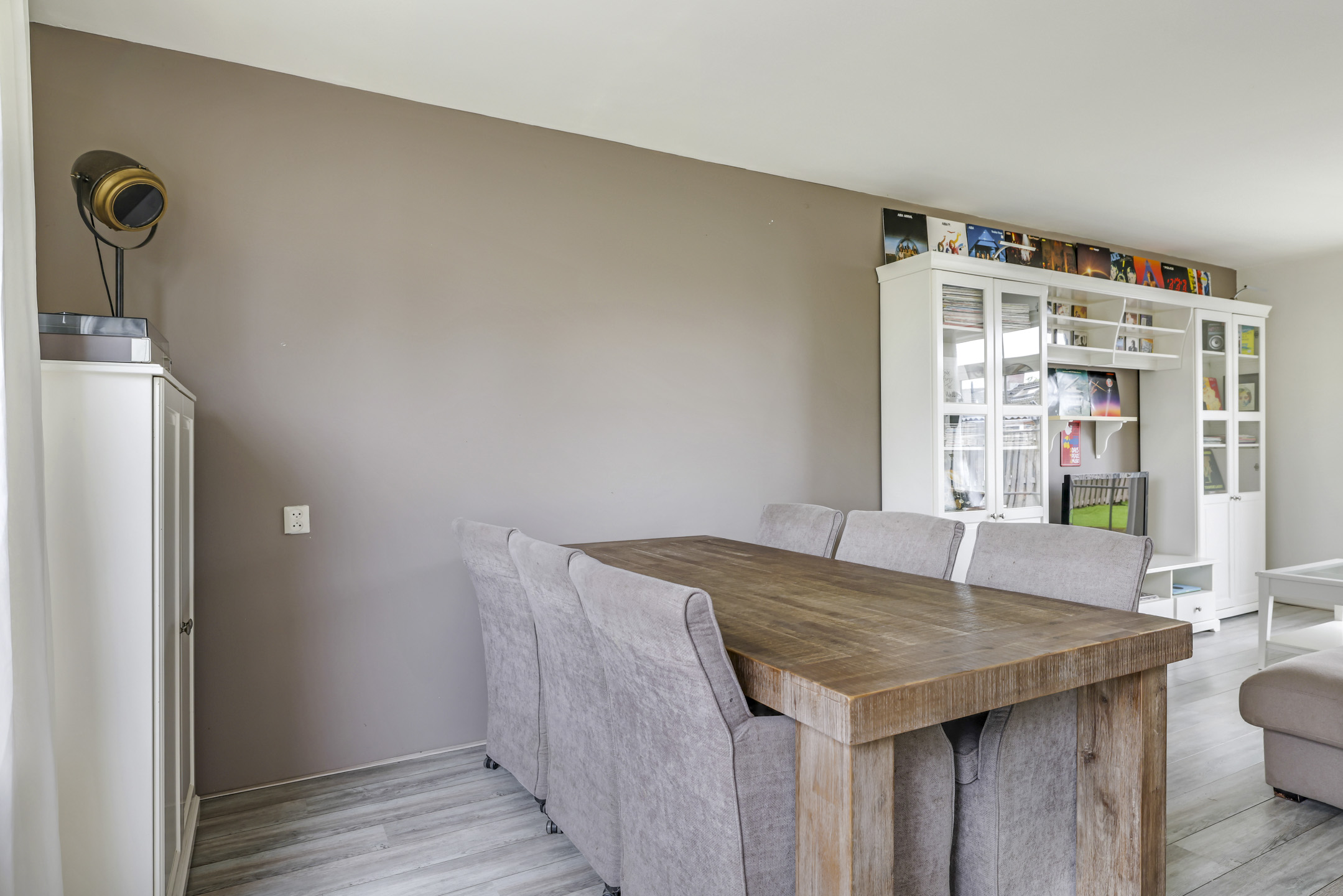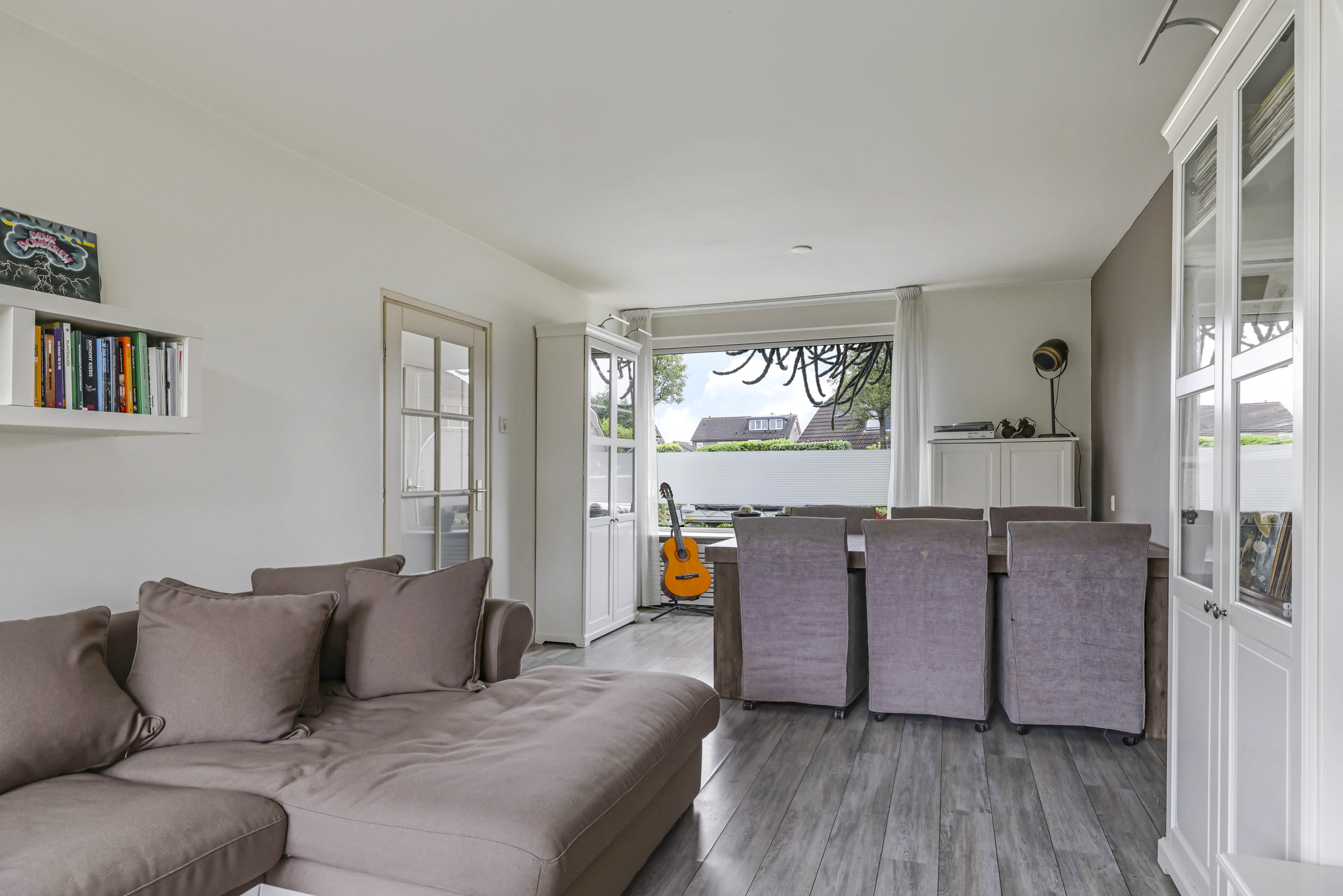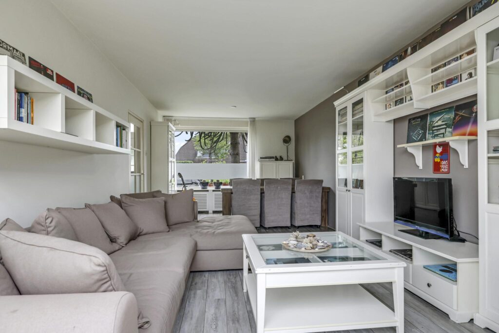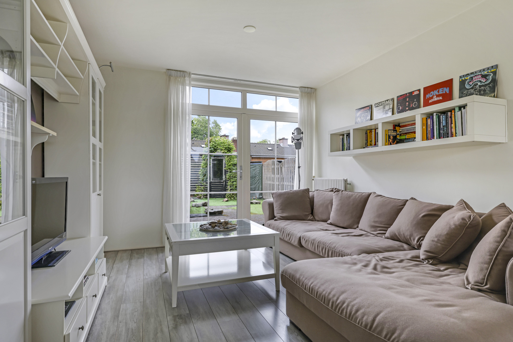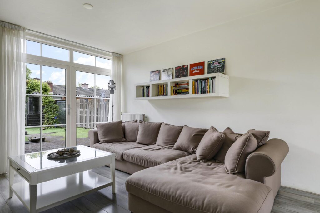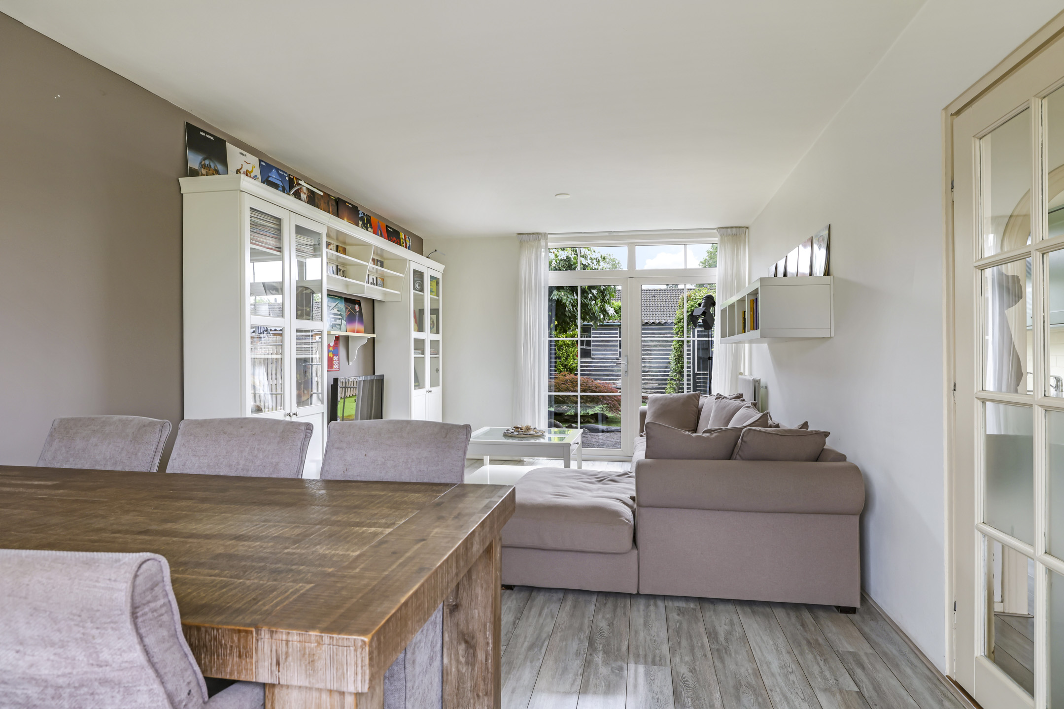 In de woonkamer zijn grote openslaande tuindeuren geplaatst welke zorgen dat hier de woonkamer en achterin tuin in de zomerdag eenvoudig bij elkaar kan betrekken. Opvallend is de roedeverdeling in het glas wat zorgt voor een meer karakter. De woonkamer biedt plaats aan een grote hoekbank en een 6-persoons eettafel. In de hal is een trapkast aanwezig voor de nodige, extra opbergruimte. De wanden en het plafond zijn voorzien van stucwerk.