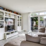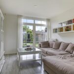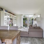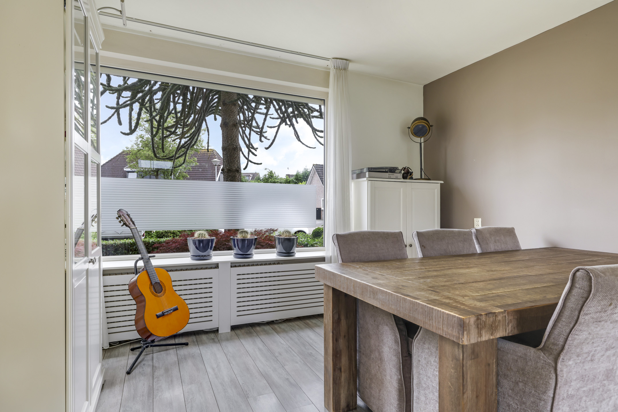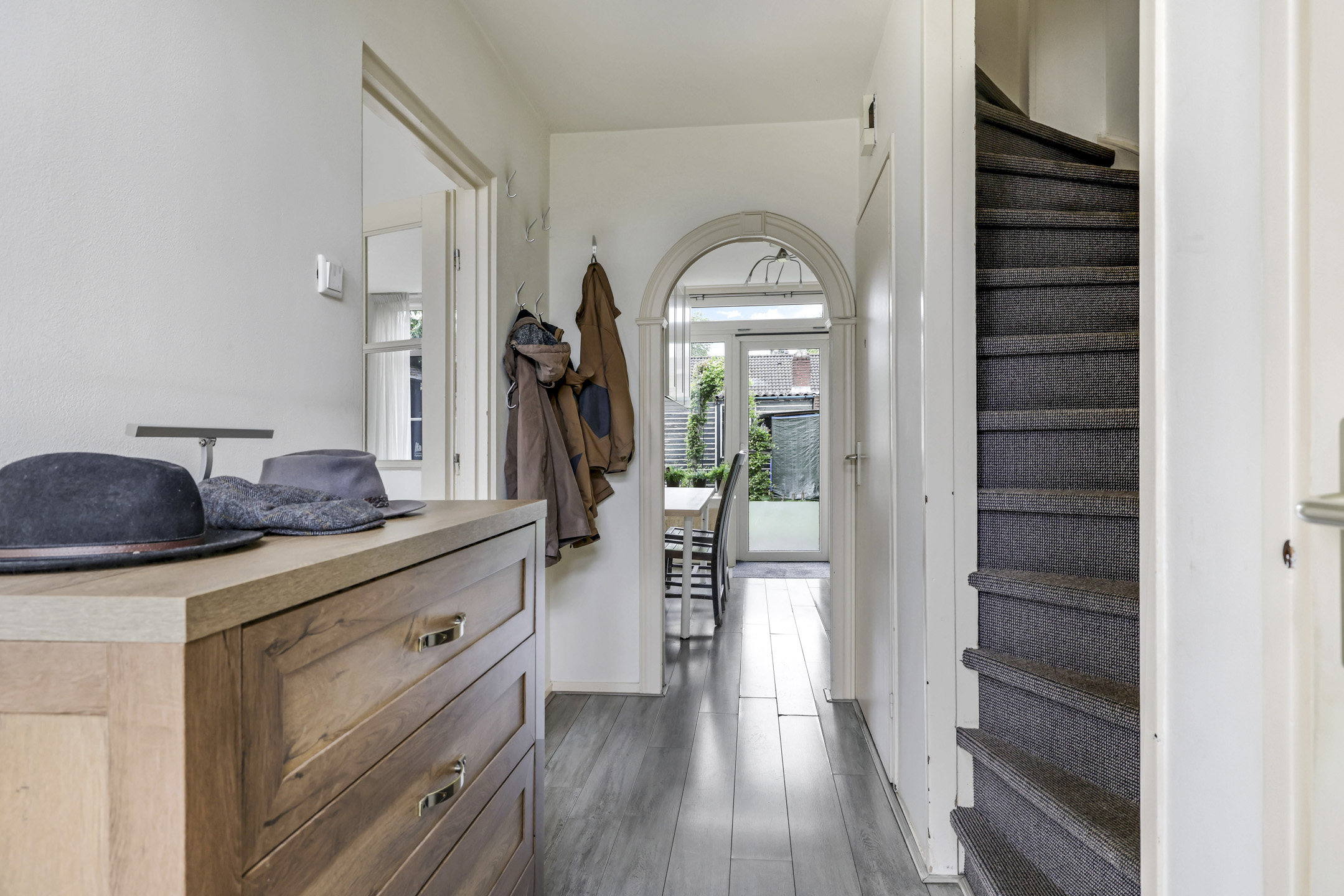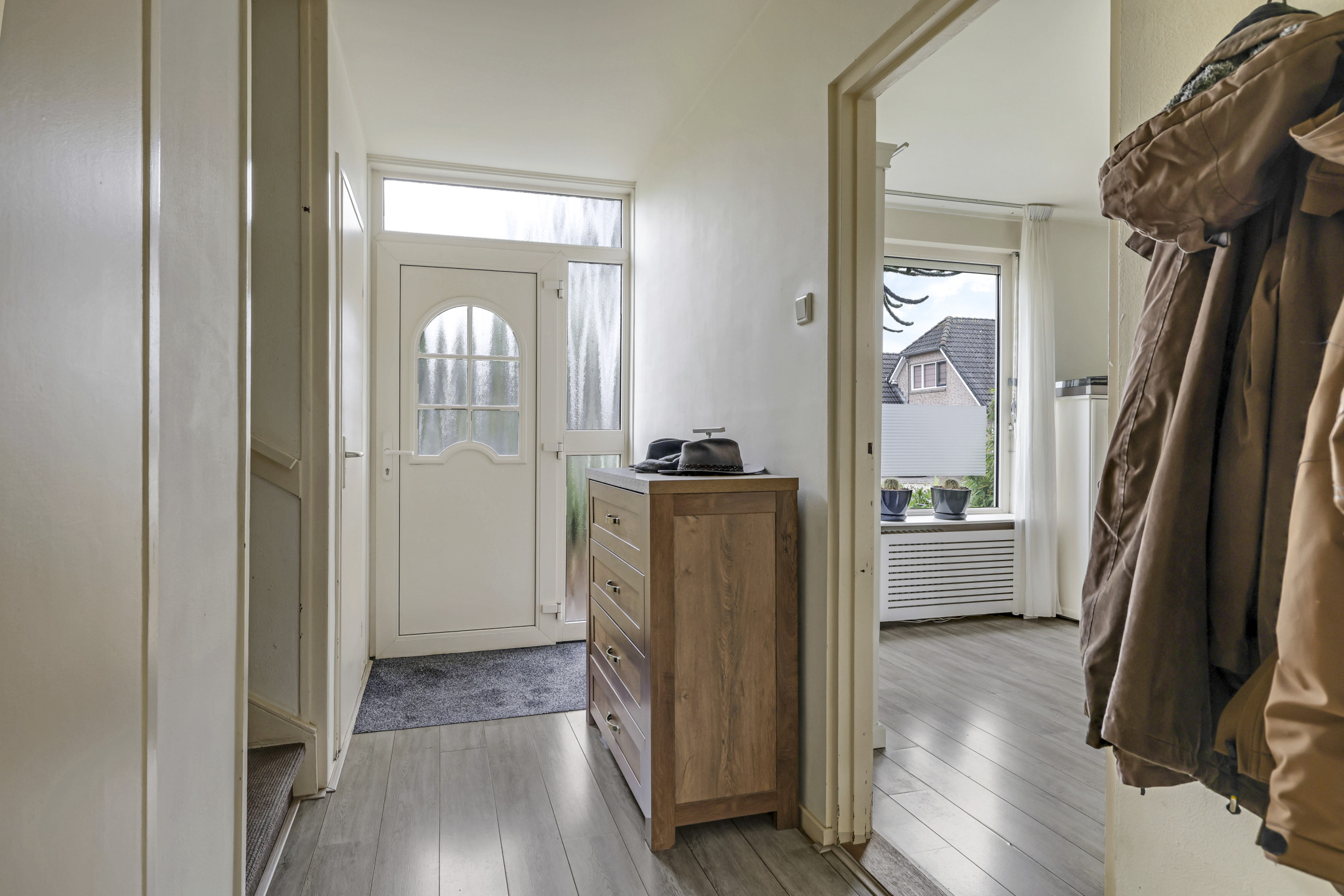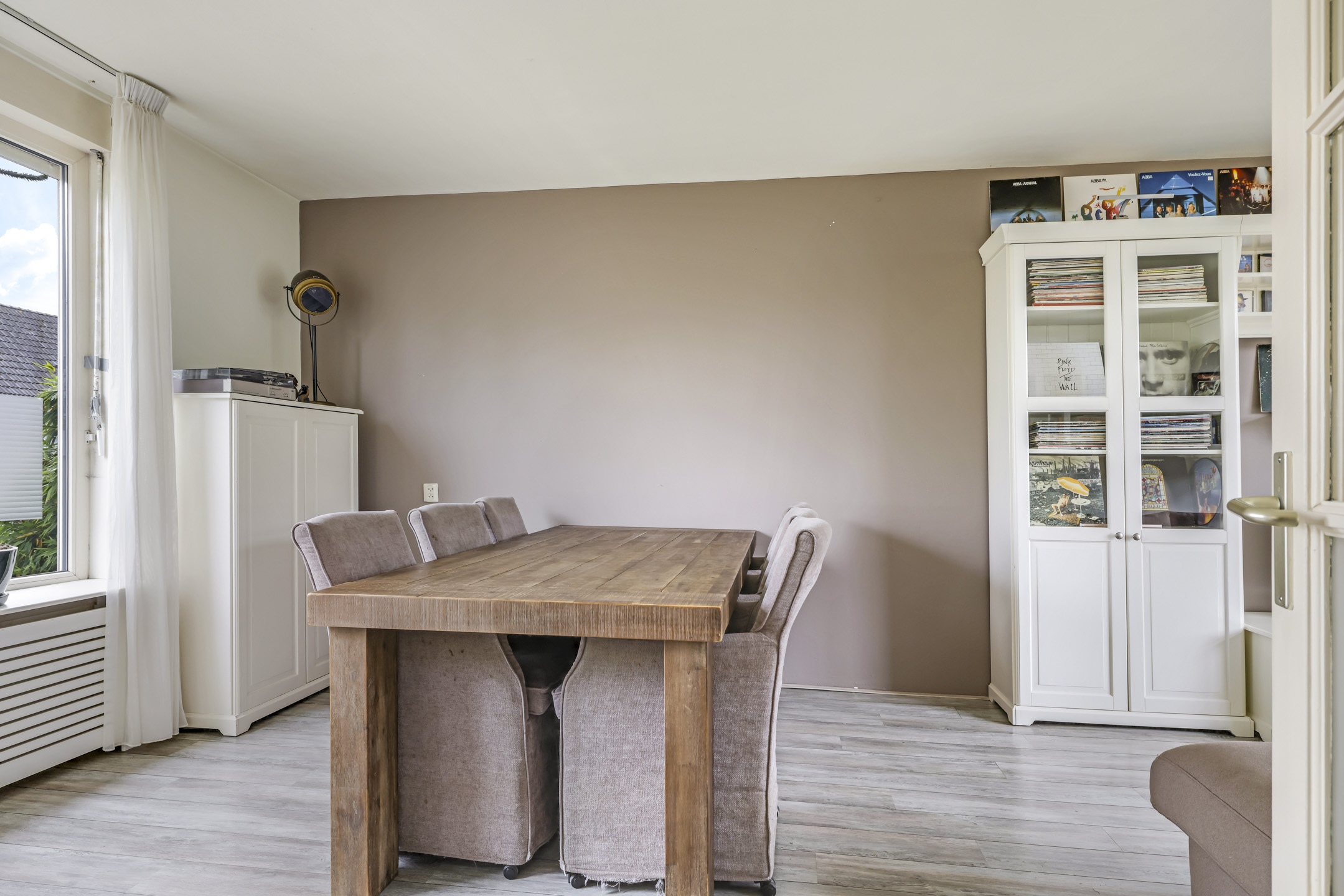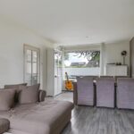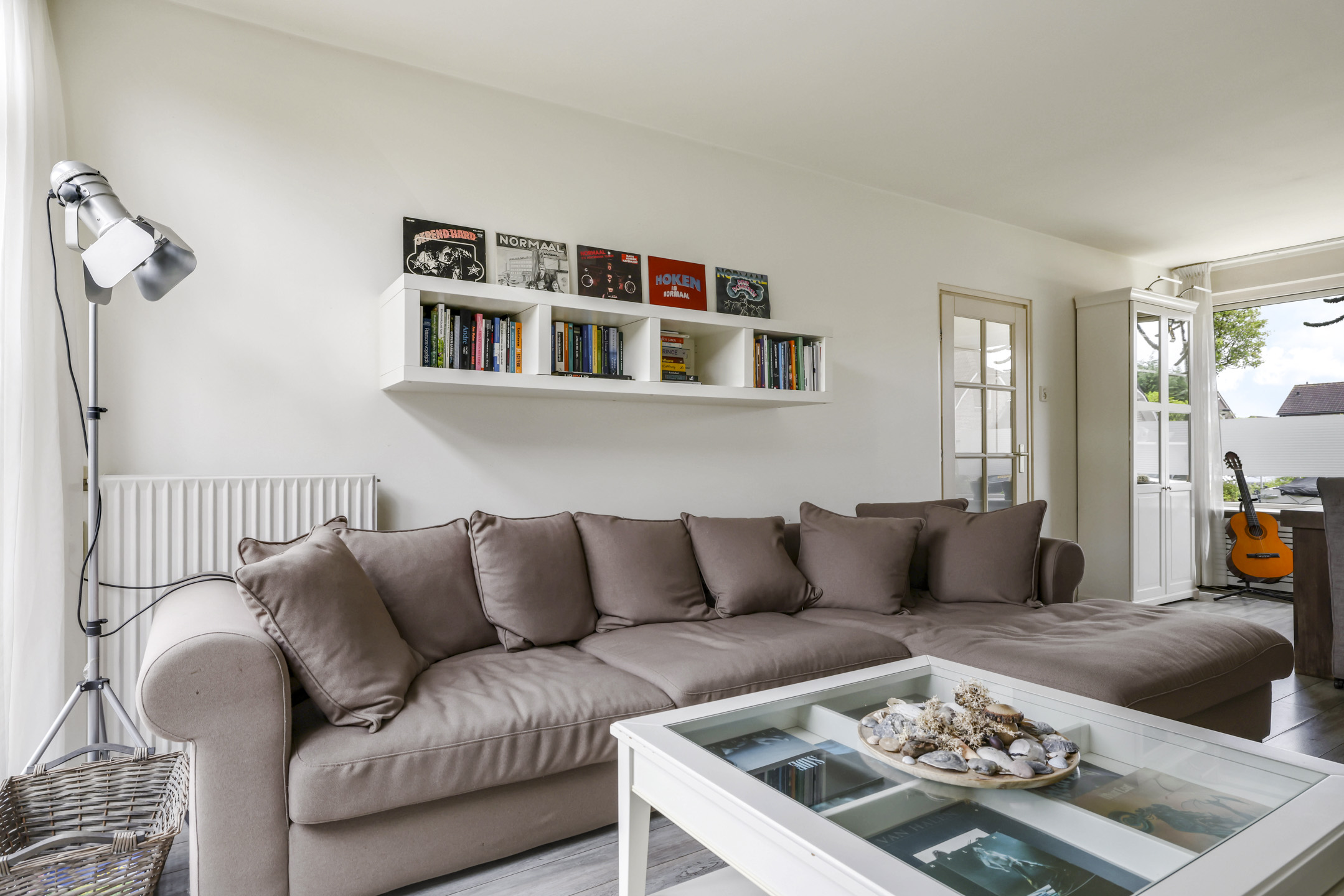 In de woonkamer zijn grote openslaande tuindeuren geplaatst welke zorgen dat hier de woonkamer en achterin tuin in de zomerdag eenvoudig bij elkaar kan betrekken. Opvallend is de roedeverdeling in het glas wat zorgt voor een meer karakter. De woonkamer biedt plaats aan een grote hoekbank en een 6-persoons eettafel. In de hal is een trapkast aanwezig voor de nodige, extra opbergruimte. De wanden en het plafond zijn voorzien van stucwerk.