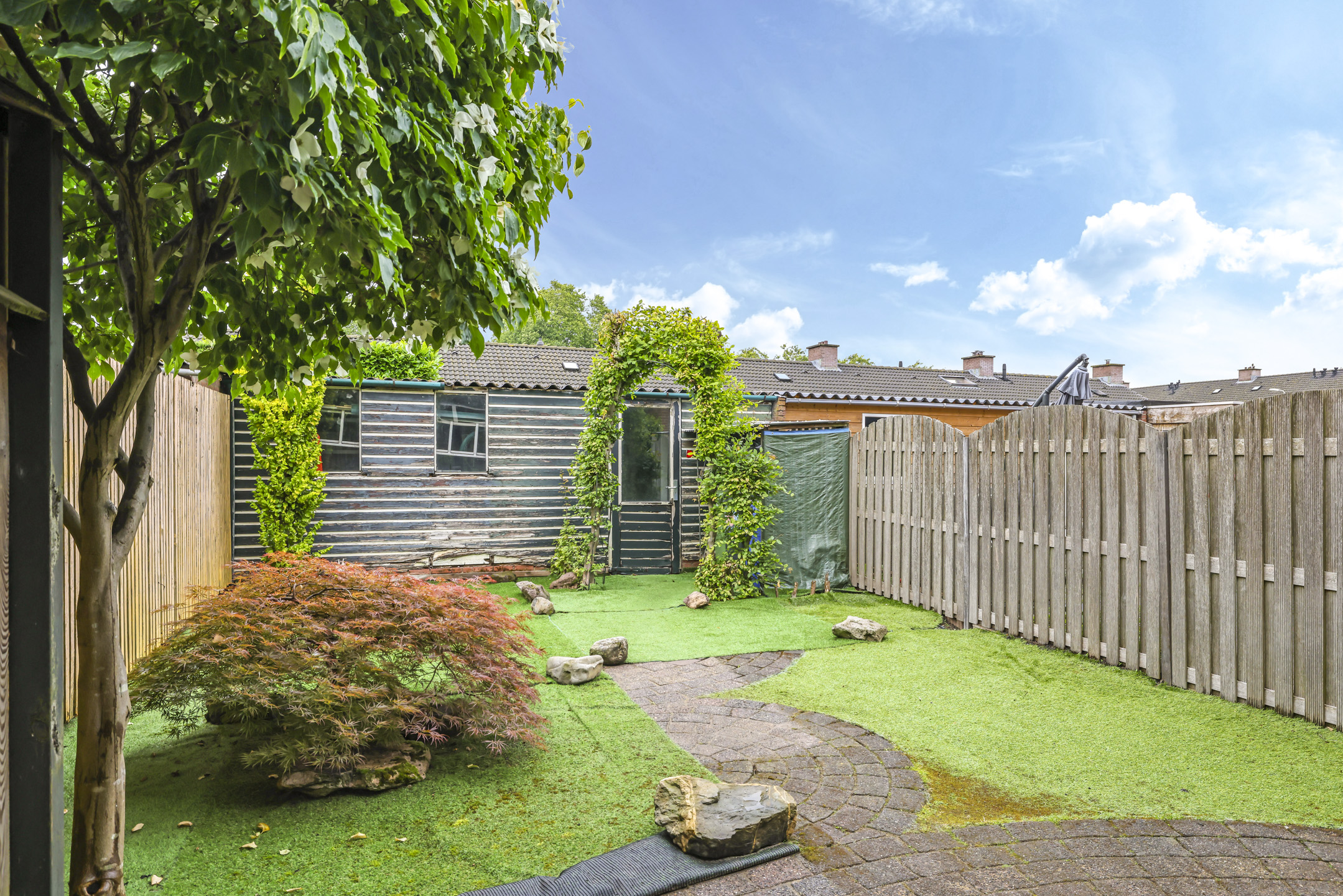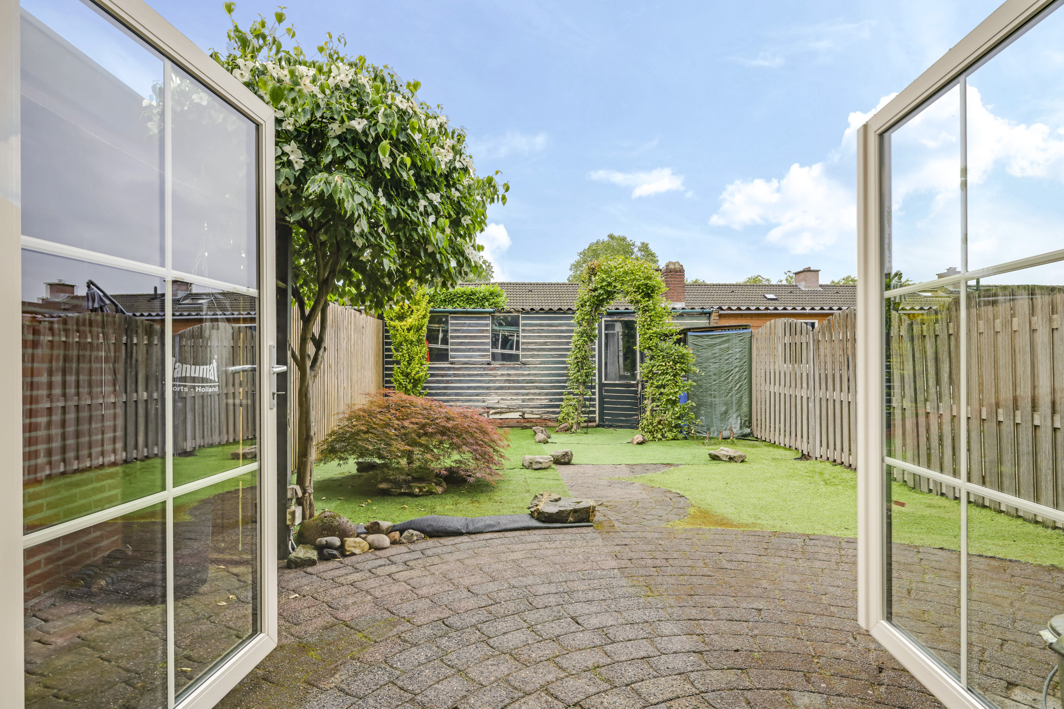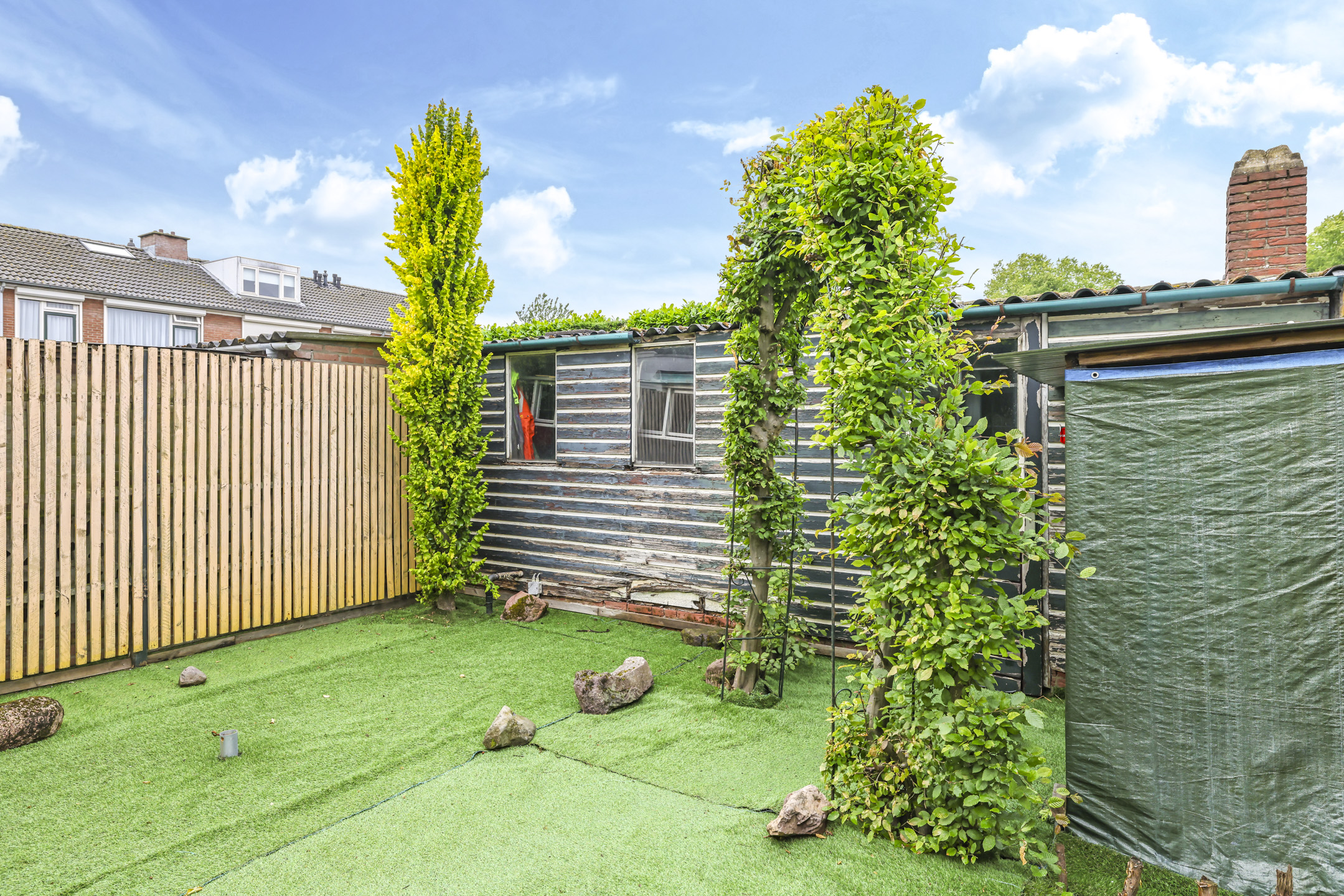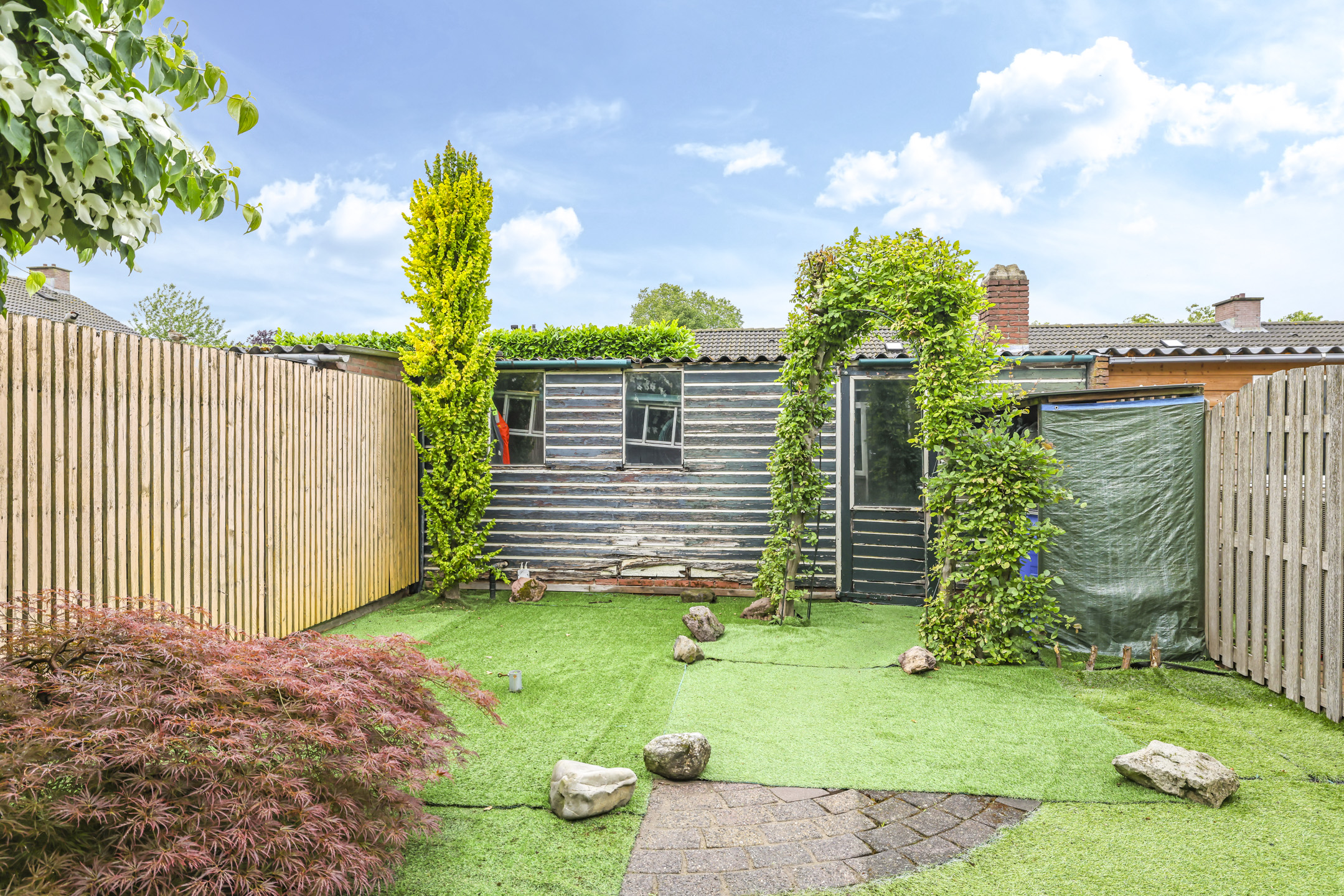 Bij deze woning hoort een diepe achtertuin van ca. 12 meter diep. Hierdoor kan je gemakkelijk meerdere zithoeken kwijt. De tuin heeft een onderhoudsvriendelijk karakter met een terras, kunstgras en enkelen bomen en struiken. Achterin de tuin staat een houten schuur welke over de volledige breedte is gebouwd. Hier zijn elektra- en wateraansluitingen aanwezig. De achterom is via de schuur bereikbaar. Doordat de achtergelegen woning lagere bouw zijn, geniet je in deze tuin van meer privacy dan gemiddeld.