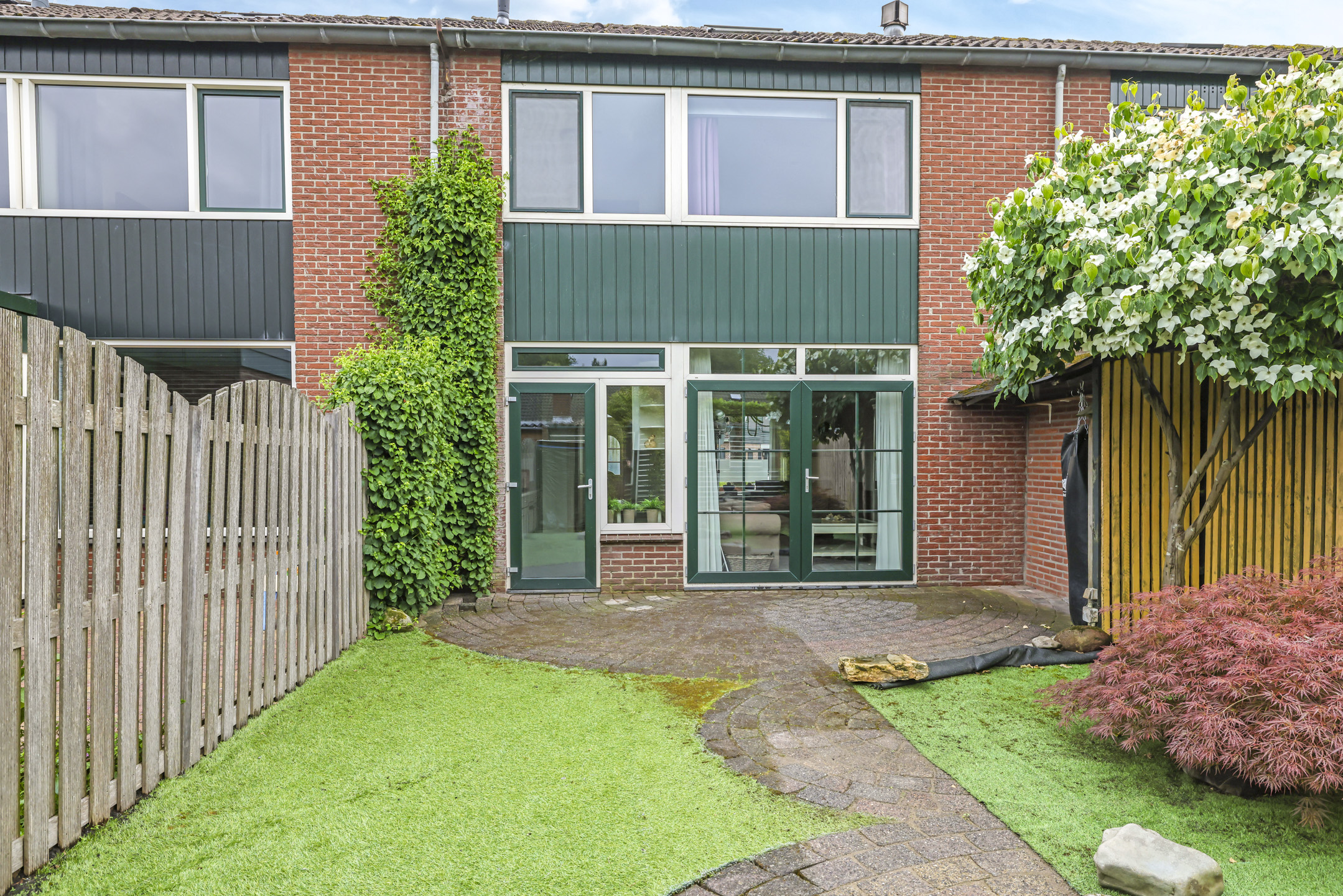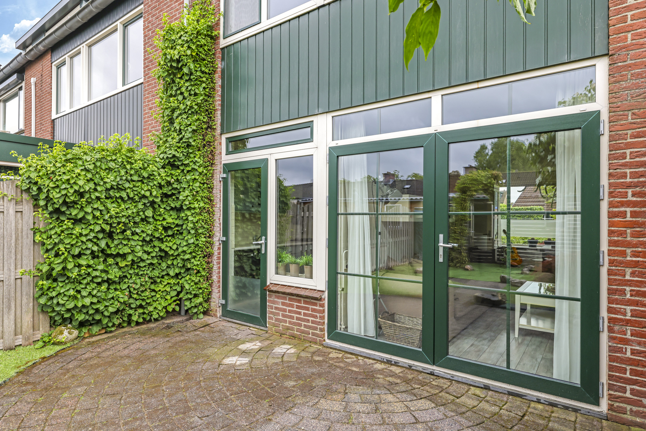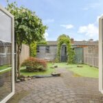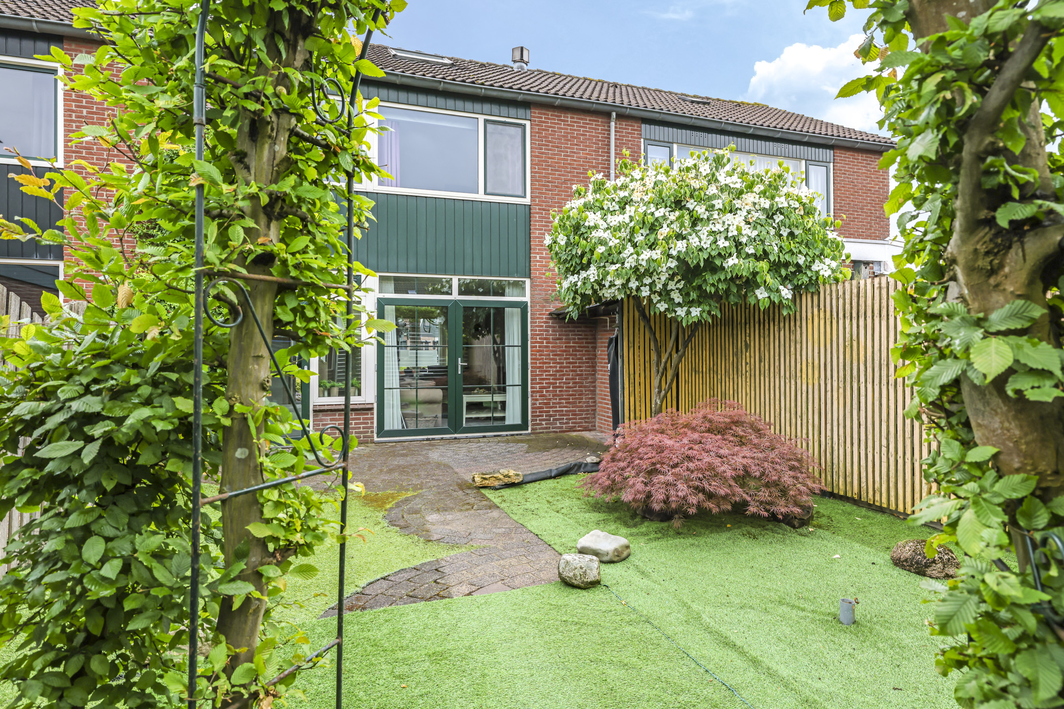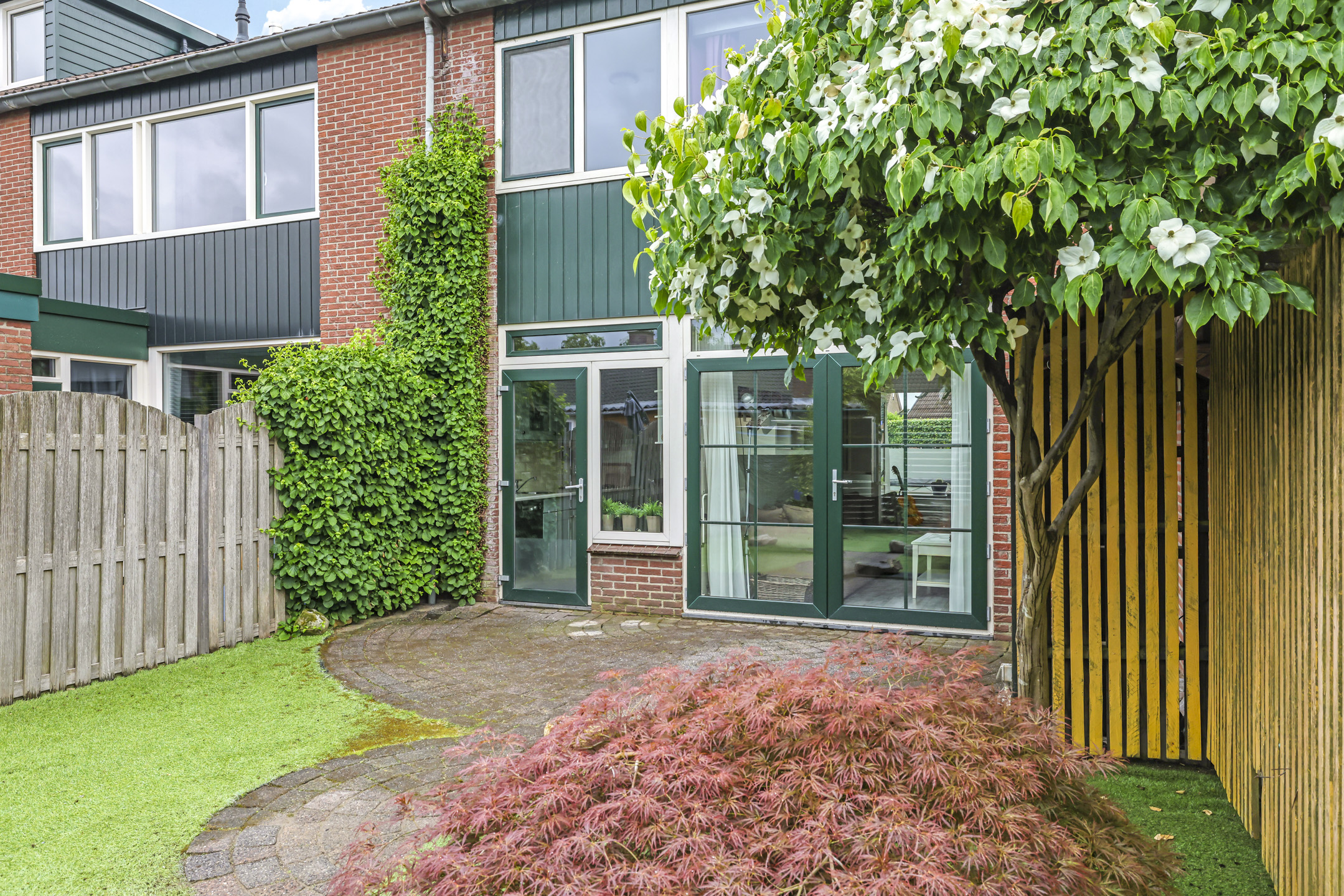 Bij deze woning hoort een diepe achtertuin van ca. 12 meter diep. Hierdoor kan je gemakkelijk meerdere zithoeken kwijt. De tuin heeft een onderhoudsvriendelijk karakter met een terras, kunstgras en enkelen bomen en struiken. Achterin de tuin staat een houten schuur welke over de volledige breedte is gebouwd. Hier zijn elektra- en wateraansluitingen aanwezig. De achterom is via de schuur bereikbaar. Doordat de achtergelegen woning lagere bouw zijn, geniet je in deze tuin van meer privacy dan gemiddeld.