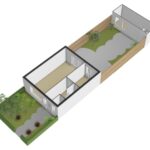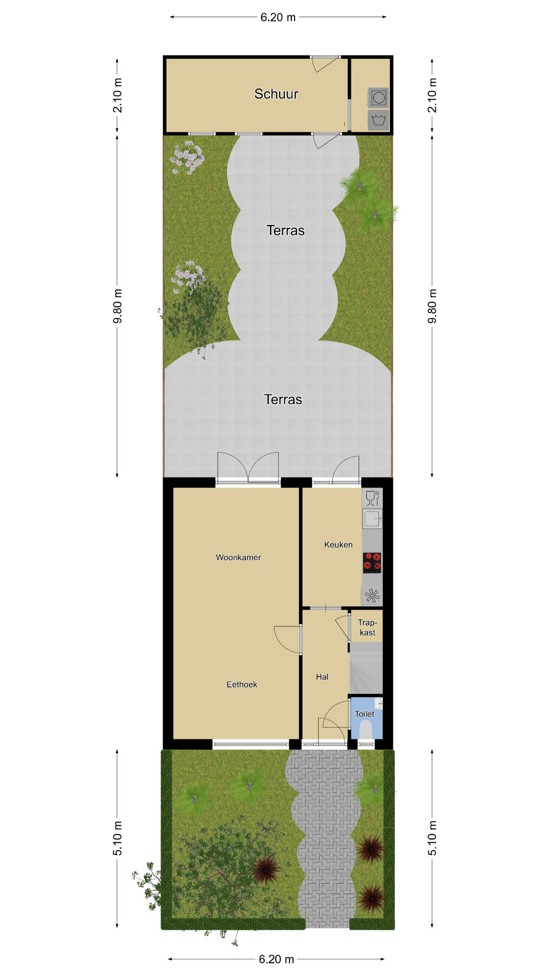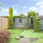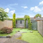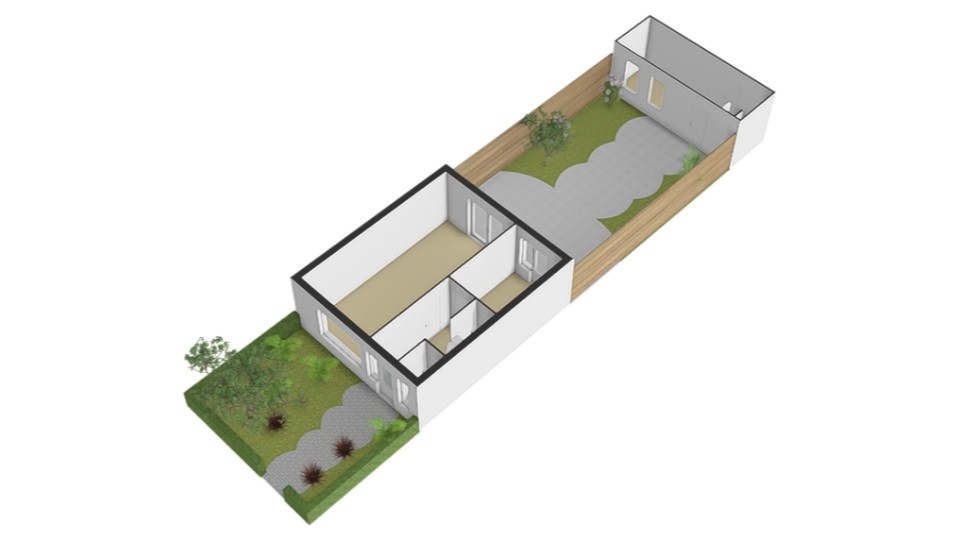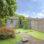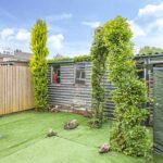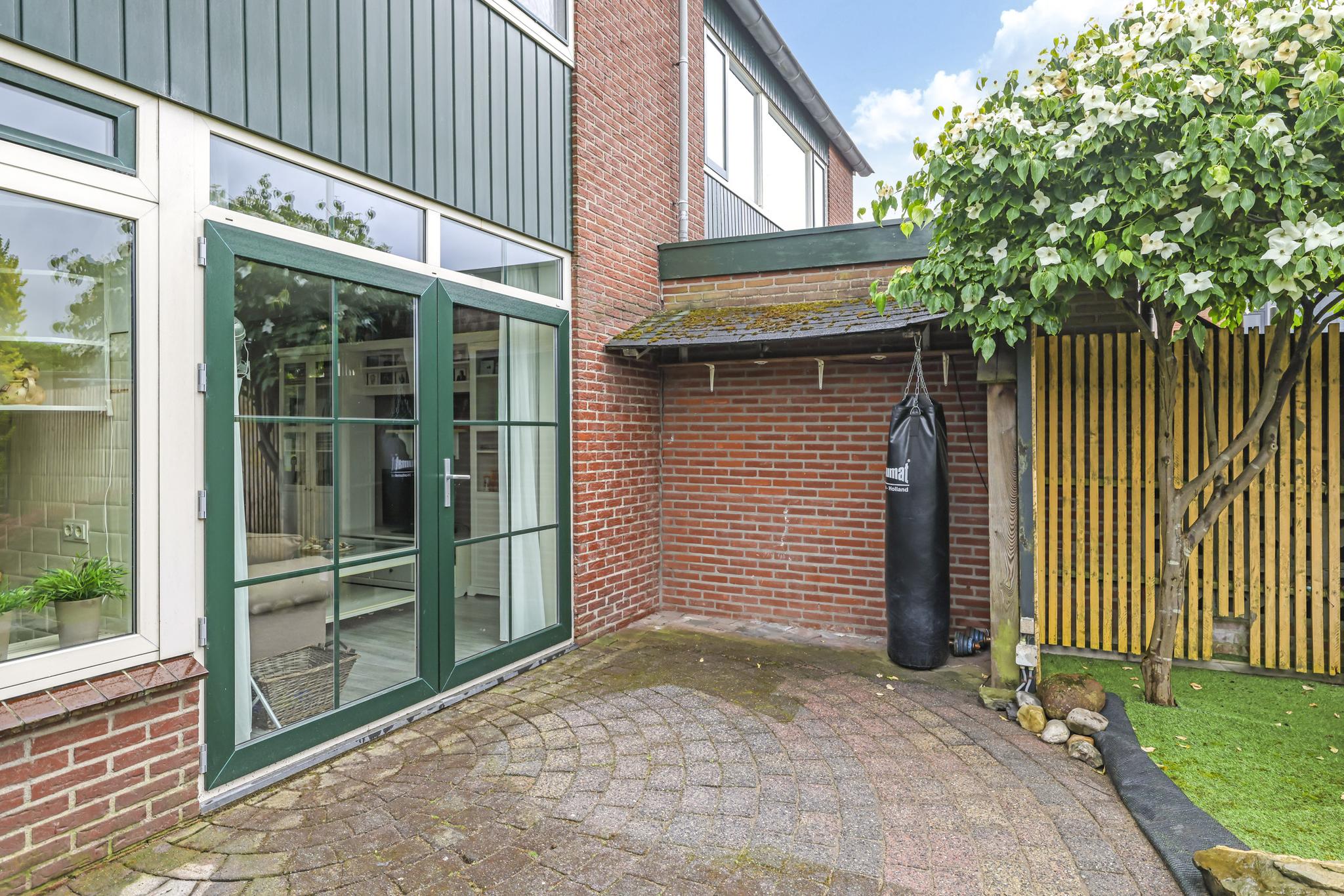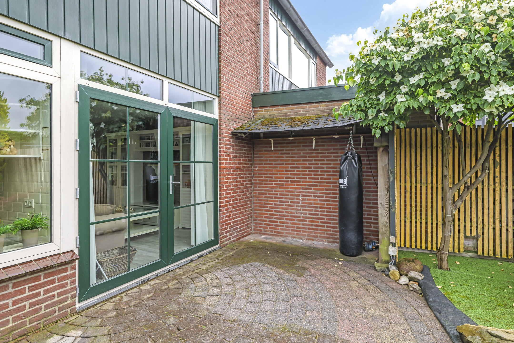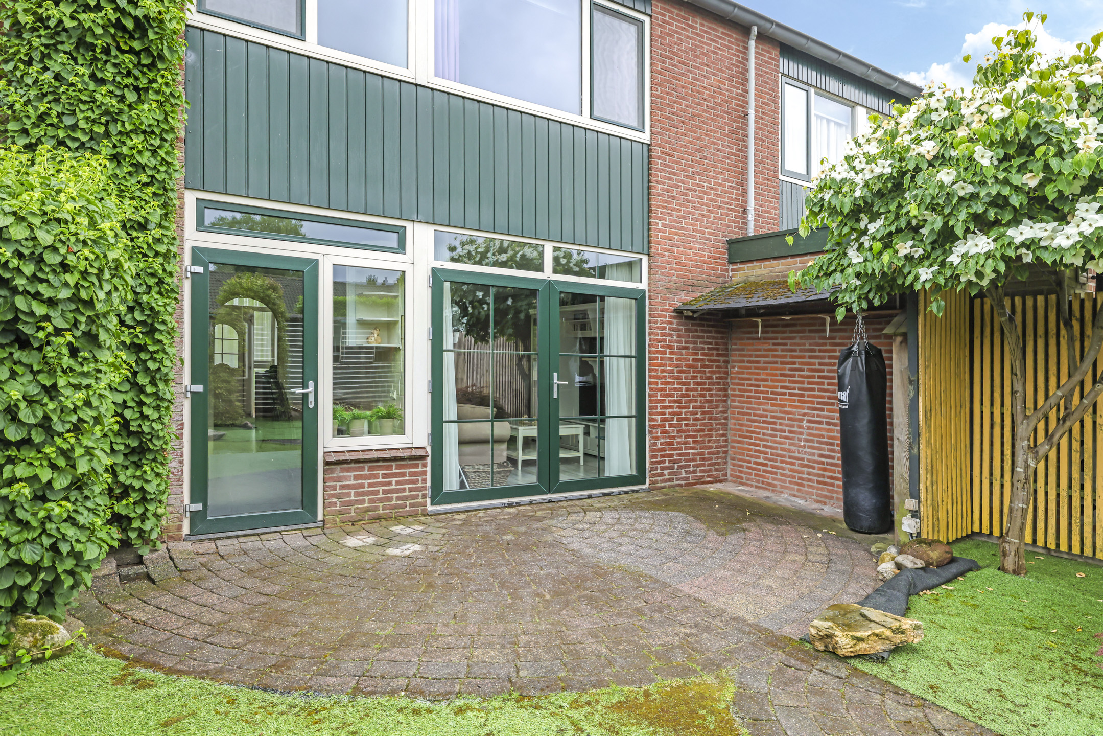 Bij deze woning hoort een diepe achtertuin van ca. 12 meter diep. Hierdoor kan je gemakkelijk meerdere zithoeken kwijt. De tuin heeft een onderhoudsvriendelijk karakter met een terras, kunstgras en enkelen bomen en struiken. Achterin de tuin staat een houten schuur welke over de volledige breedte is gebouwd. Hier zijn elektra- en wateraansluitingen aanwezig. De achterom is via de schuur bereikbaar. Doordat de achtergelegen woning lagere bouw zijn, geniet je in deze tuin van meer privacy dan gemiddeld.