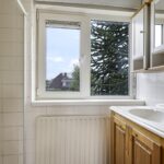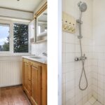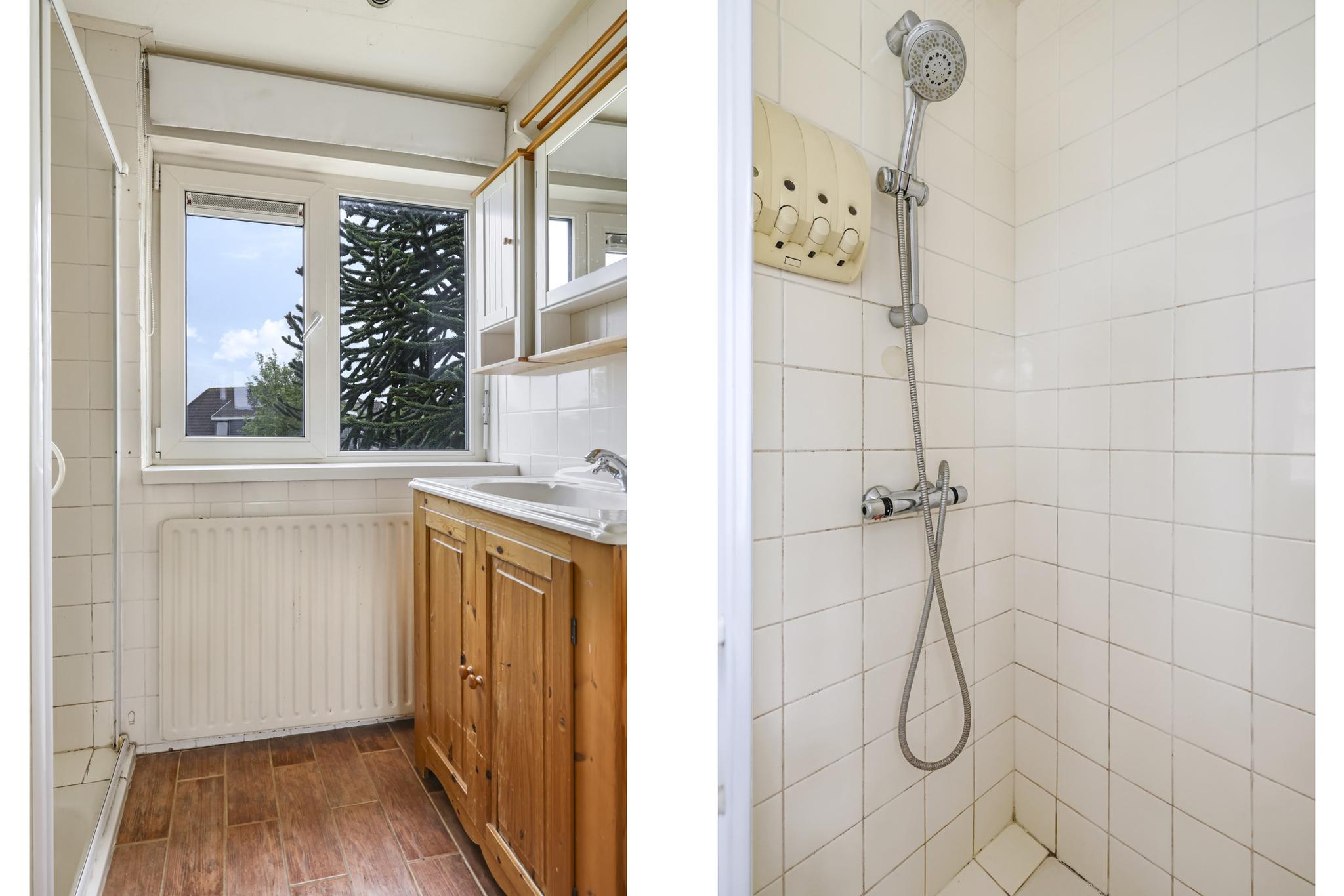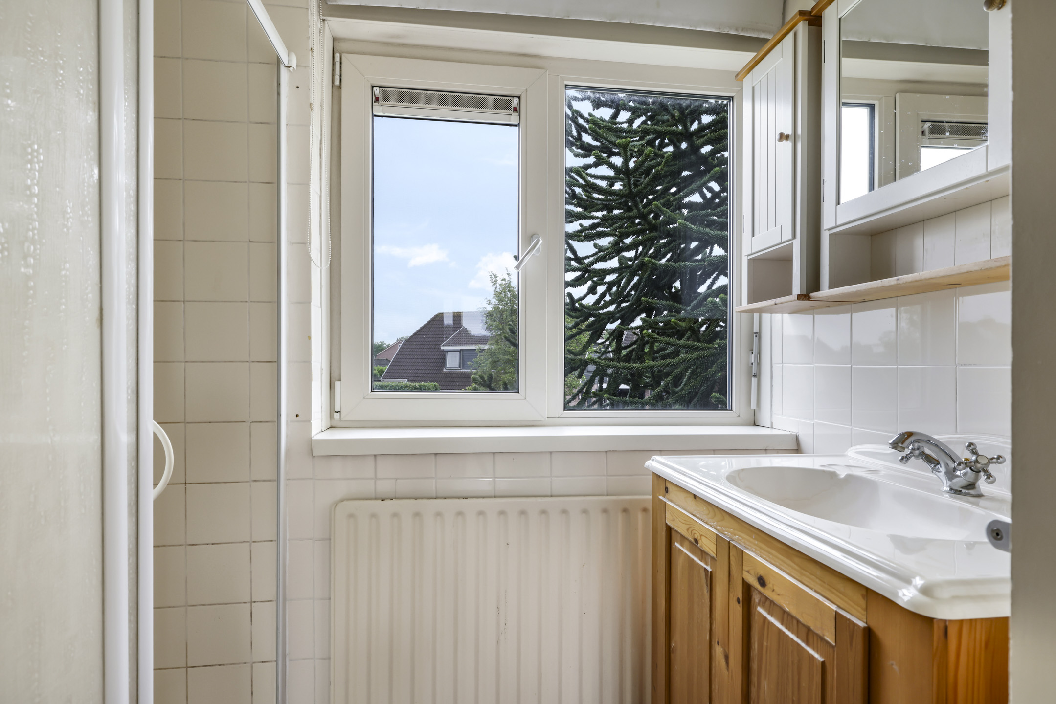 De badkamer is aan de voorzijde van de woning gelegen. De ruimte heeft nog de originele indeling met een douche en een wastafelmeubel. Bij dit type woning wordt er vaak een stukje overloop opgeofferd om de badkamer te vergroten en zo de optie te hebben om een 2e toilet te plaatsen. Ventileren kan middels het grote draai/kiepraam welke is voorzien vaan een inzethor en een rolluik.