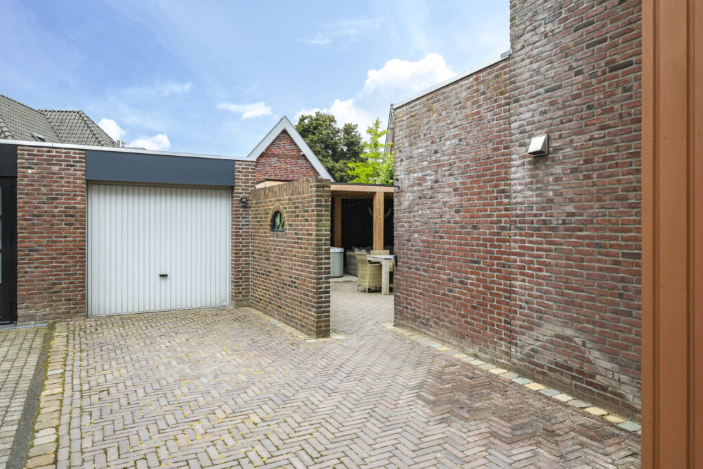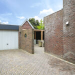 In de hoek van de tuin is een stenen garage gebouwd welke tevens is voorzien van elektra. Ideaal wanneer je een motor of fiets binnen wilt stallen, of juist wilt klussen. Aan de voorzijde biedt de garage via een kanteldeur toegang tot de oprit, aan de zijkant is een loopdeur aanwezig met toegang tot de tuin.