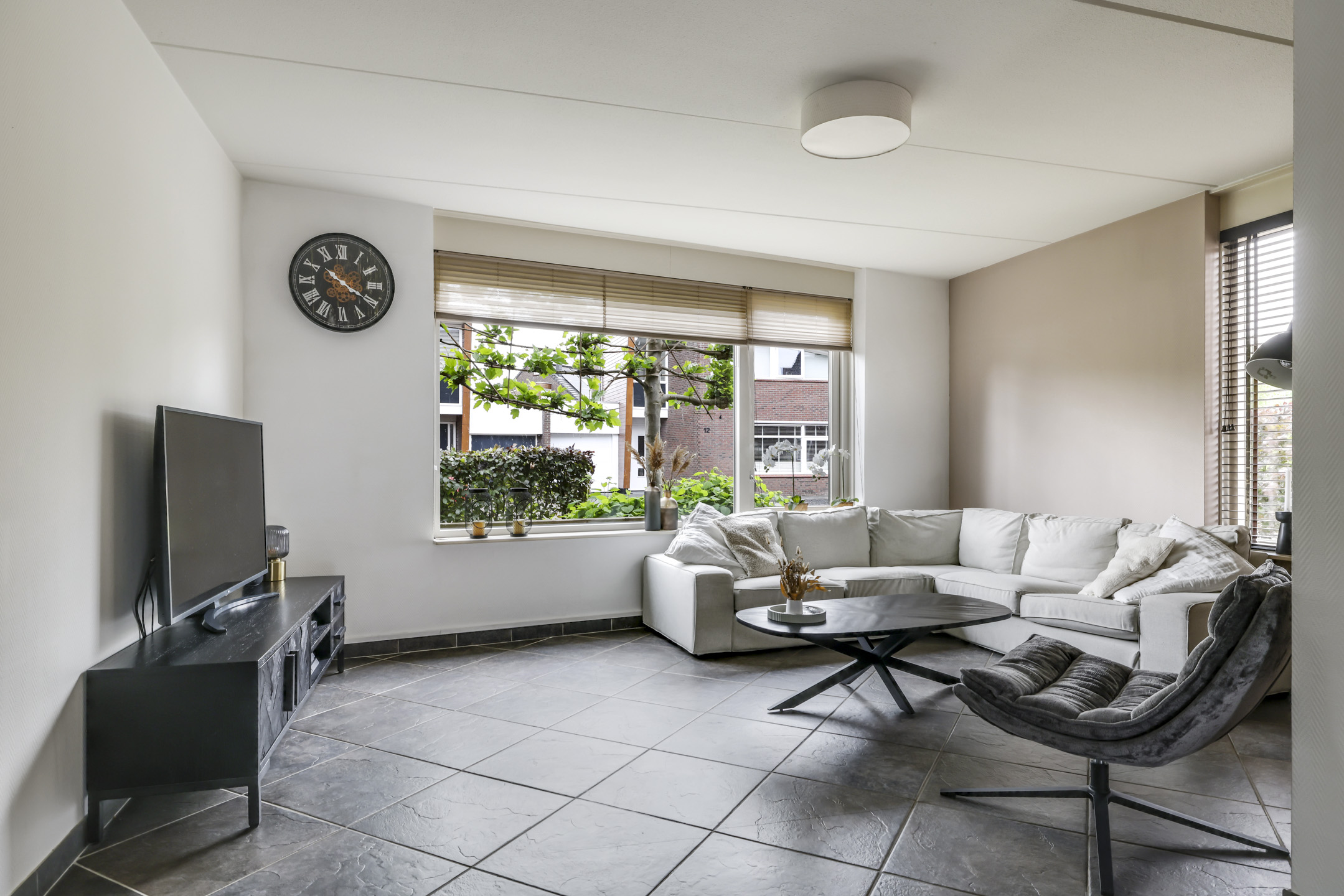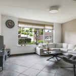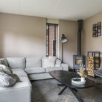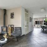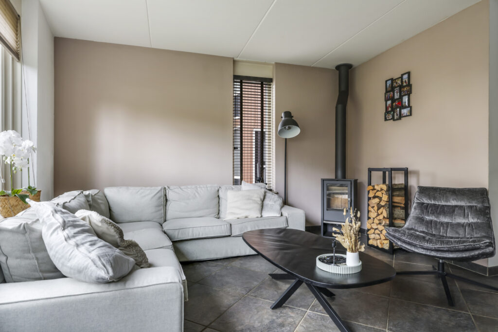 De woonkamer heeft iets gezelligs in zich. Wellicht komt dit door het speelse karakter van de voorgevel en de prettige lichtinval van onder meer het zijgevelraam. Daarbij heeft de woonkamer een aangenaam klimaat doordat de plavuizen vloer is voorzien van vloerverwarming. In de hoek van de woonkamer is tevens een houtkachel geplaatst wat zorgt voor sfeervolle, warme avonden. De zithoek is 4,2 meter diep en 5,1 meter breed waardoor je er prima een grote hoekbank kwijt kunt. Een lange muur nodigt je uit om een TV aan de wand te hangen.