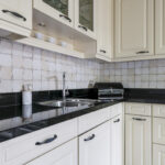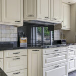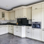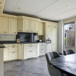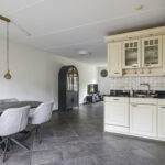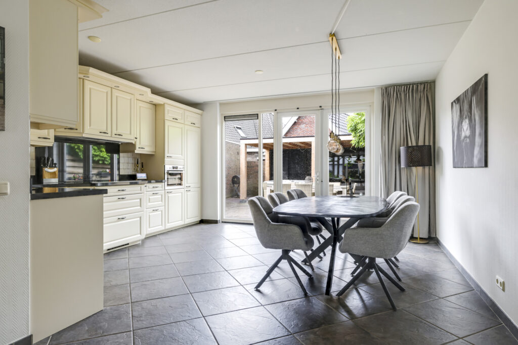 De keuken bevindt zich aan de achterzijde van de woning en is dus ook de ruimte waar de woning is uitgebouwd. Dit zorgt er niet alleen voor dat je er royale eethoek kan plaatsen, ook is het keukenblok uitgebreider dan normaal. De keuken is in een hoekopstelling geplaatst met bovenkasten wat zorgt voor veel werk- en opbergruimte. De aanwezige inbouwapparatuur bestaat uit een 5-pits inductiekookplaat, een afzuigkap, een combi-oven/magnetron, een koel/vriescombinatie en een vaatwasser. In de keuken zet je de openslaande tuindeuren eenvoudig open waardoor je in de zomerdag binnen en buiten bij elkaar kunt betrekken.
