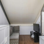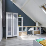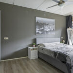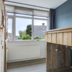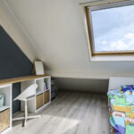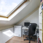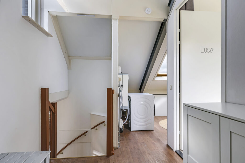 Naast deze slaapkamer is een werkhoek gecrëerd, ideaal wanneer je veel vanuit huis wilt werken. De voorzolder biedt ruimte aan de wasmachine, wasdroger en de CV-ketelopstelling. En ook hier is een extra dakvenster geplaatst waardoor je lekker kunt laten doorwaaien.