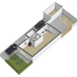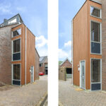 Andere speelse elementen zijn de schuin weglopende voorgevel en het hoge lessenaarsdak op de 2e verdieping. Deze bijzondere kapconstructie heeft 2 verschillende dakvlakken waarbij hoge ramen tot in de nok voor een verspringing én veel daglicht zorgen. Extra dakvensters maken het ruimtelijke gevoel nog meer bijzonder. Kortom, zoek je geen standaard woonhuis, kom dan eens hier kijken en laat je verrassen.