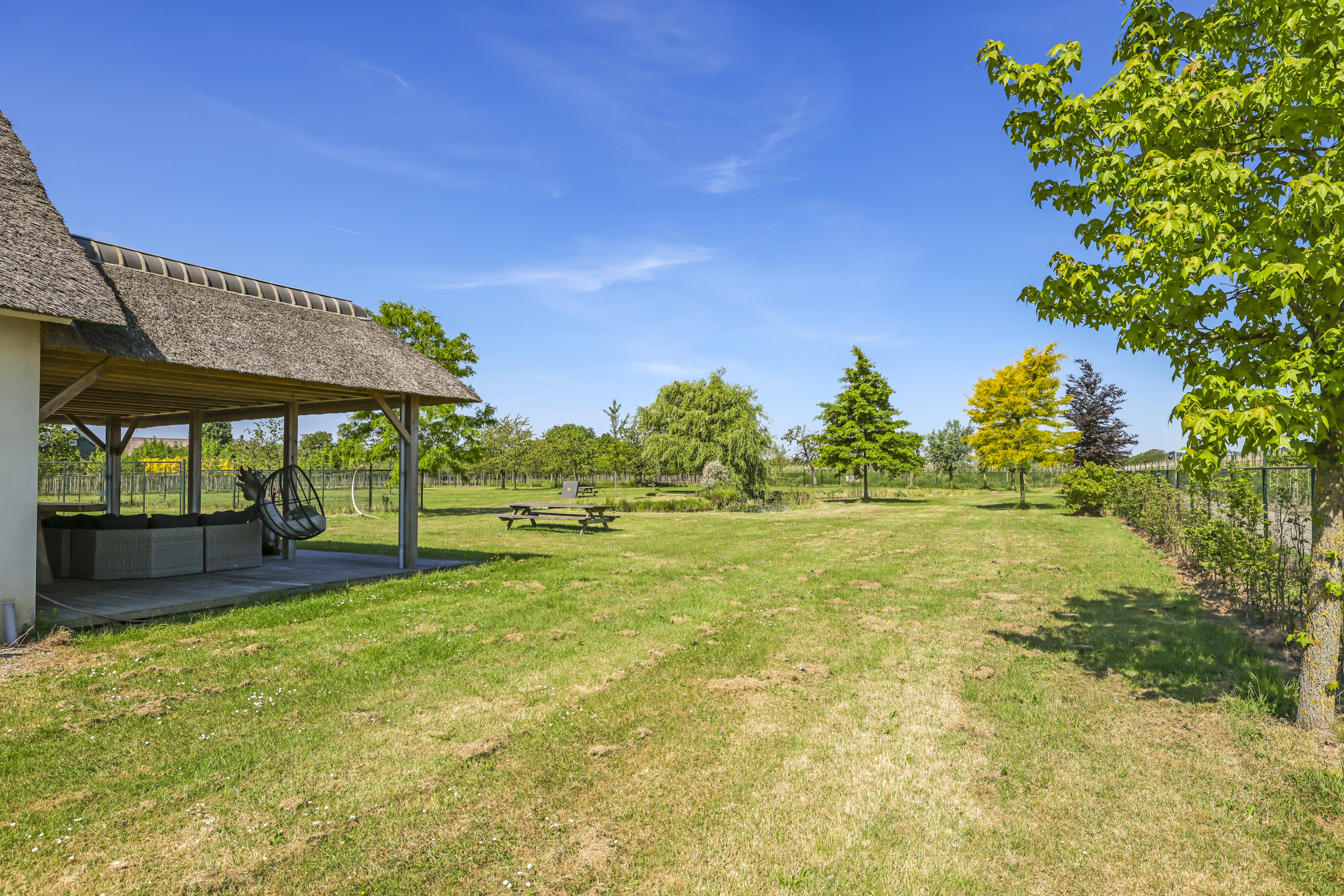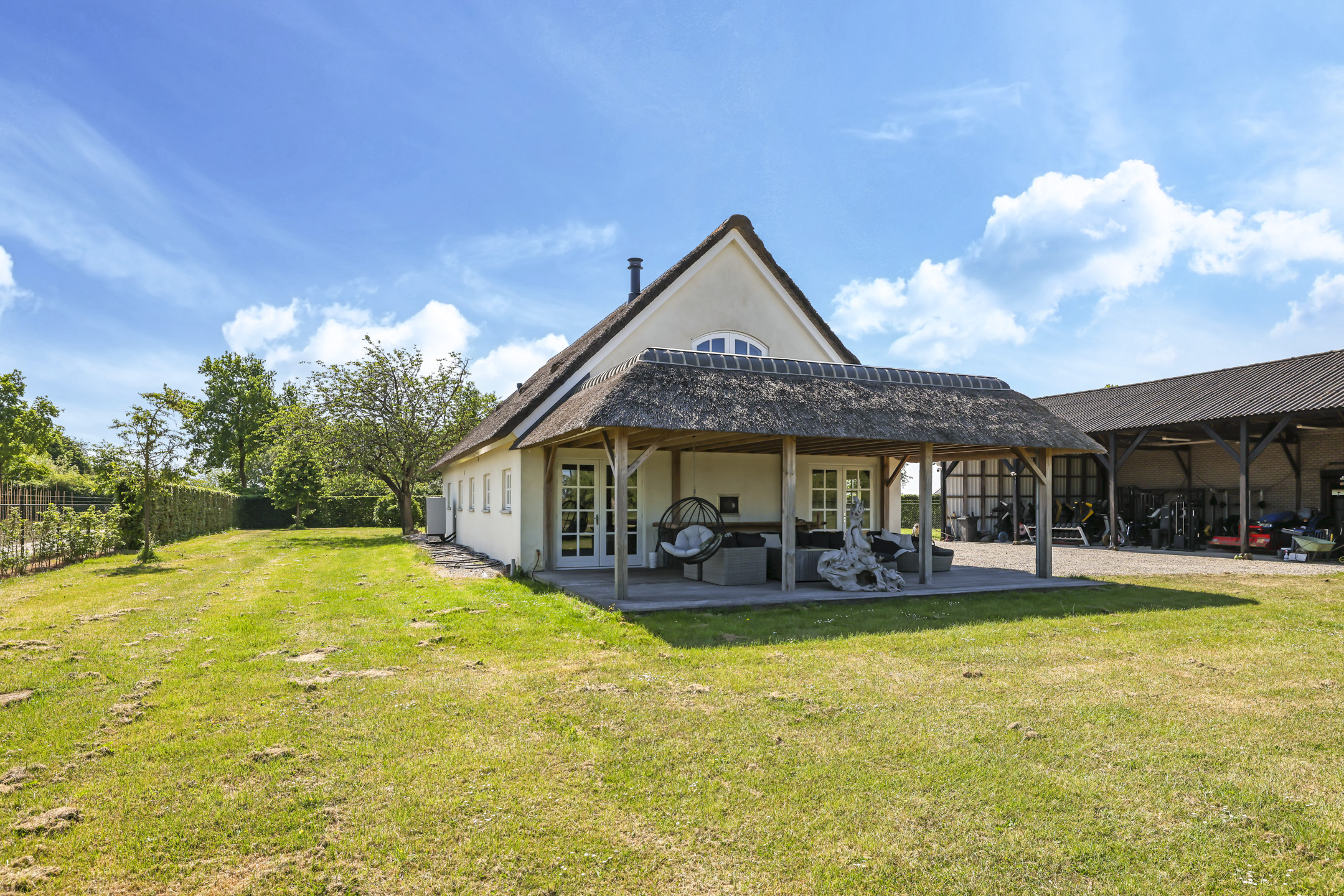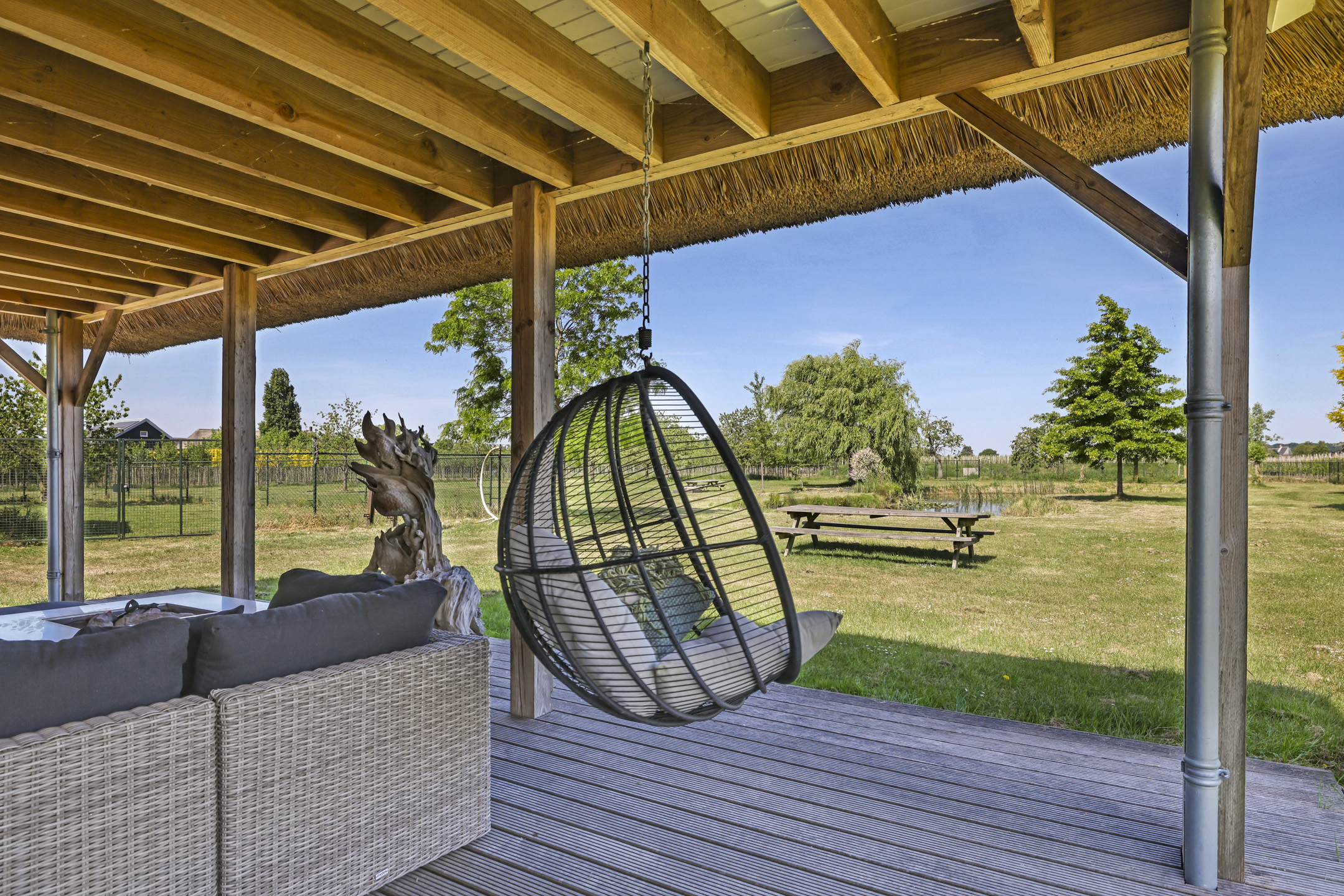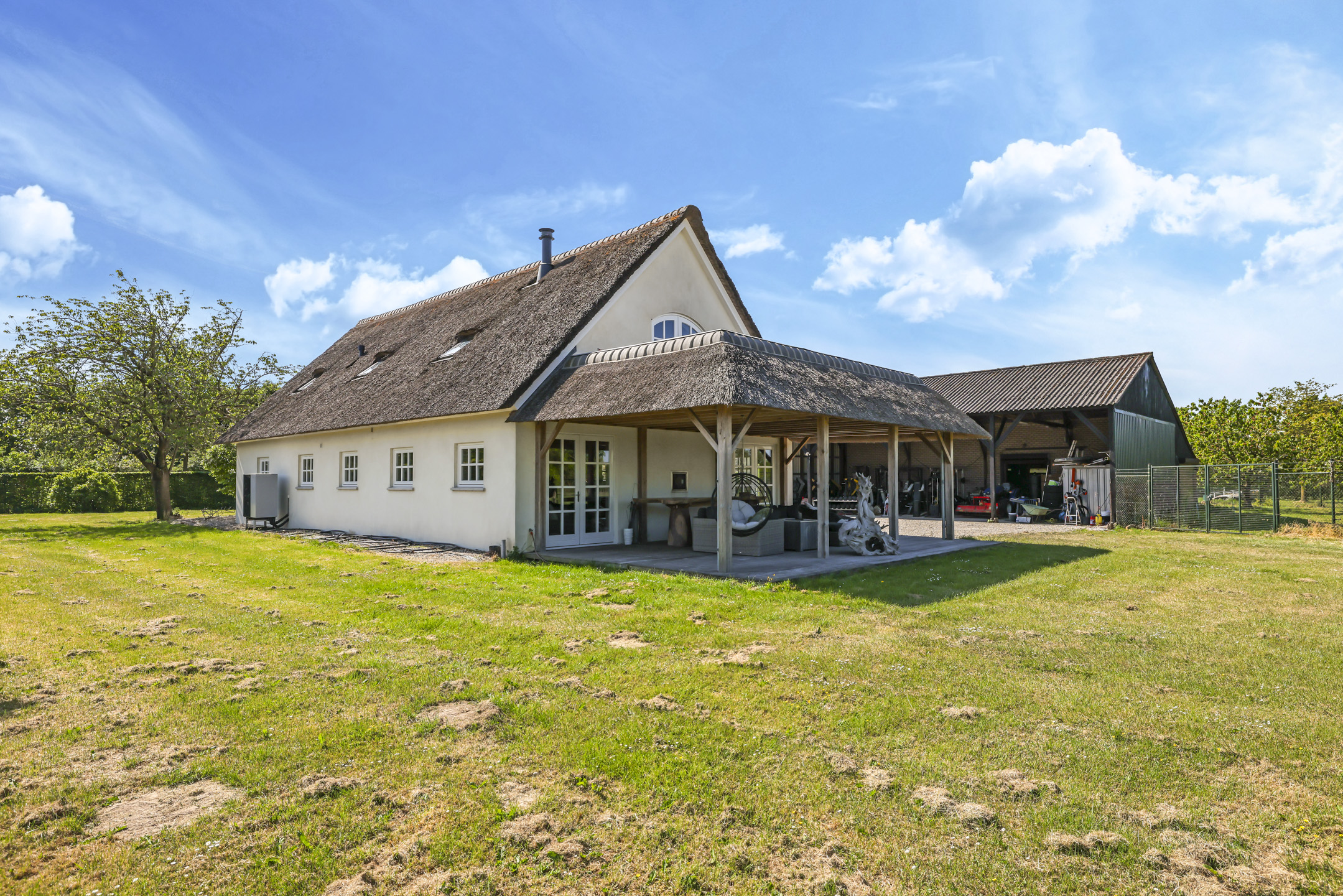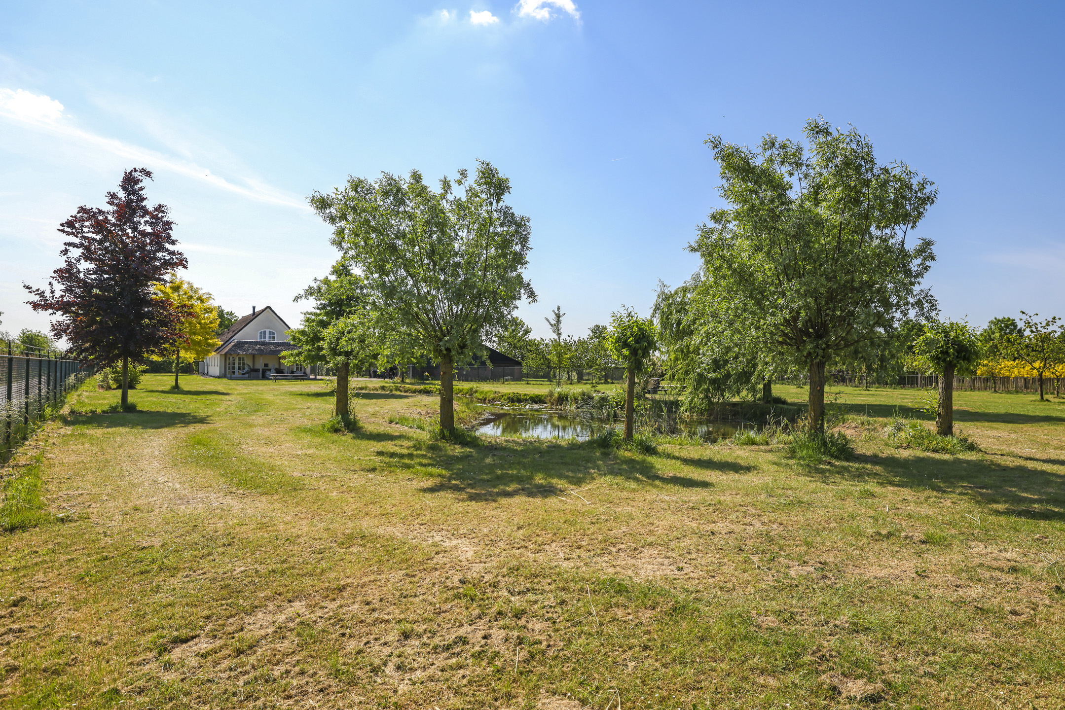 Ben je op zoek naar meer buitenleven, dan zal deze tuin je zeker aanspreken. Aan alle zijden van de woning geniet van je van veel vrijheid en daarmee ook veel privacy. In het midden van de tuin is een grote vijver geplaatst welke zorgt voor veen biodiversiteit in de tuin. Verder in het grasveld tref je verschillende bomen waaronder ook kersenbomen. Direct aan de woning is een veranda van ca. 40m² geplaatst waar je heerlijk kan genieten van het vrije zicht over het erf. Zie jij jezelf hier ’s ochtends al een kopje koffie drinken?