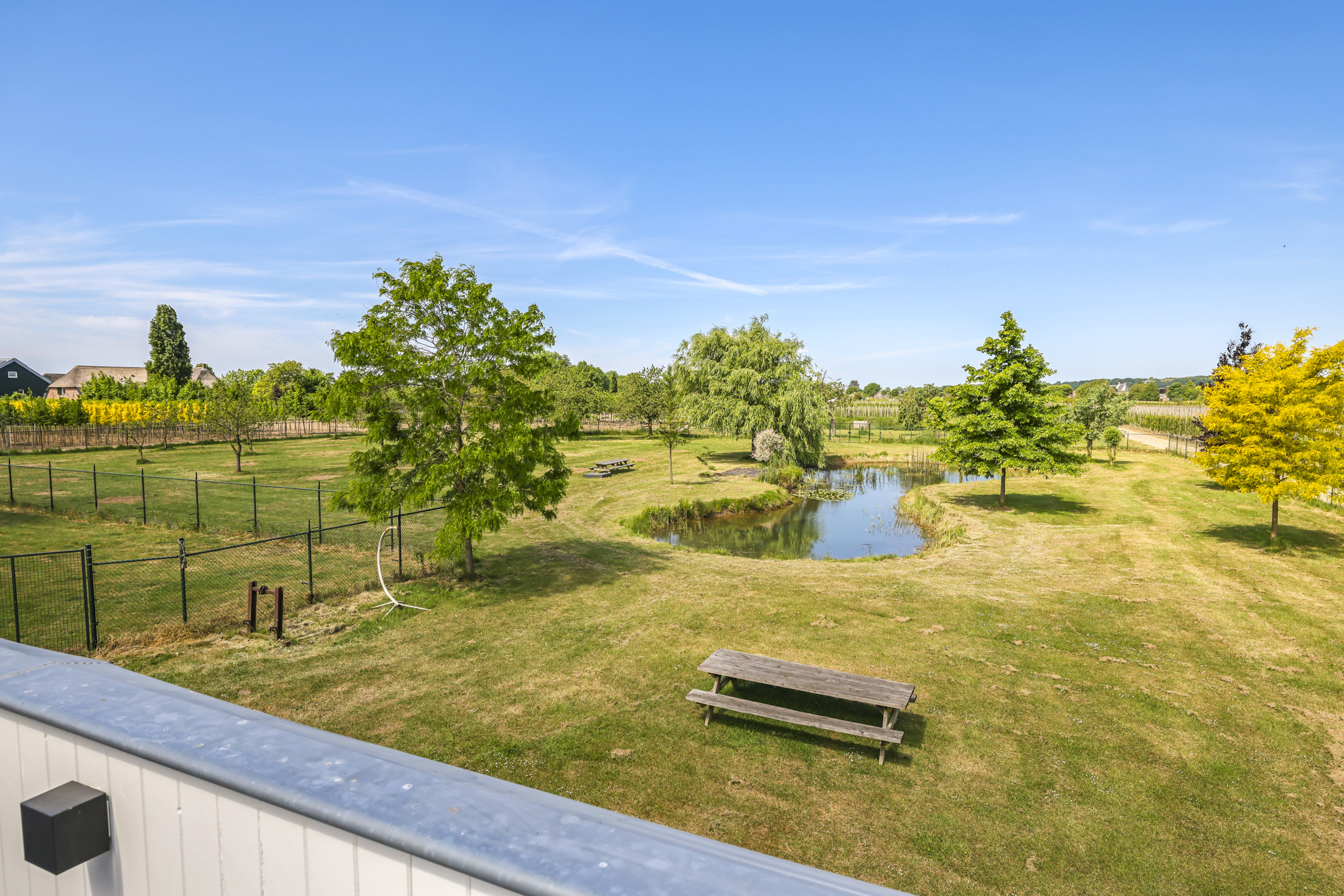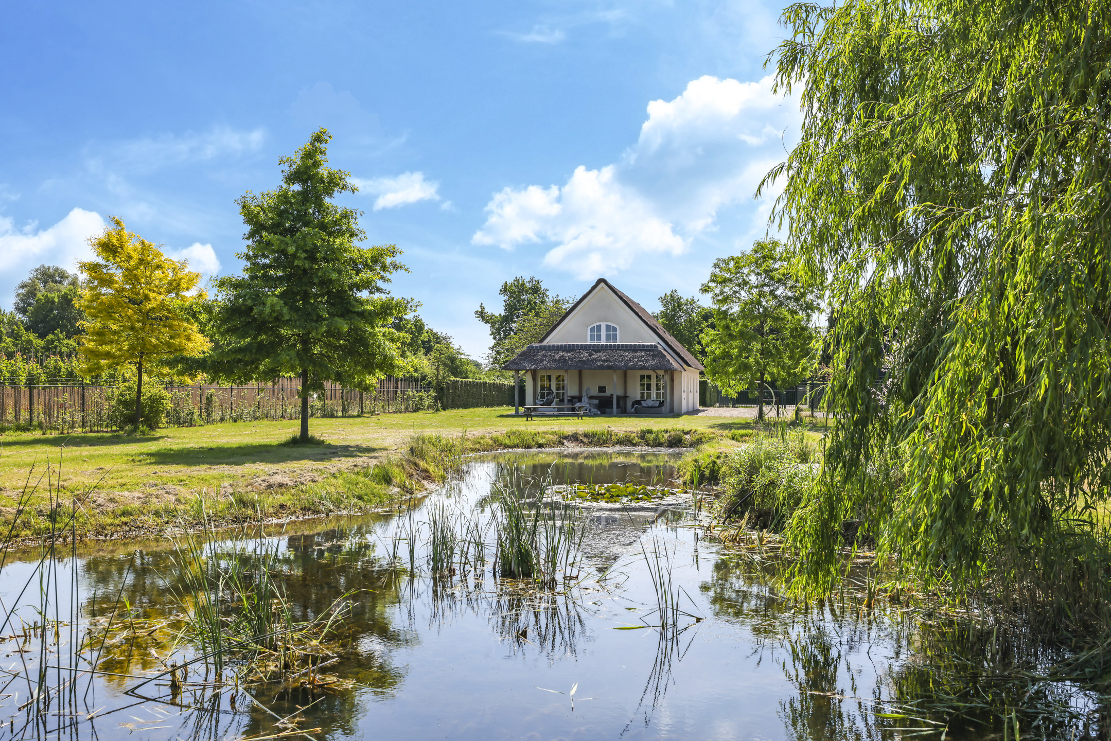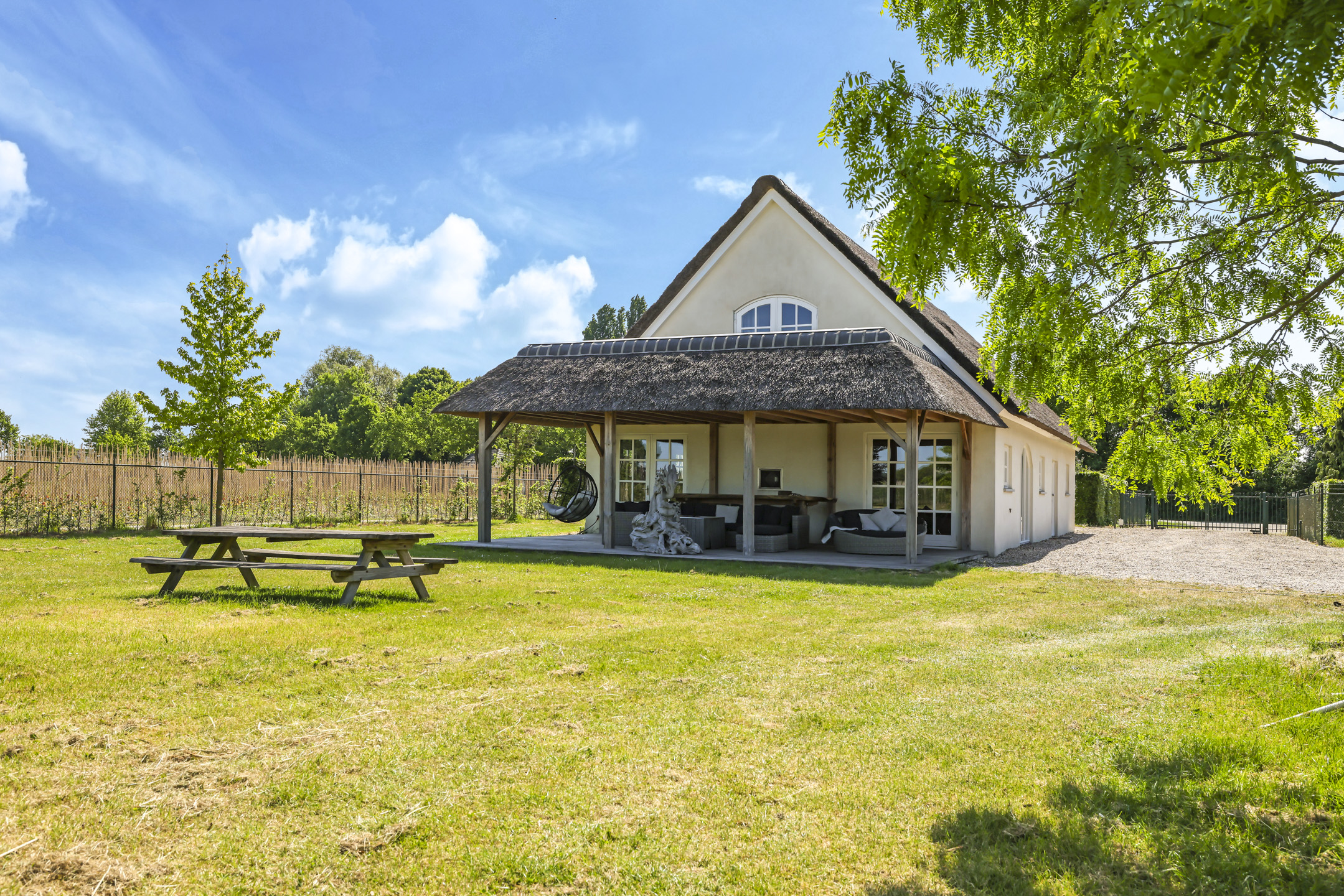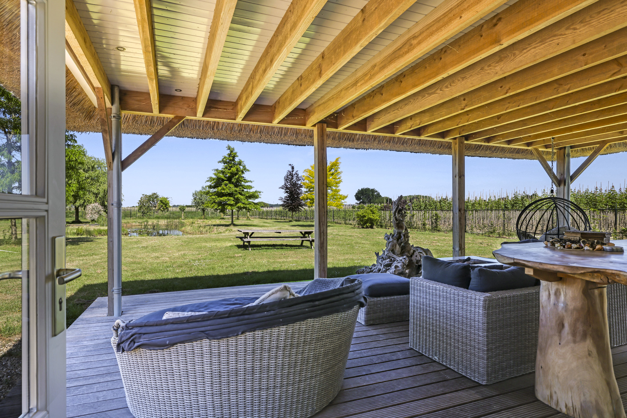 Ben je op zoek naar meer buitenleven, dan zal deze tuin je zeker aanspreken. Aan alle zijden van de woning geniet van je van veel vrijheid en daarmee ook veel privacy. In het midden van de tuin is een grote vijver geplaatst welke zorgt voor veen biodiversiteit in de tuin. Verder in het grasveld tref je verschillende bomen waaronder ook kersenbomen. Direct aan de woning is een veranda van ca. 40m² geplaatst waar je heerlijk kan genieten van het vrije zicht over het erf. Zie jij jezelf hier ’s ochtends al een kopje koffie drinken?