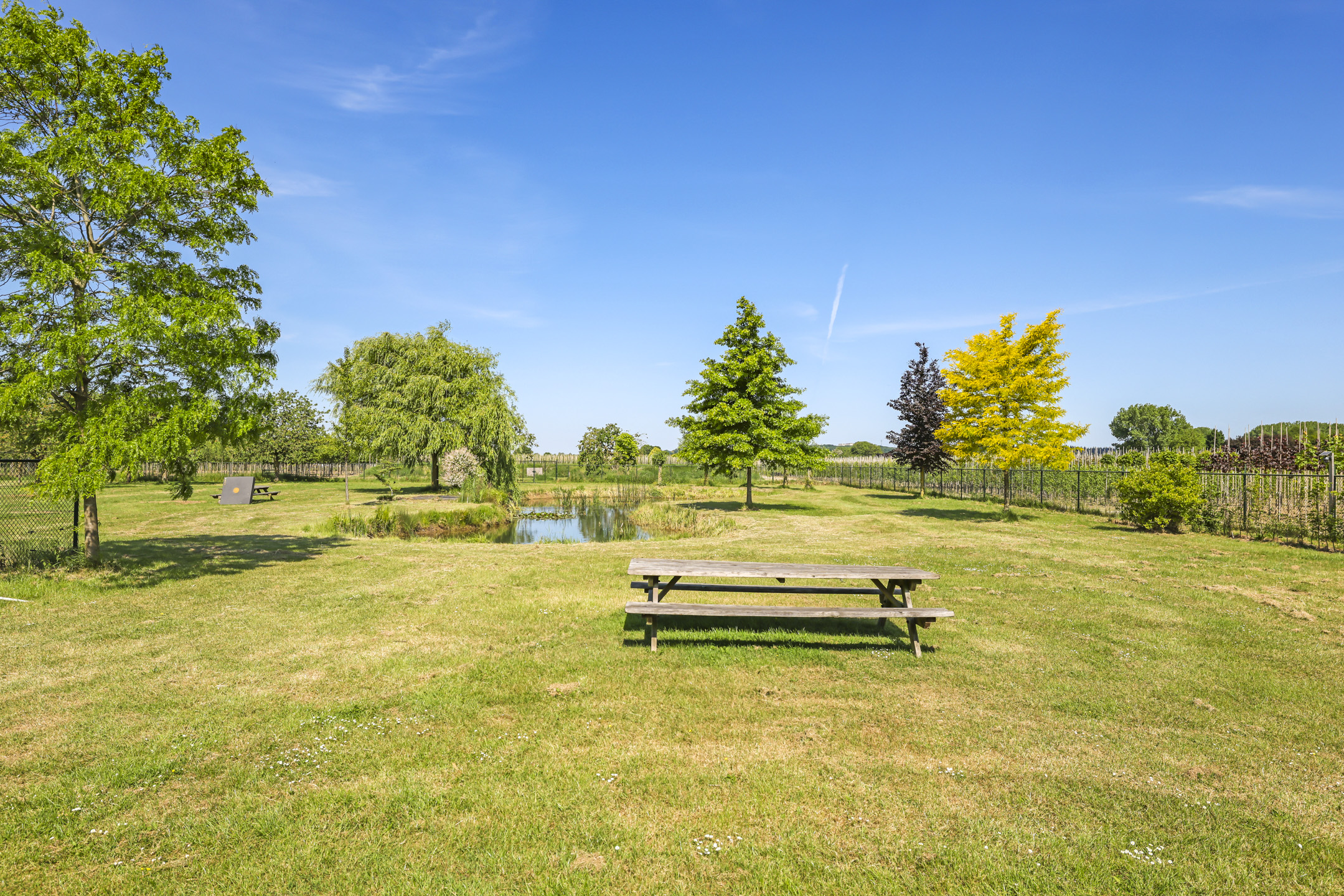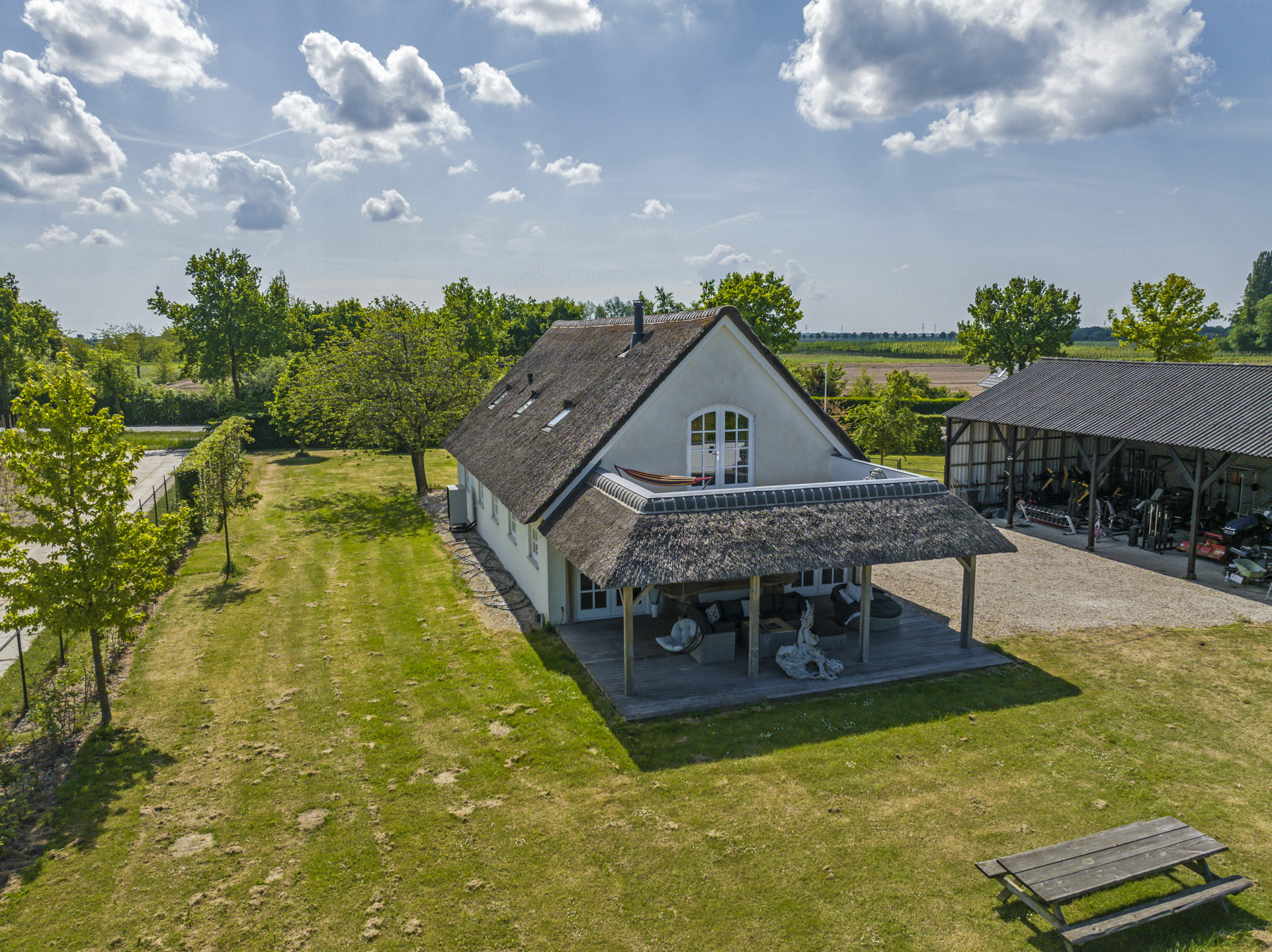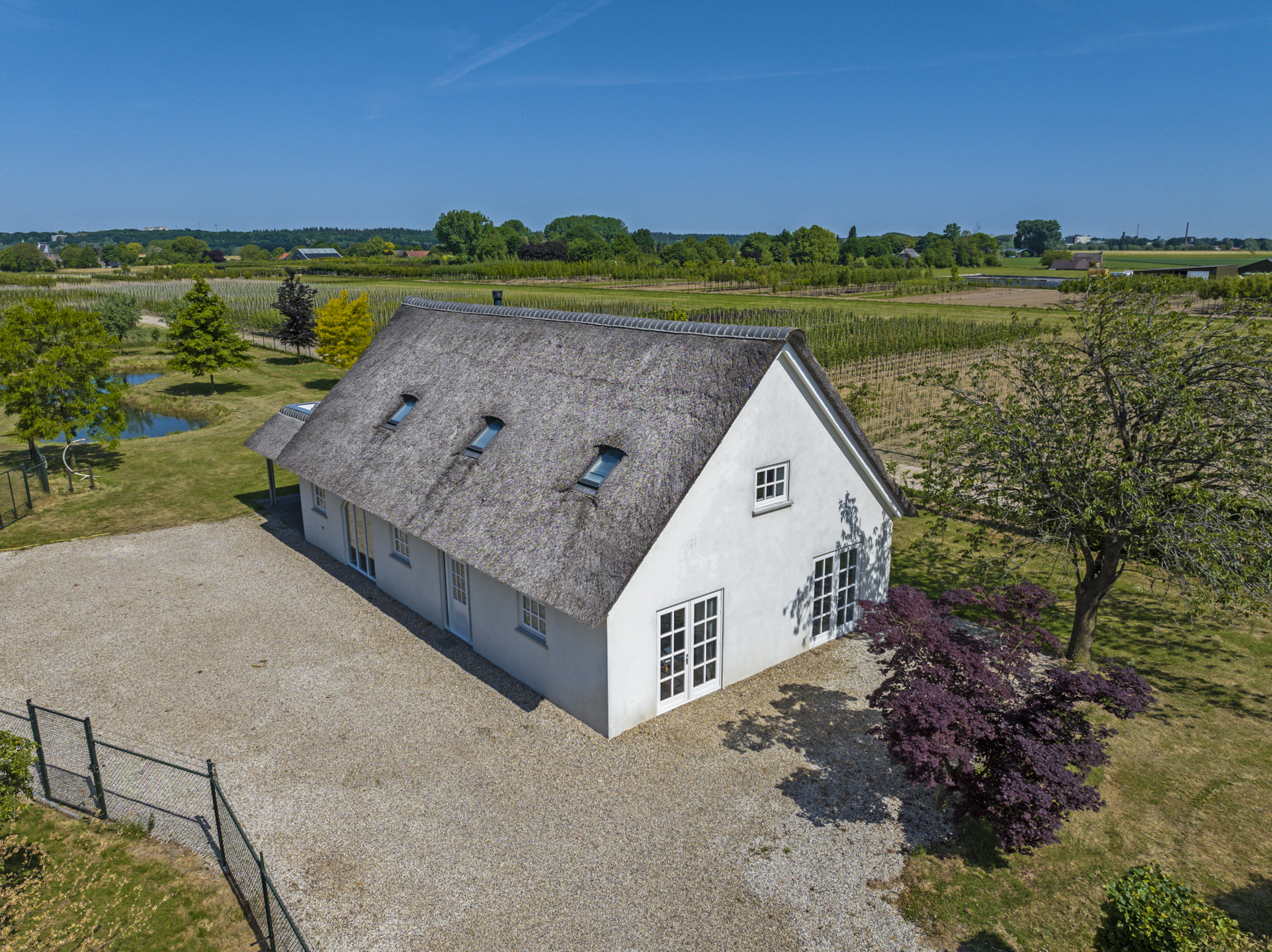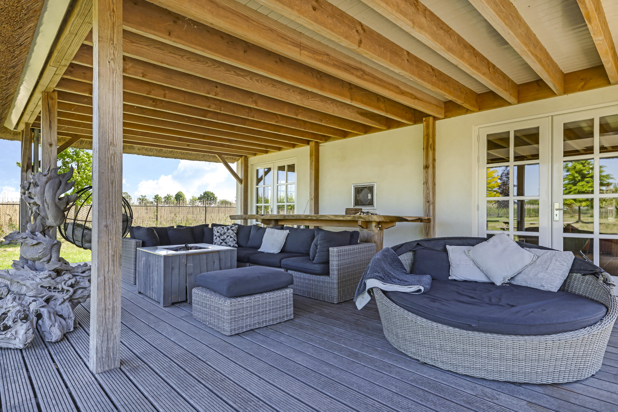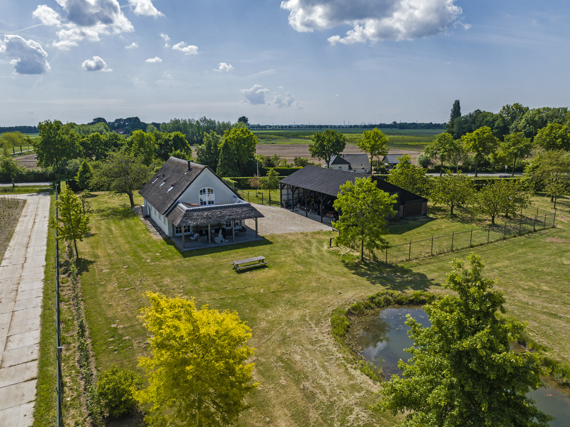 Ben je op zoek naar meer buitenleven, dan zal deze tuin je zeker aanspreken. Aan alle zijden van de woning geniet van je van veel vrijheid en daarmee ook veel privacy. In het midden van de tuin is een grote vijver geplaatst welke zorgt voor veen biodiversiteit in de tuin. Verder in het grasveld tref je verschillende bomen waaronder ook kersenbomen. Direct aan de woning is een veranda van ca. 40m² geplaatst waar je heerlijk kan genieten van het vrije zicht over het erf. Zie jij jezelf hier ’s ochtends al een kopje koffie drinken?
